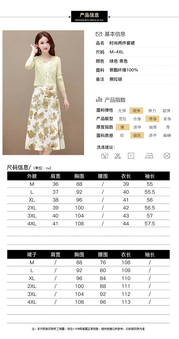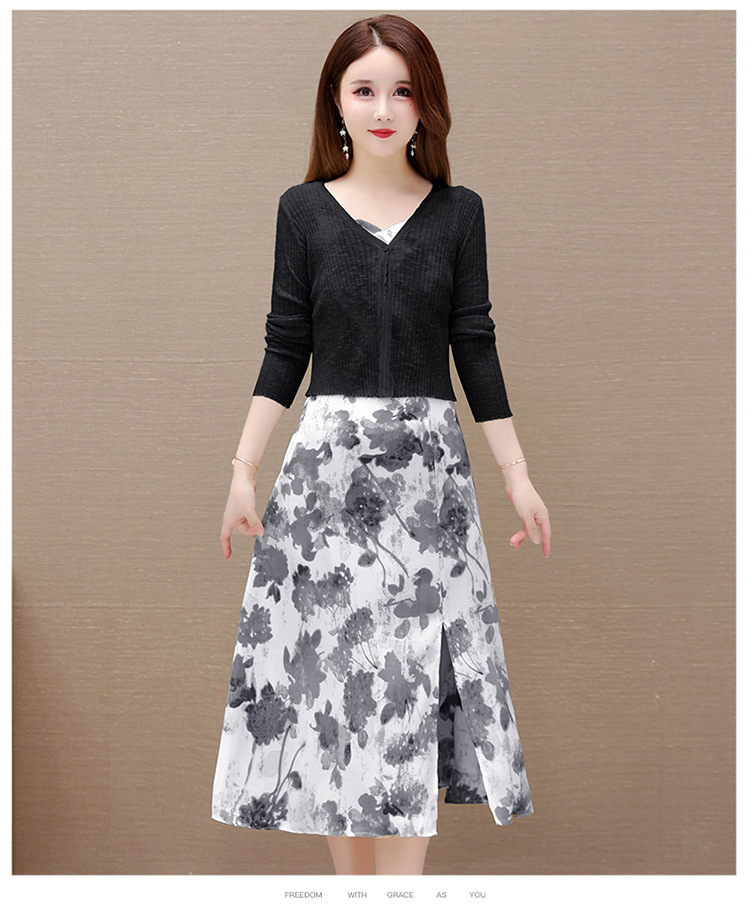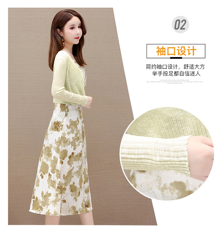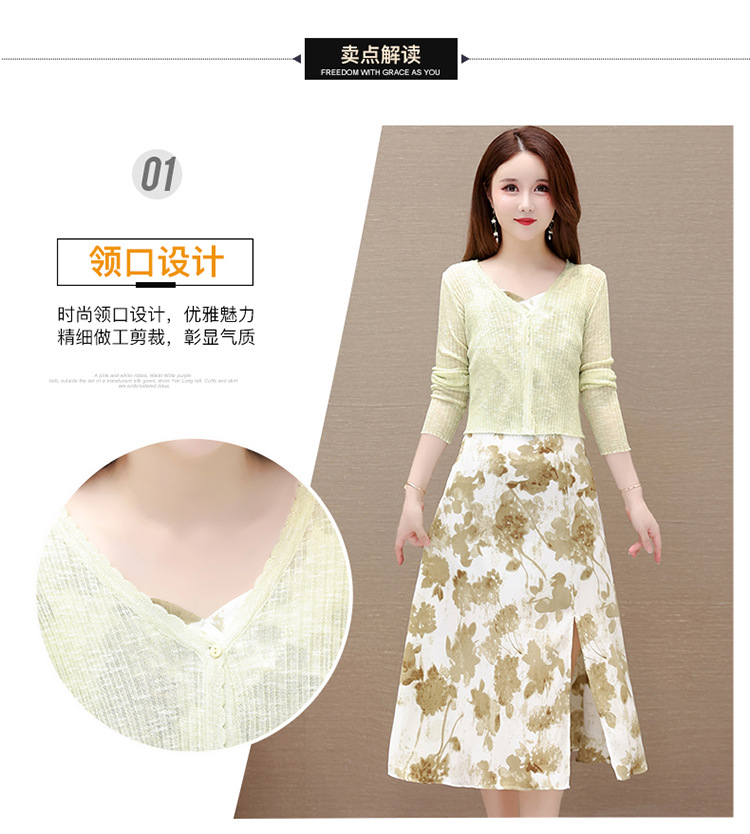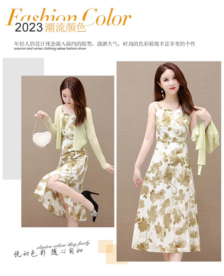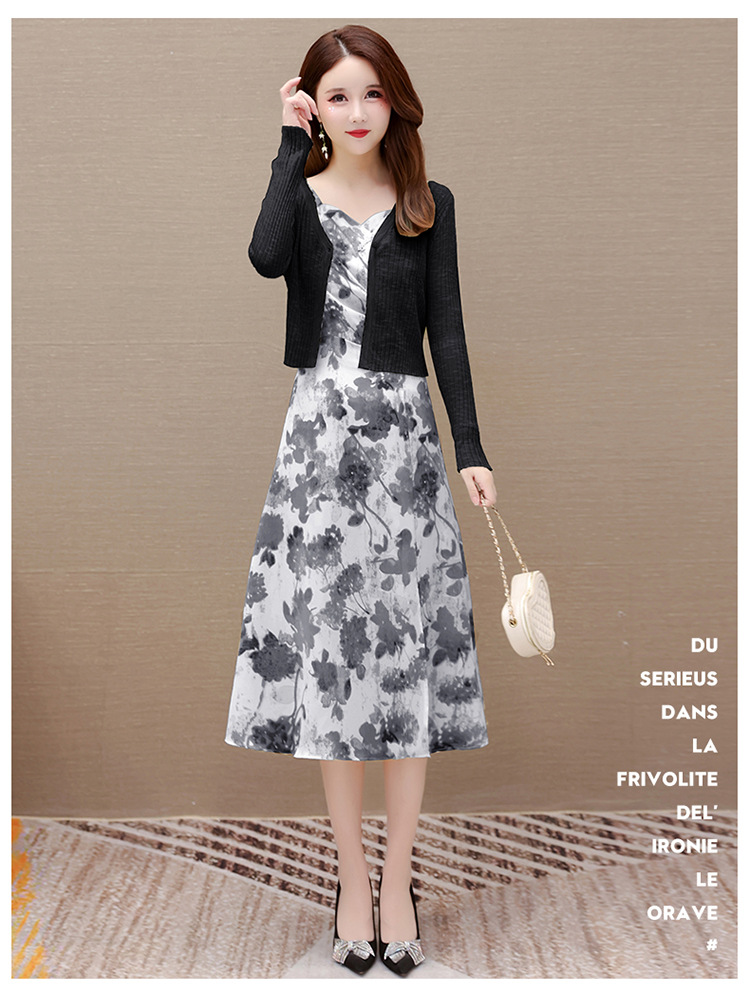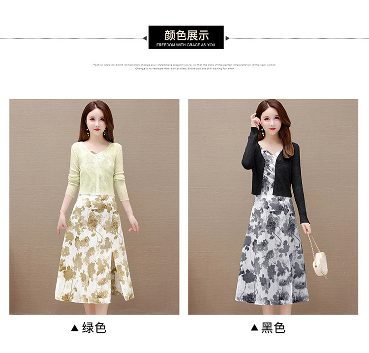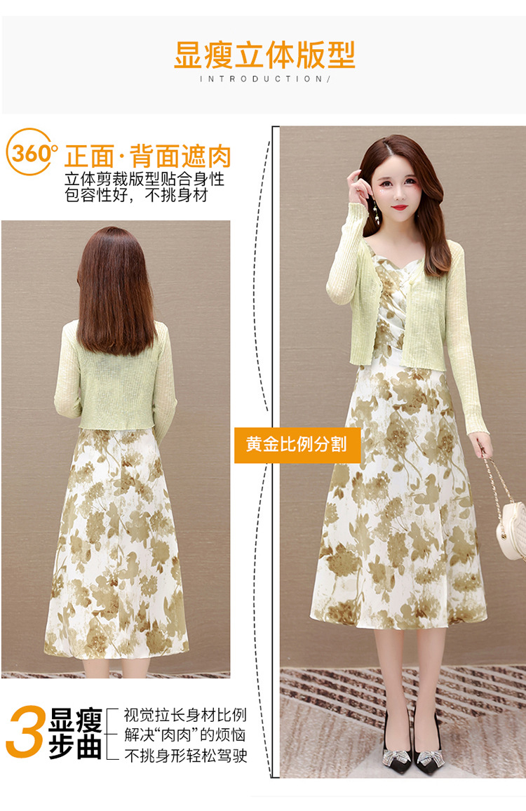 简约时尚,秋款印花中长款雪纺连衣裙长袖轻薄外套两件套QYM-FL-F23B07-L
