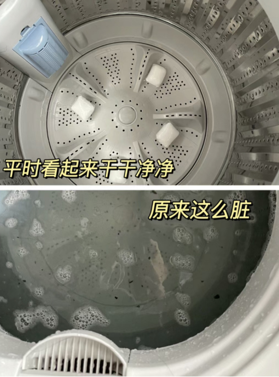 长时间不清洗的洗衣机真的比马桶都脏🙃 一打开筒内就一股异味🤮 还有一些小霉点 那污渍都快包浆了😬 本洁癖患者看到真的要发出暴鸣了 - 得亏我早早在网上入手了这个洗衣机清洁泡腾片 它是祛污除味➕抑菌清洁 四合一的清洁片 成分还很温和不用担心损坏机桶