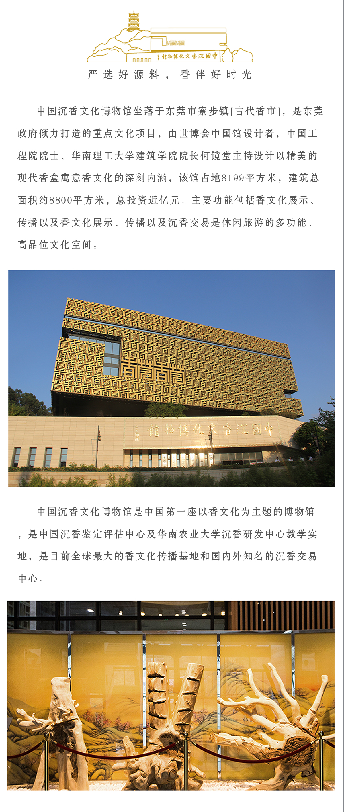 中国沉香文化博物馆坐落于古代[香市]东莞市寮步镇,是东莞政府倾力打造的重点文化项目,由世博会中国馆设计者,中国工程院院士、华南理工大学建筑学院院长何镜堂主持设计,以精美的现代[香盒]寓意香文化的深刻内