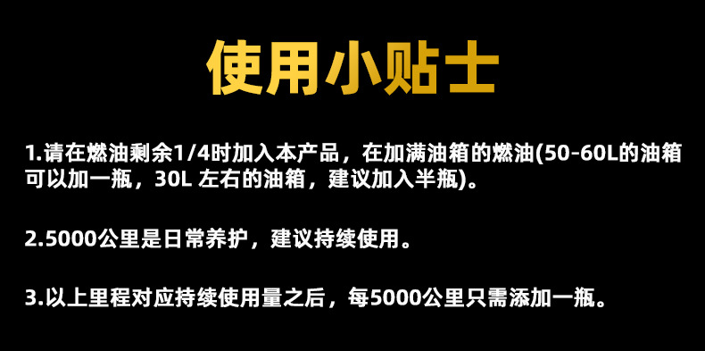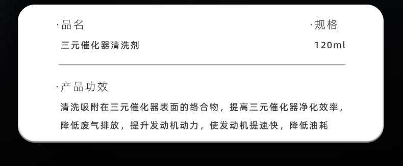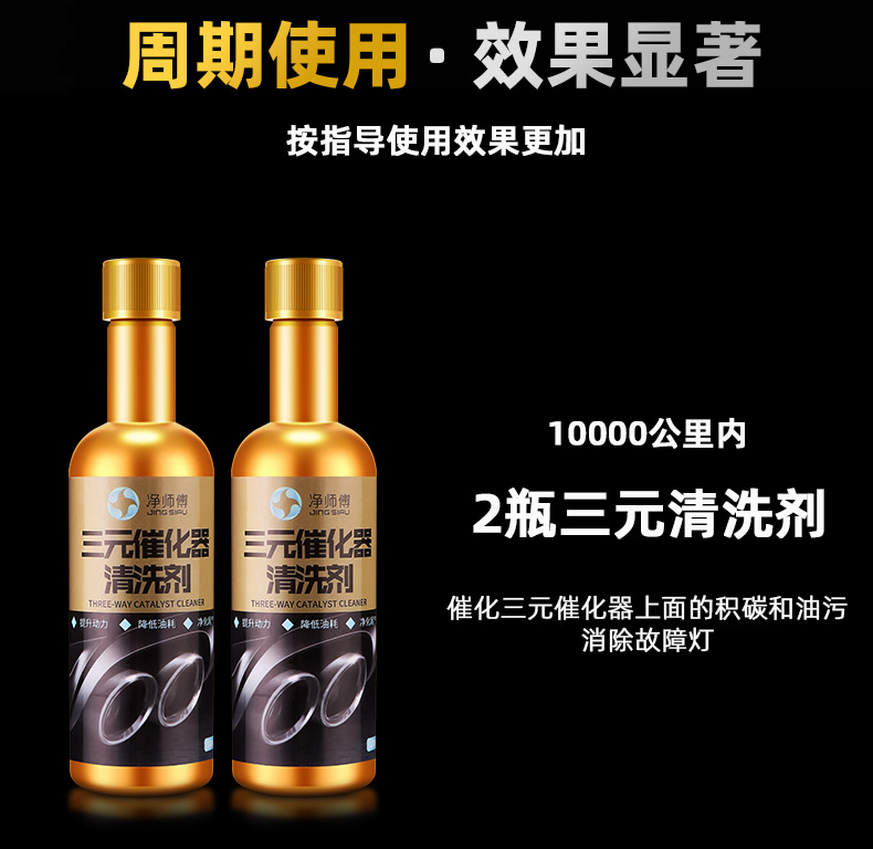 【使用方法】:1、启动发动机,待水温正常后熄灭引擎;2、将三元催化剂倒入专用设备内,将设备输出接头与真空管连接;3、启动发动机,将转速控制在2000转左右,打开流量控制阀,将本品缓慢滴入进气道。清洗时间约30~40分钟;4、清洗完毕后保持发动机转速35分钟,以排出残液。