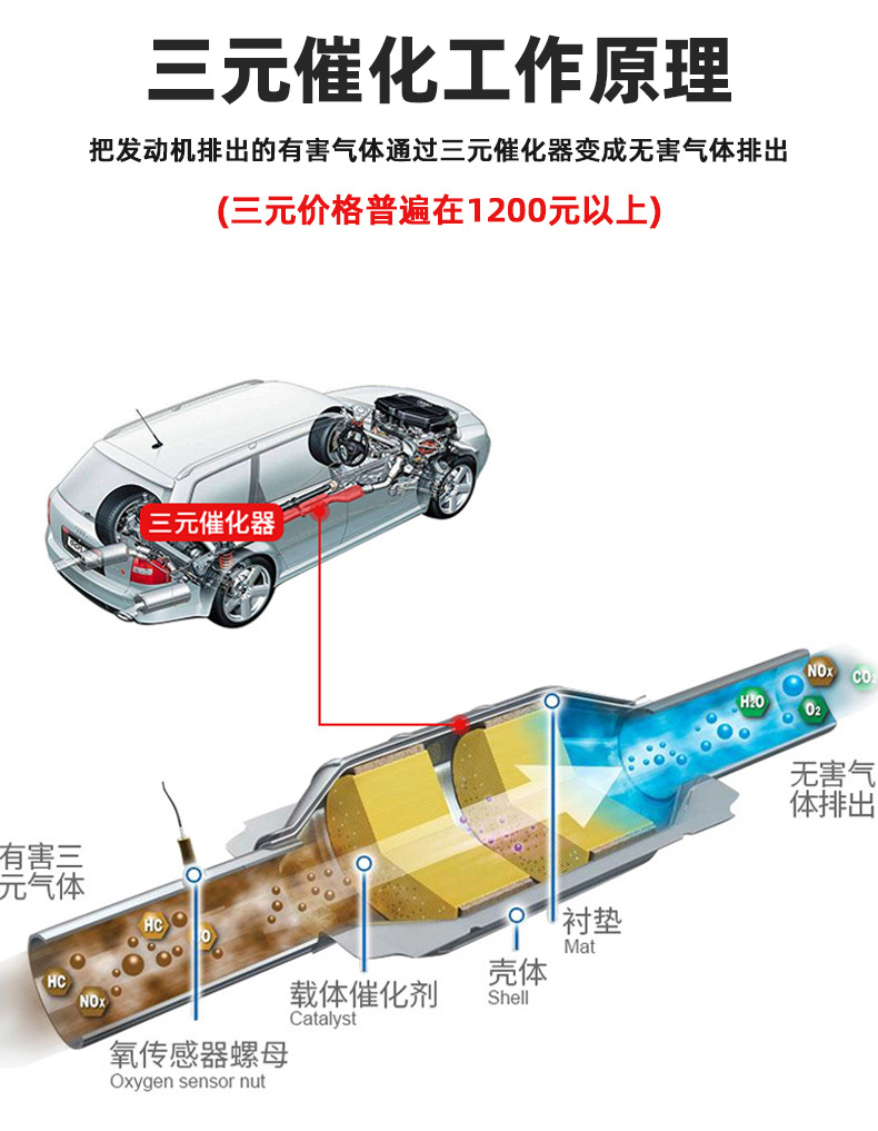 【产品用途】:三元催化剂是用来净化尾气的,三元催化剂可以降低尾气中的污染物质,三元催化剂对保护地球是有好处的, 每辆汽车的排气管上都会安装三元催化剂。三元催化剂是安装在排气管头段的,这个部件对于汽车来说比较重要。