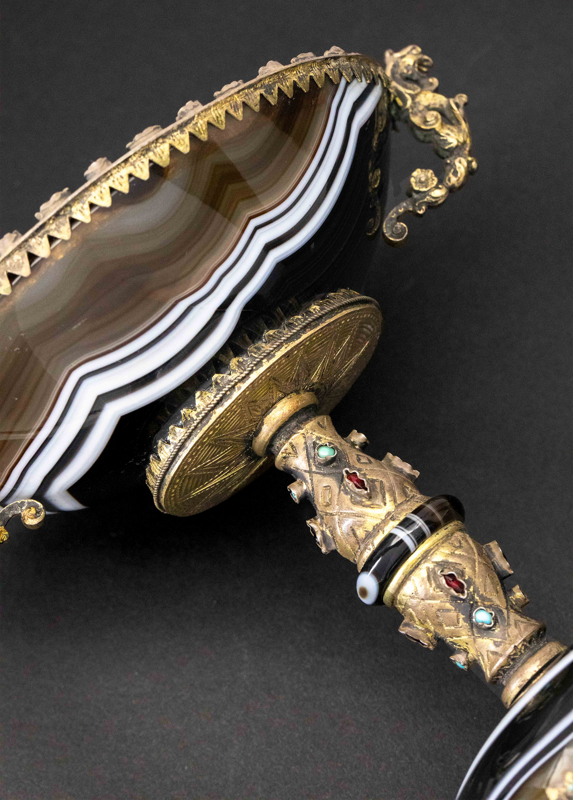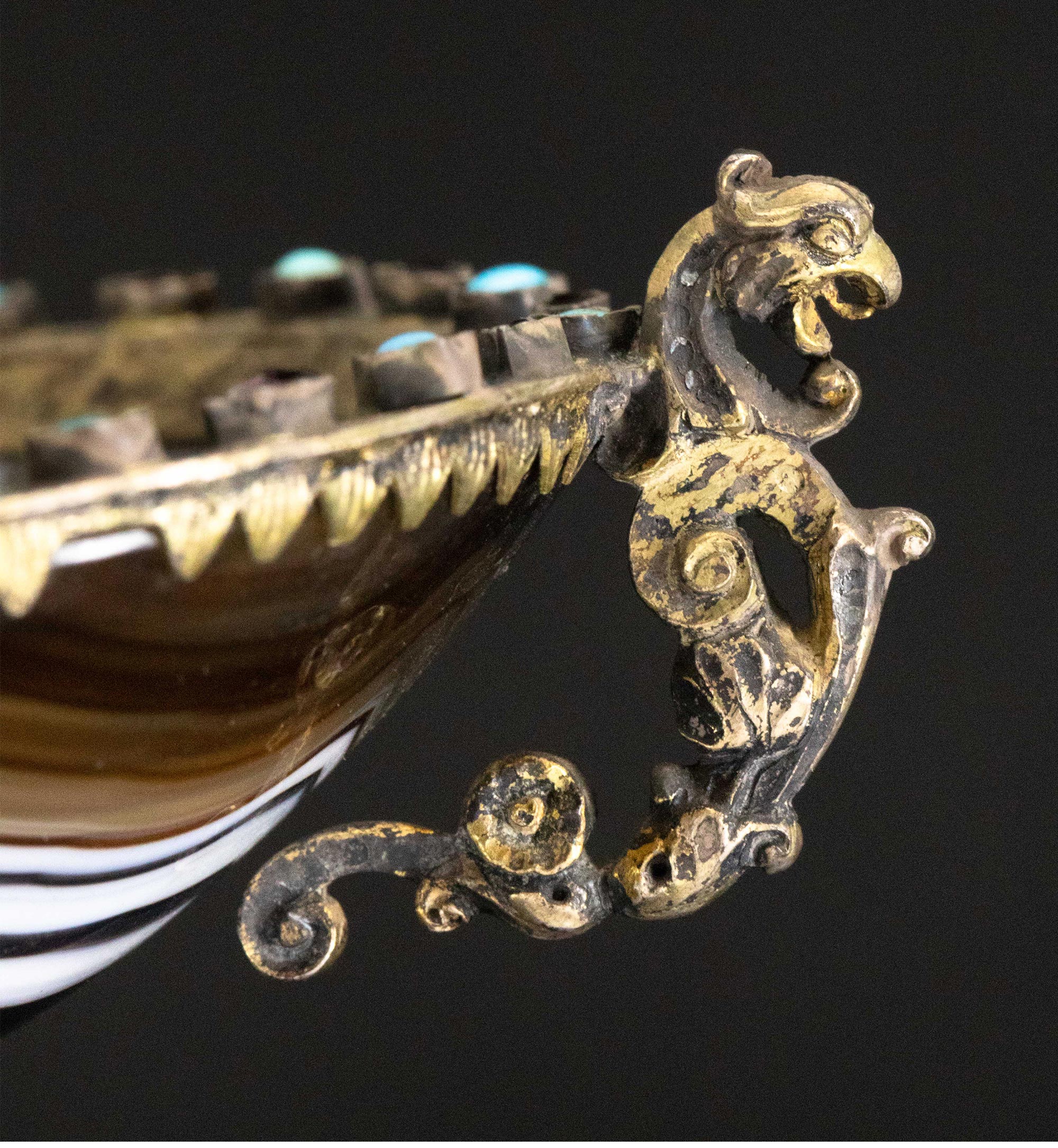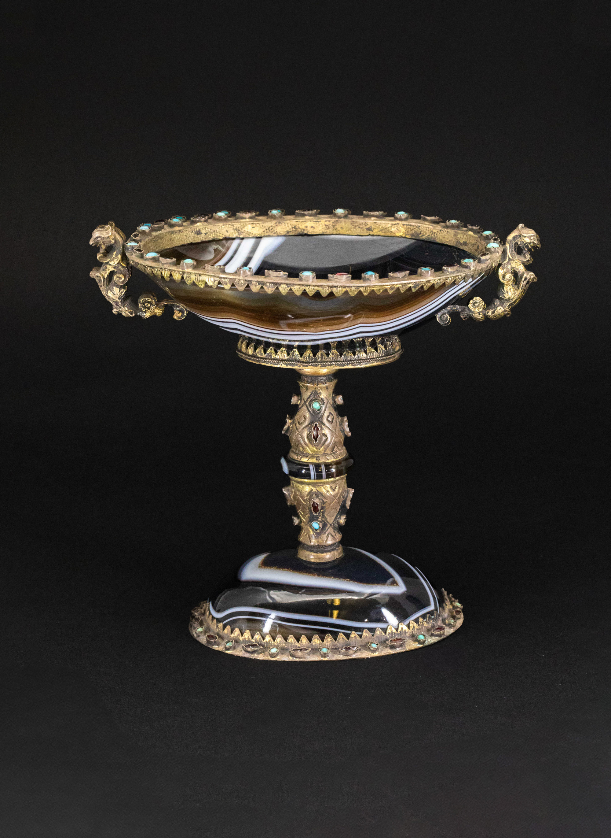 19世纪末欧洲出品新文艺复兴风格铜鎏金精雕装饰玛瑙嵌绿松石及红宝石双耳高足杯