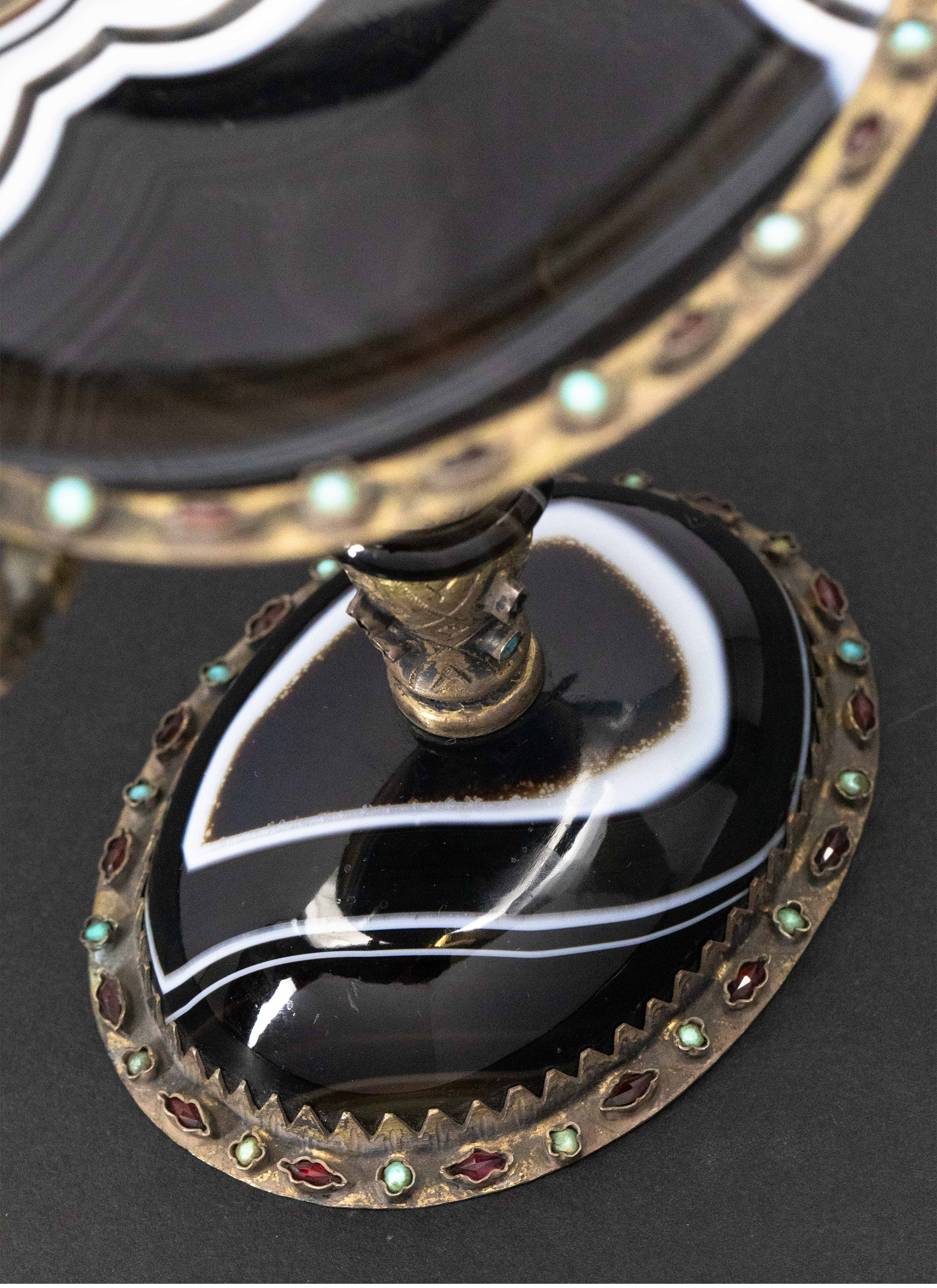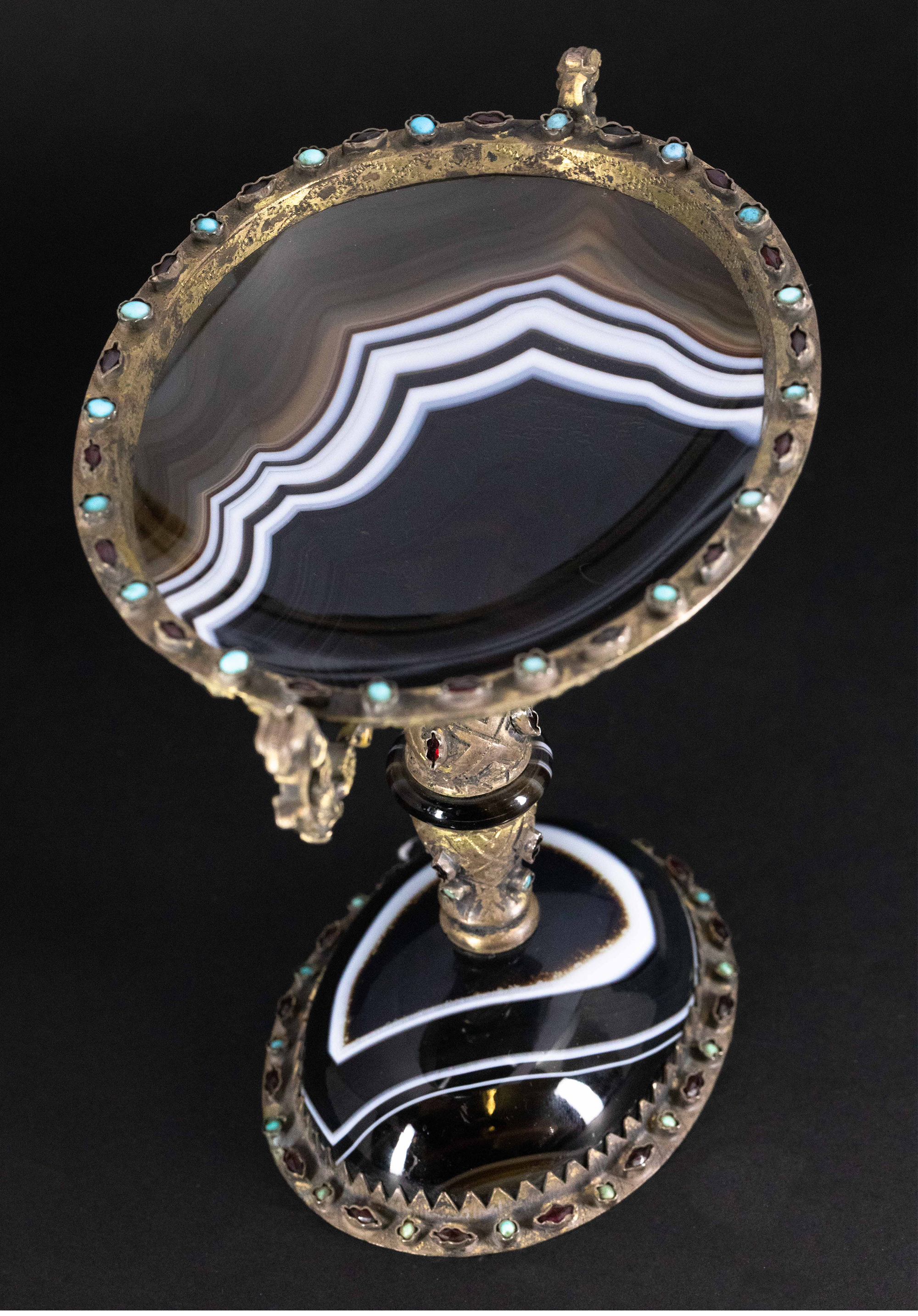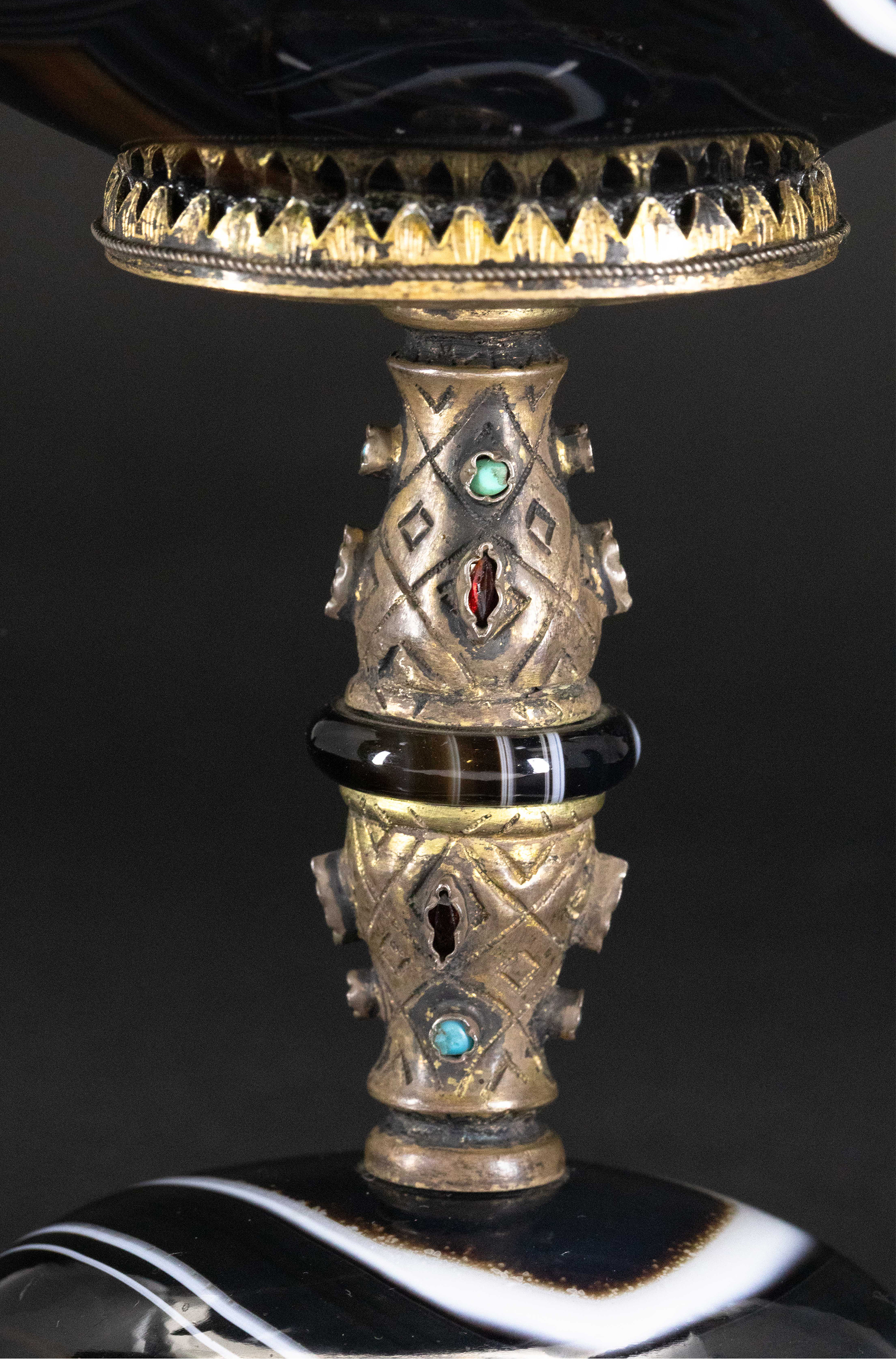 19世纪末欧洲出品新文艺复兴风格铜鎏金精雕装饰玛瑙嵌绿松石及红宝石双耳高足杯