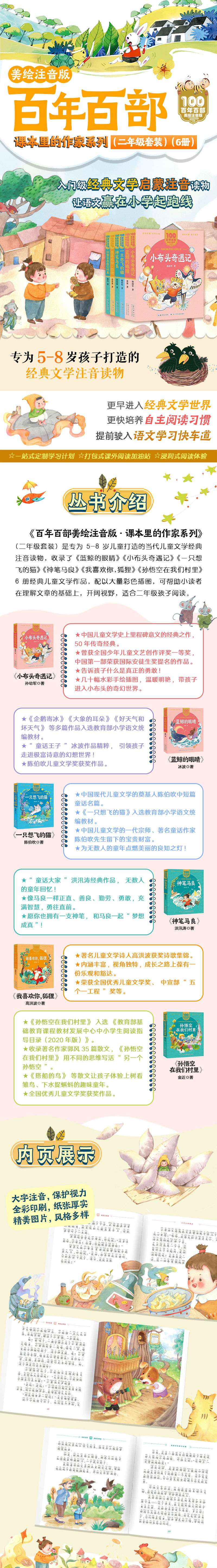 本套系是《百年百部美绘注音版》入选小学语文统编教材的作品合集,包括《蓝鲸的眼睛》《小布头奇遇记》《一只想飞的猫》《神笔马良》《我喜欢你,狐狸》《孙悟空在我们村里》6册经典儿童文学作品。本套系是二年级系列,阅读这些作品,可以帮助小读者在理解课文的基础上,开阔视野。本系列是注音版,配以大量彩色插图,适合6-8岁儿童阅读。