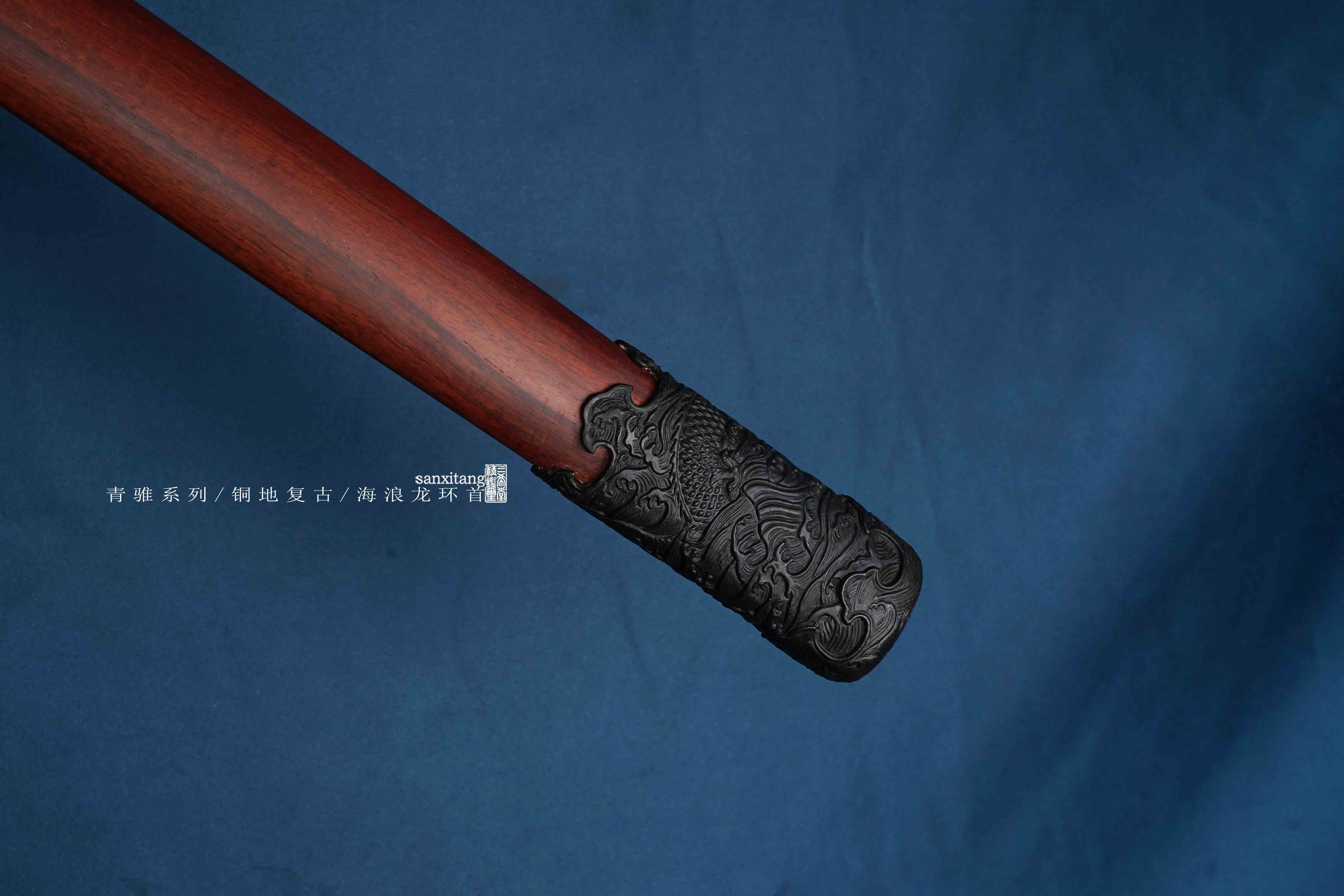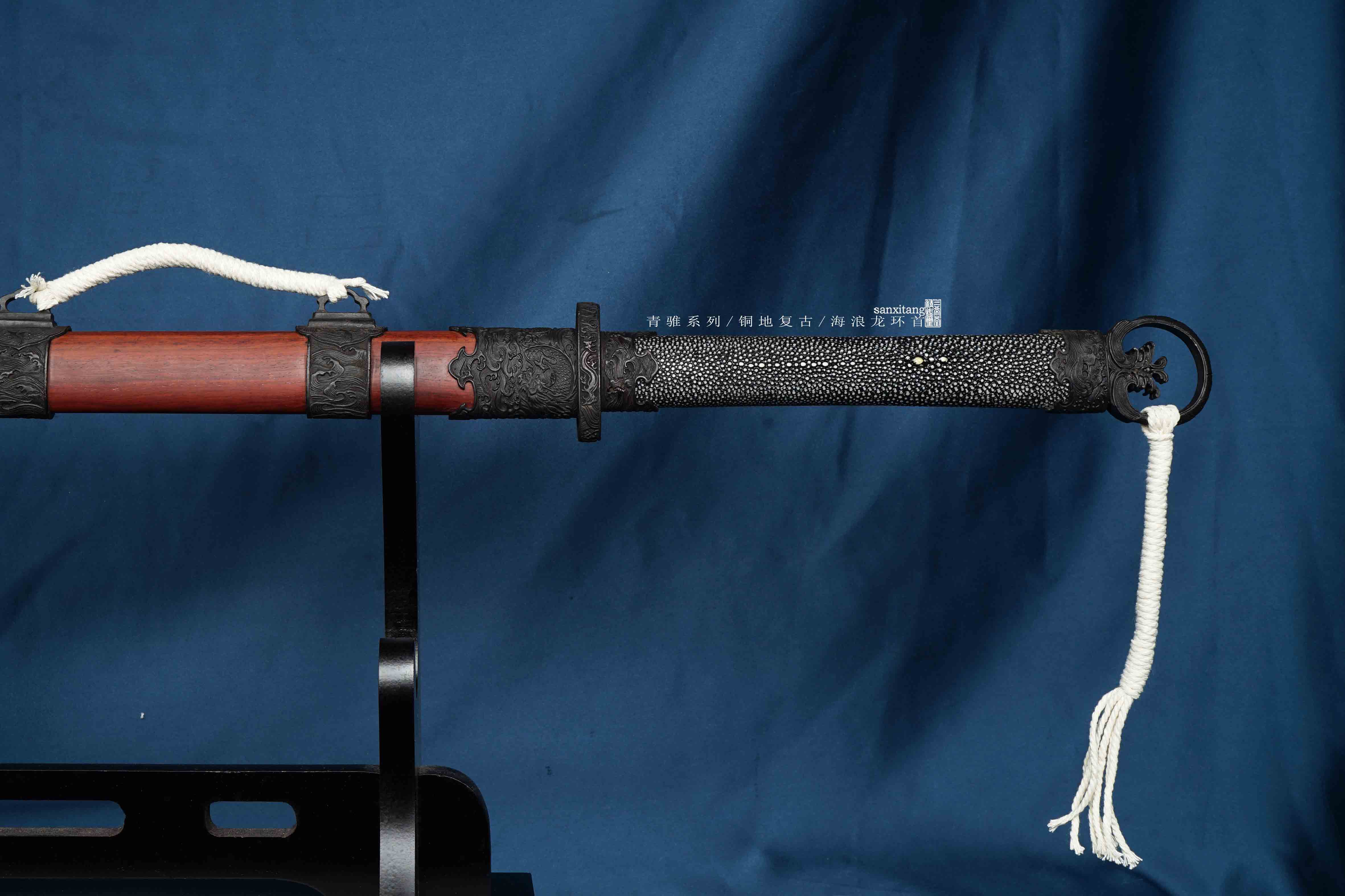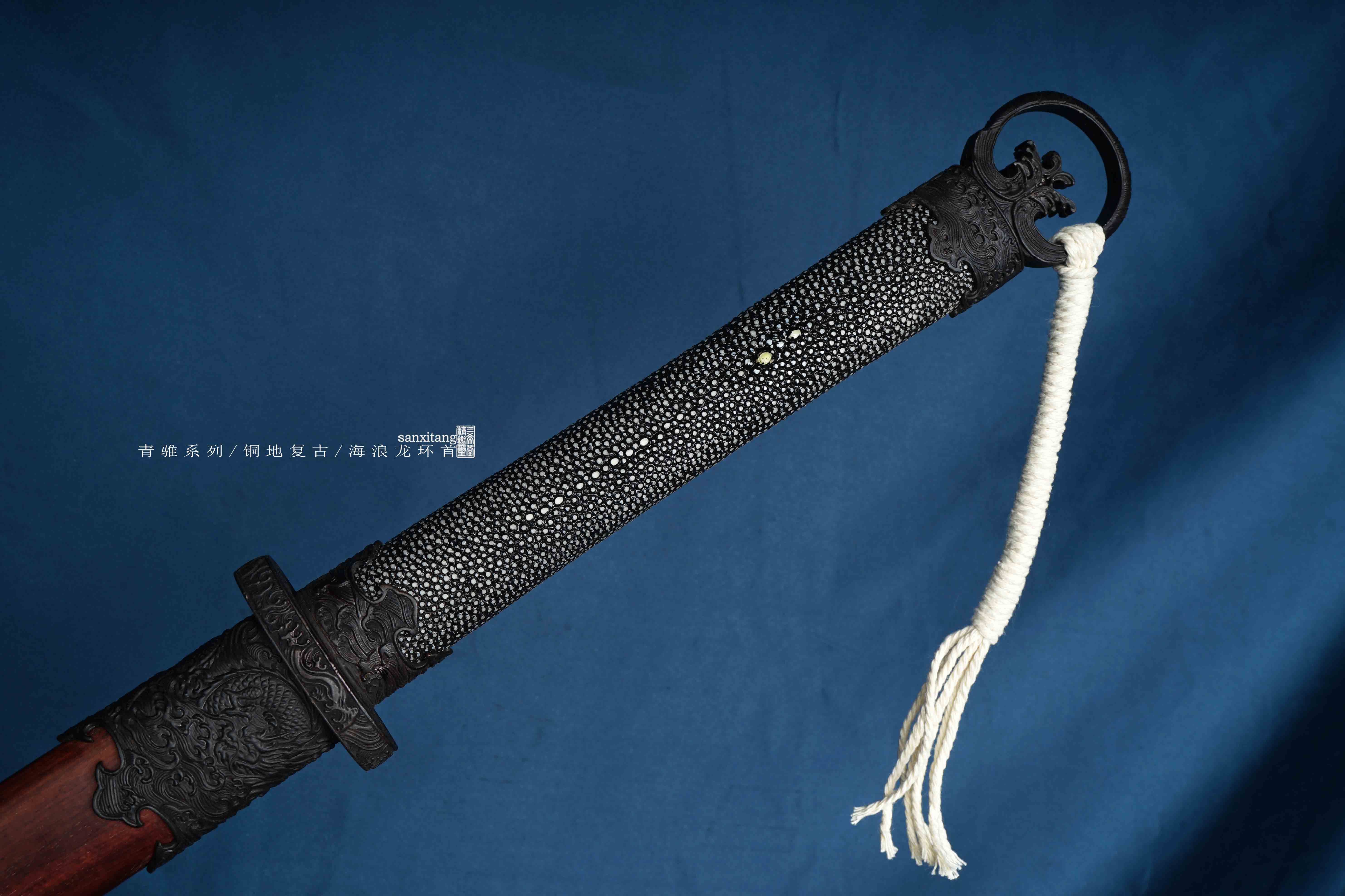 暗黑版海龙冰裂环首,柔顺冷艳的自然冰裂唐刀条,8节铜地暗黑复古海龙金具,酸枝鞘,鱼皮柄,高级感还可以