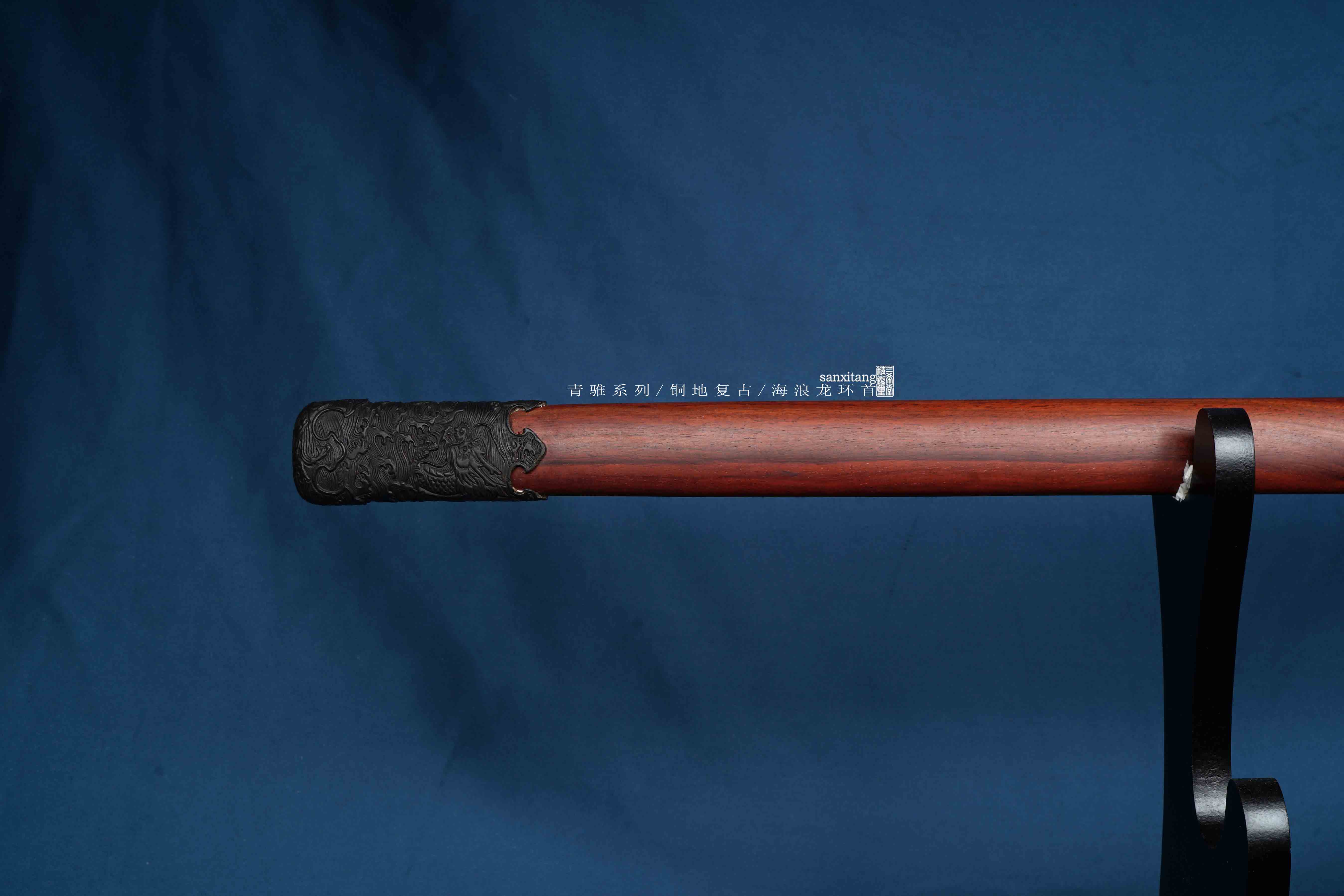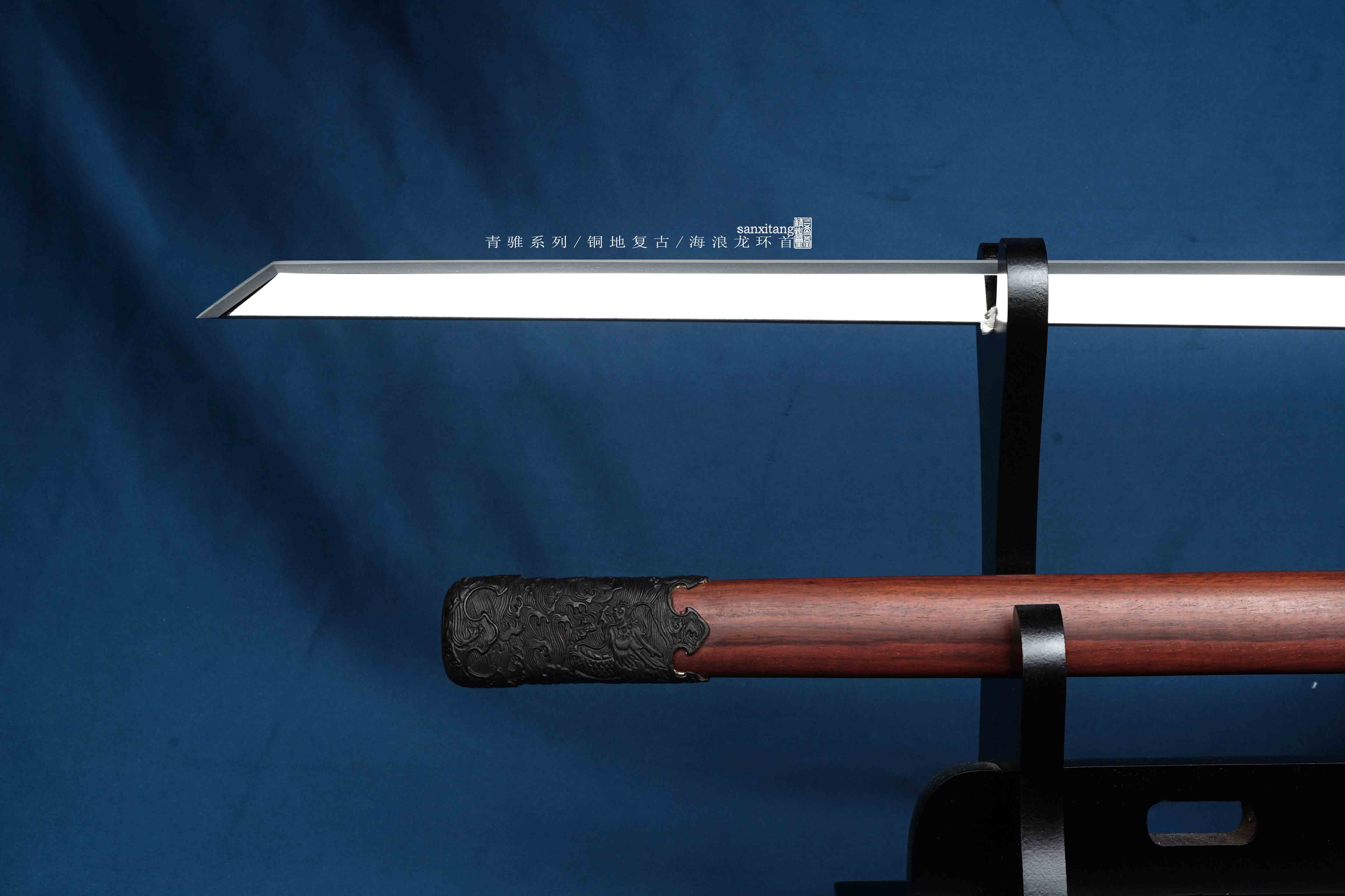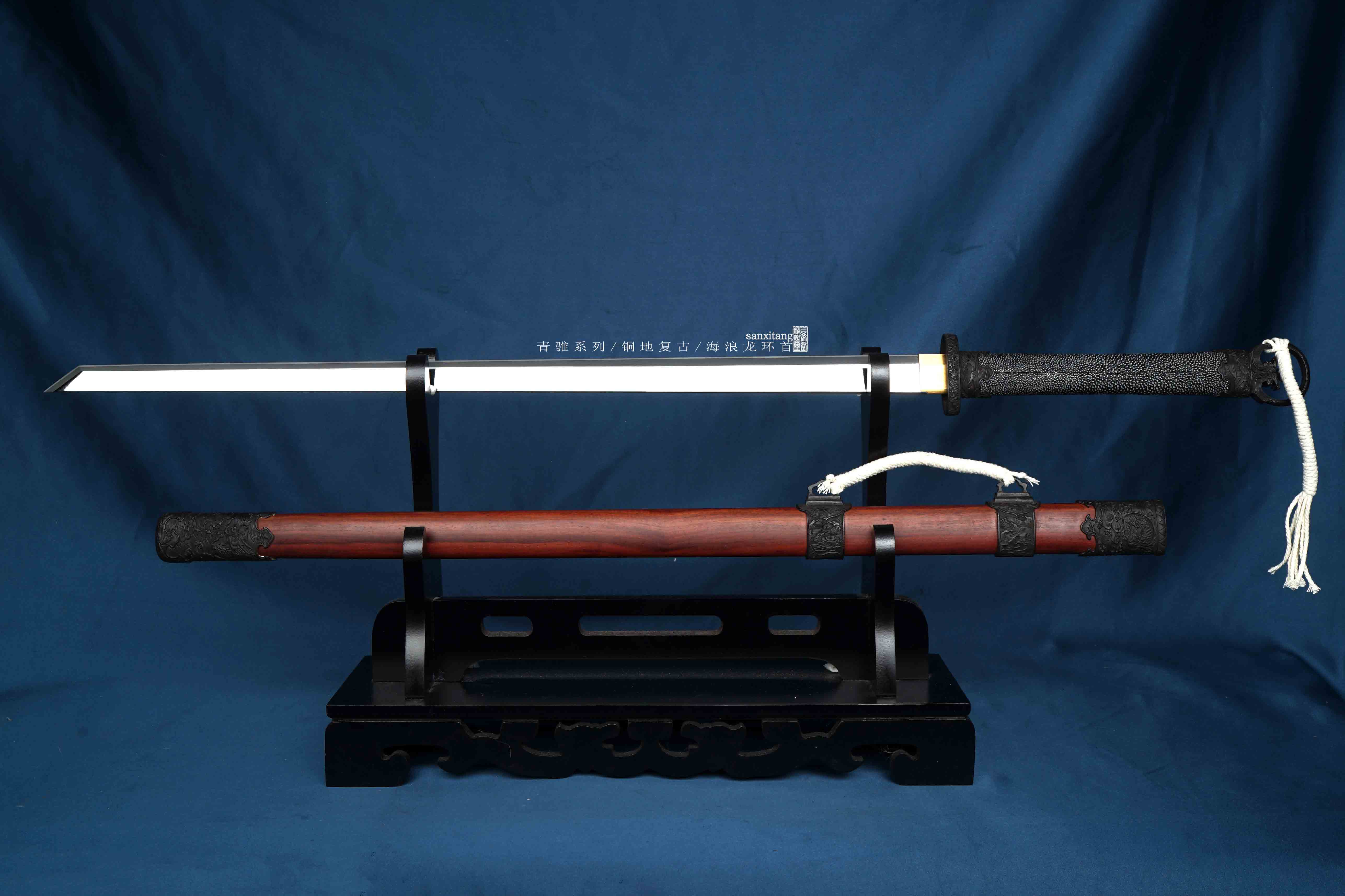 暗黑版海龙冰裂环首,柔顺冷艳的自然冰裂唐刀条,8节铜地暗黑复古海龙金具,酸枝鞘,鱼皮柄,高级感还可以