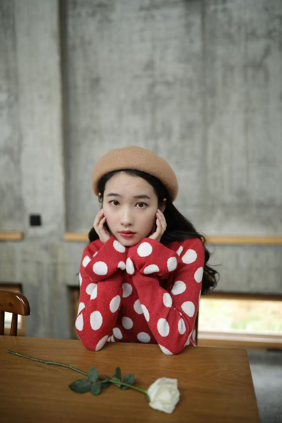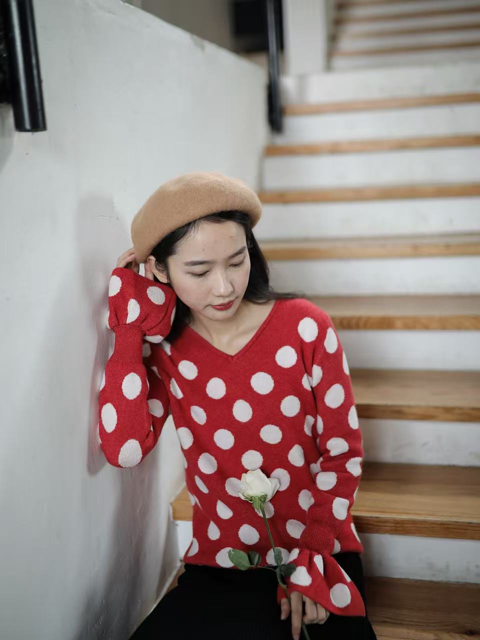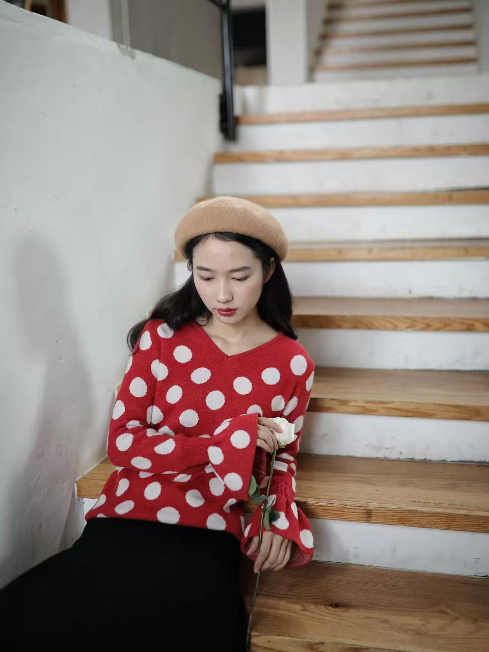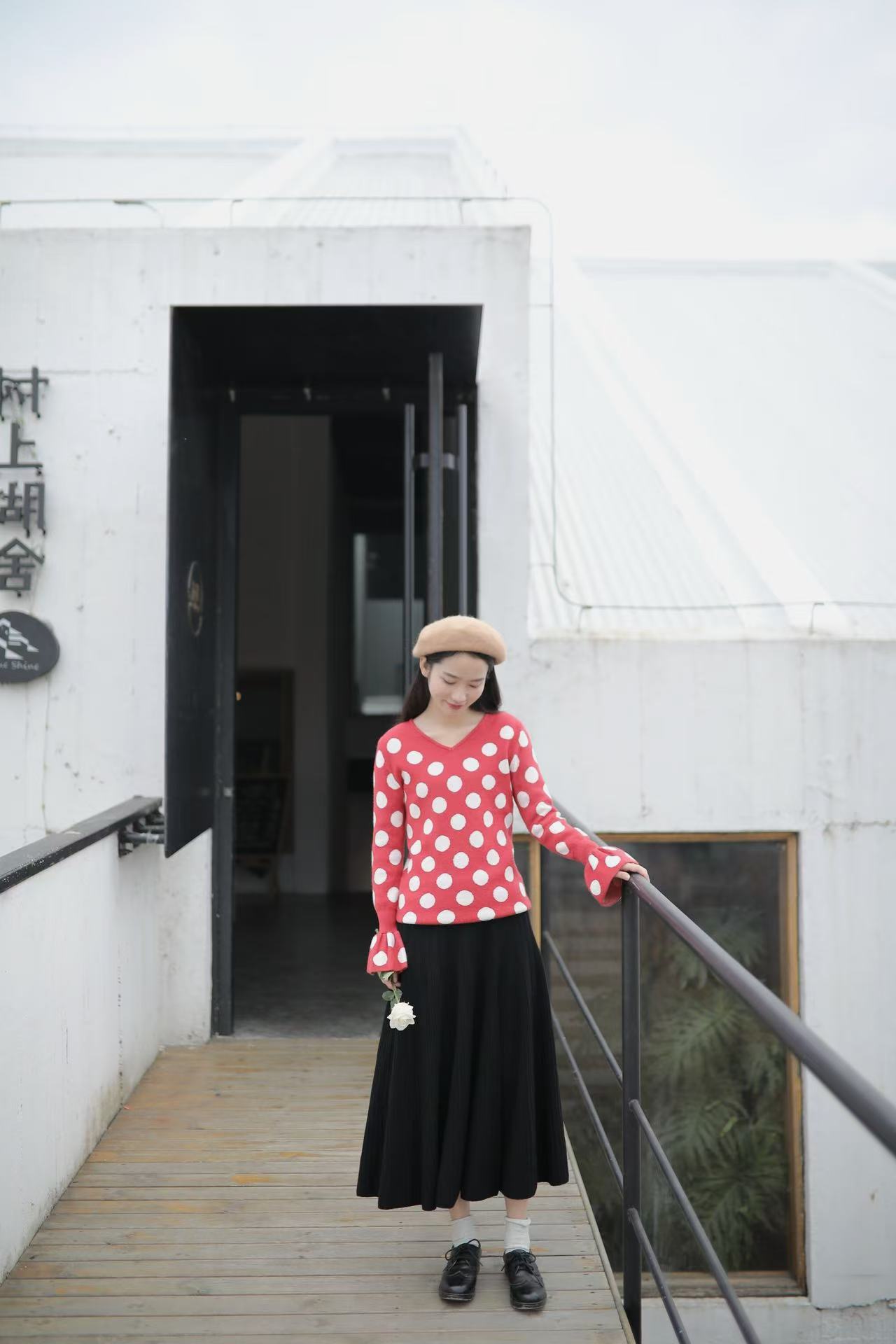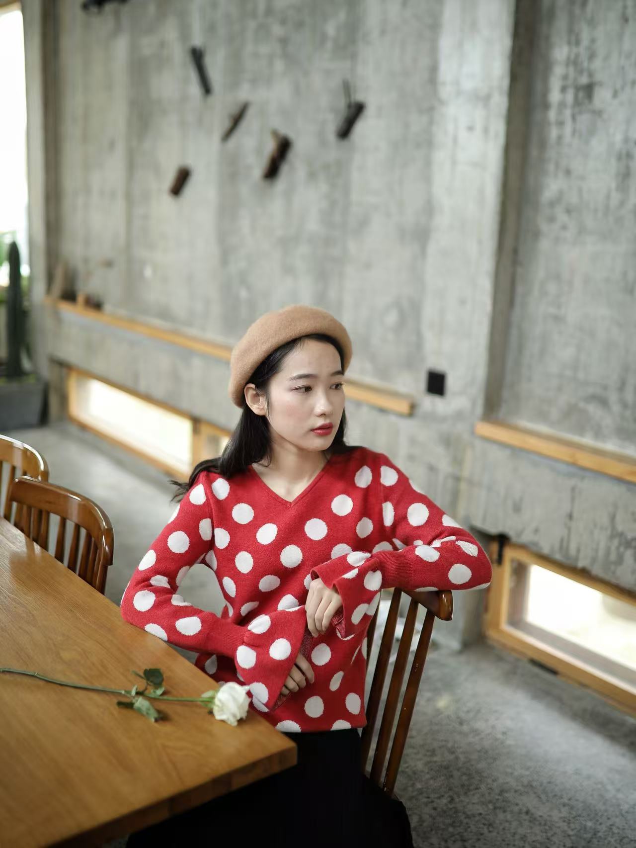 红色是复古红,不会艳丽,恰好是今年又流行的色系。织入纱线的波点提花,精致耐看。
