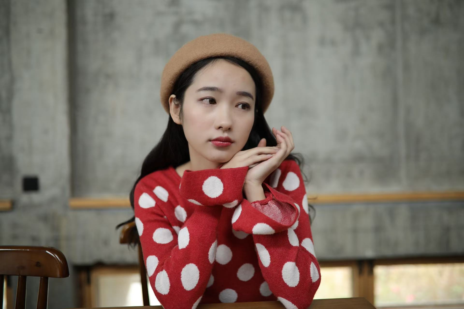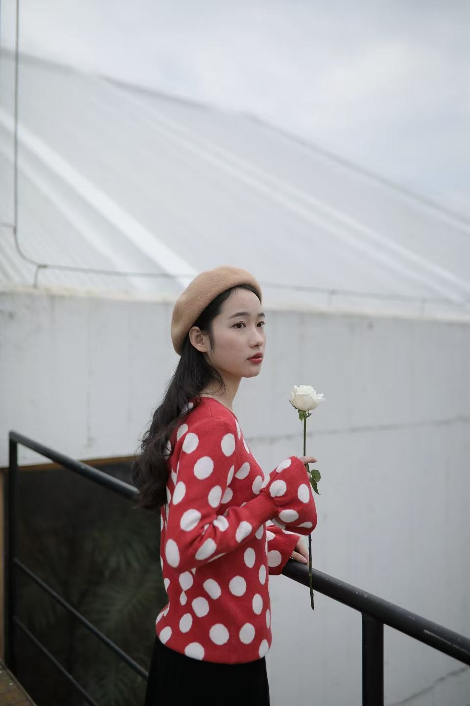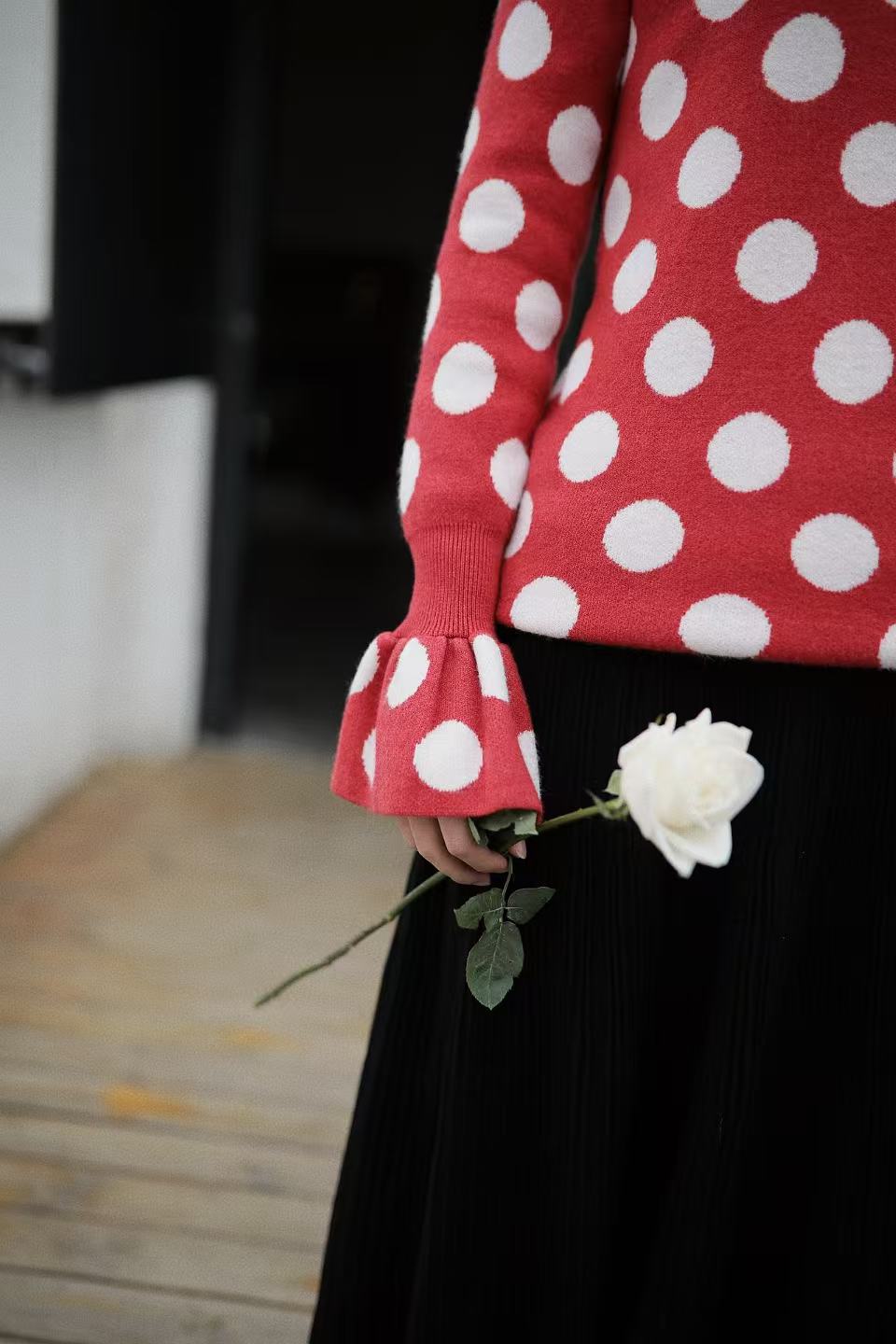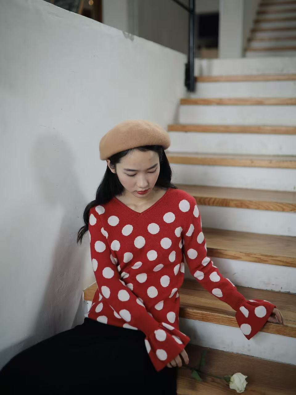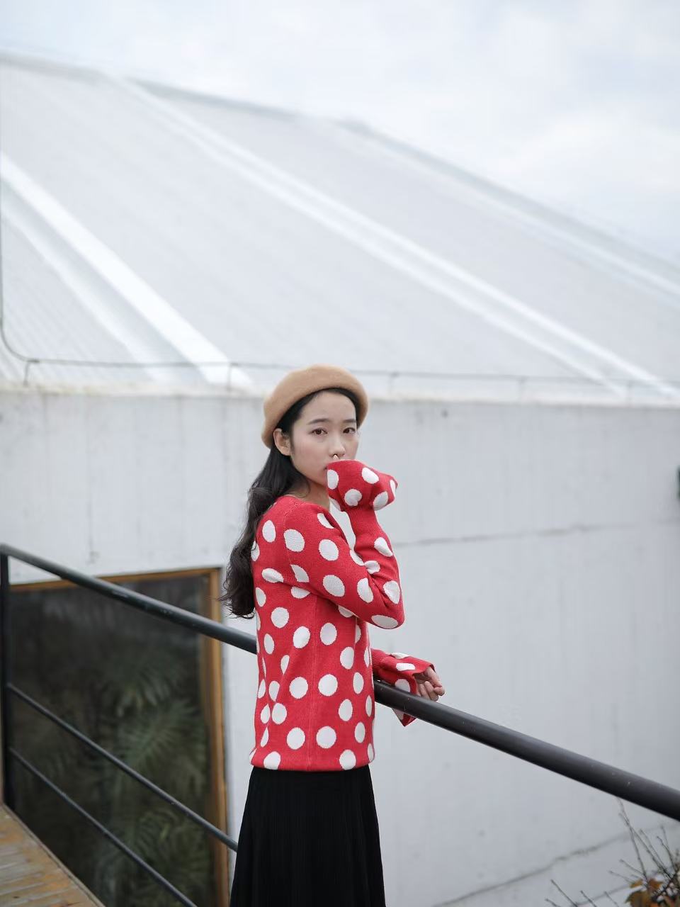 红色是复古红,不会艳丽,恰好是今年又流行的色系。织入纱线的波点提花,精致耐看。
