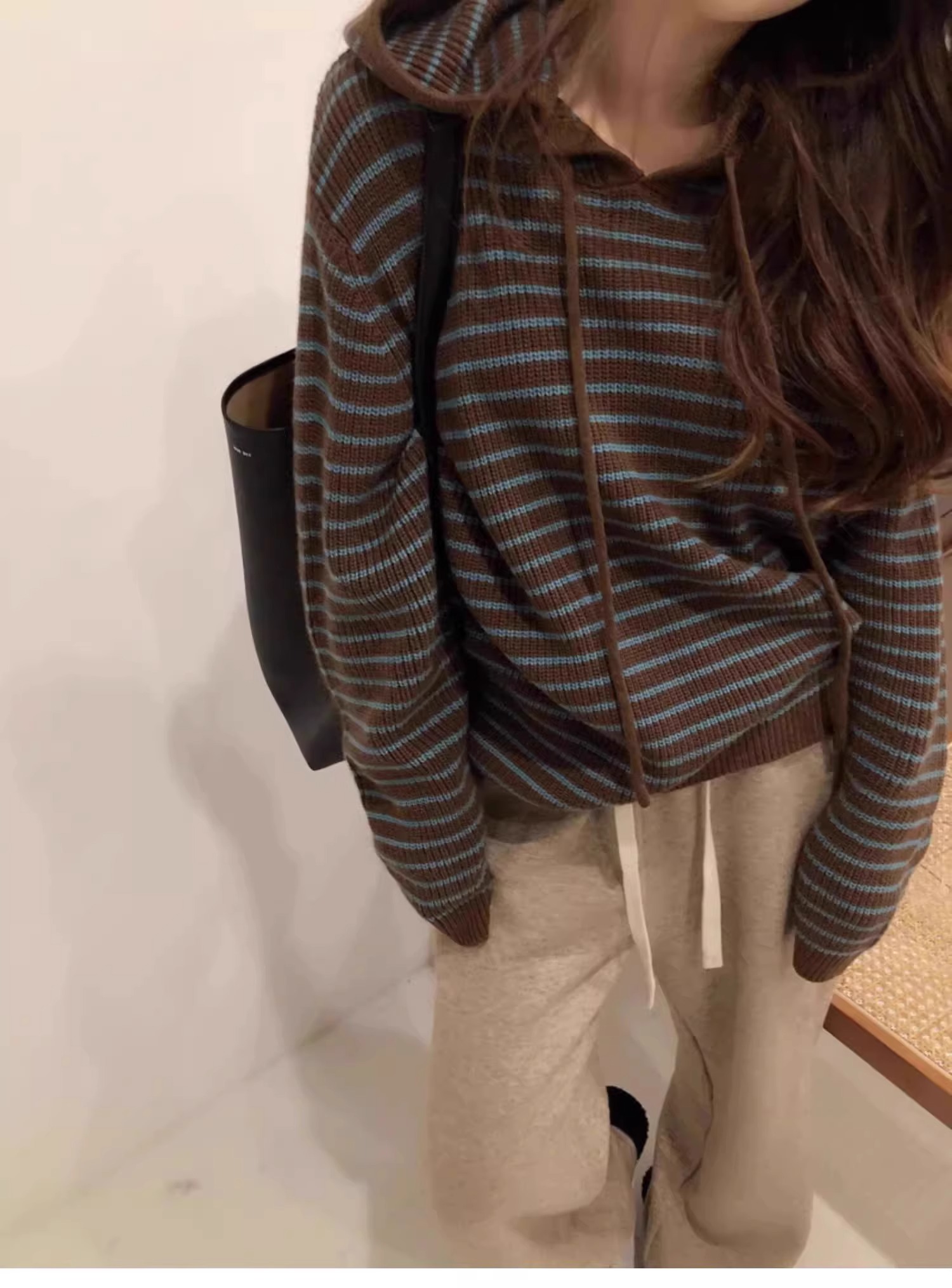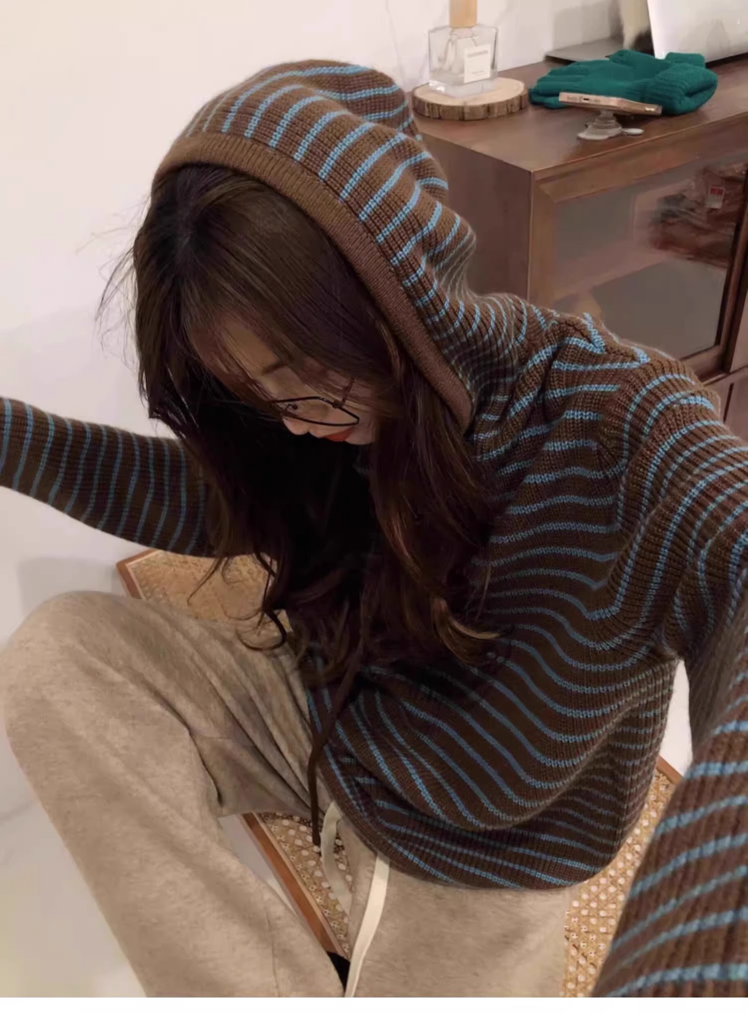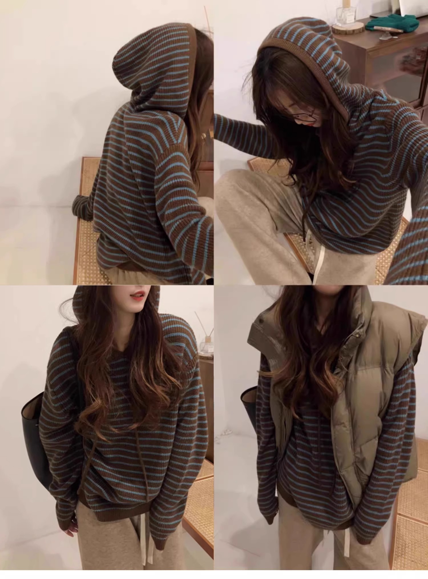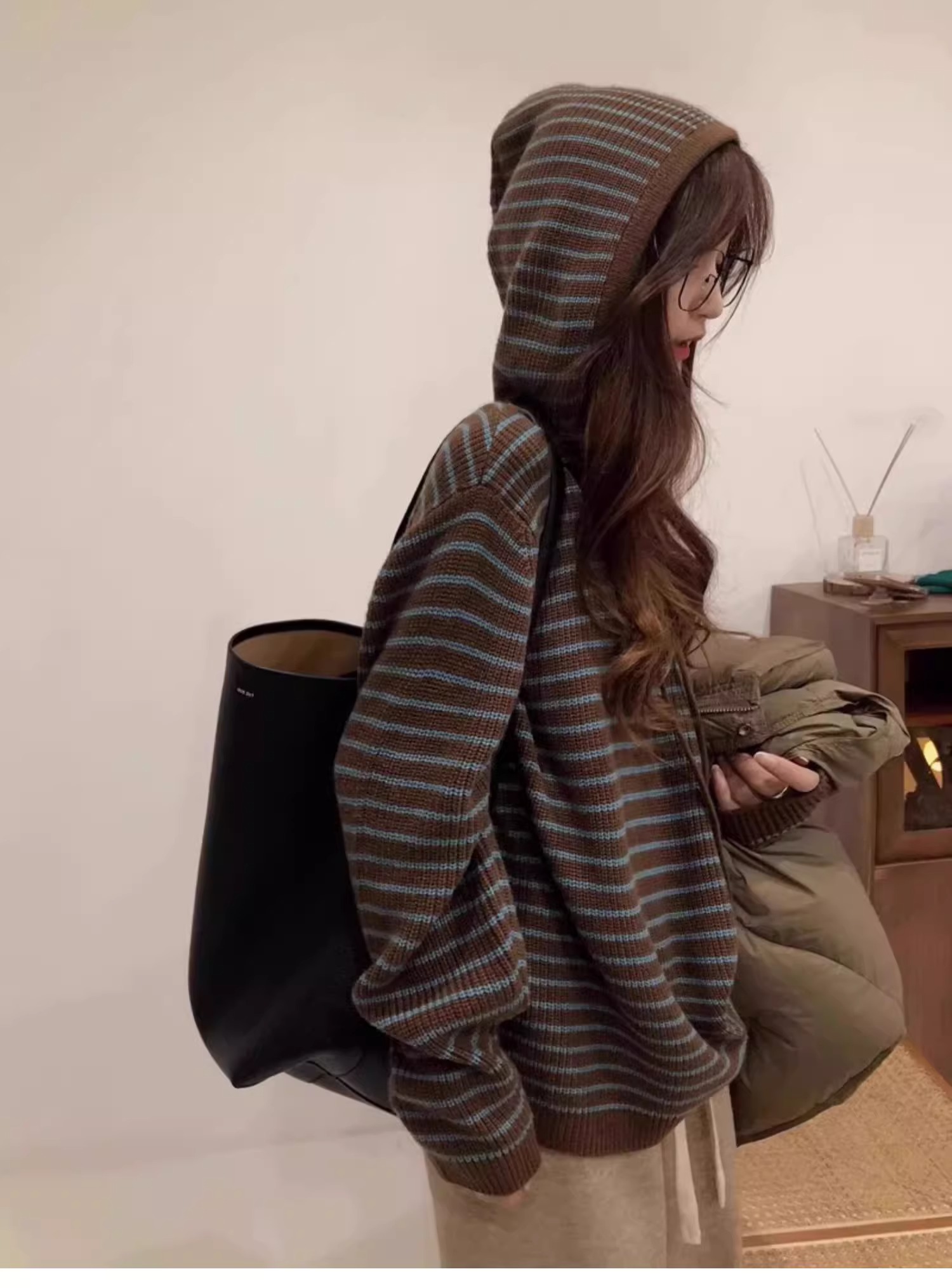 【宽松慵懒风毛衣】秋冬新款宽松软糯慵懒风针织连帽条纹vintage毛衣外套女上衣。rb