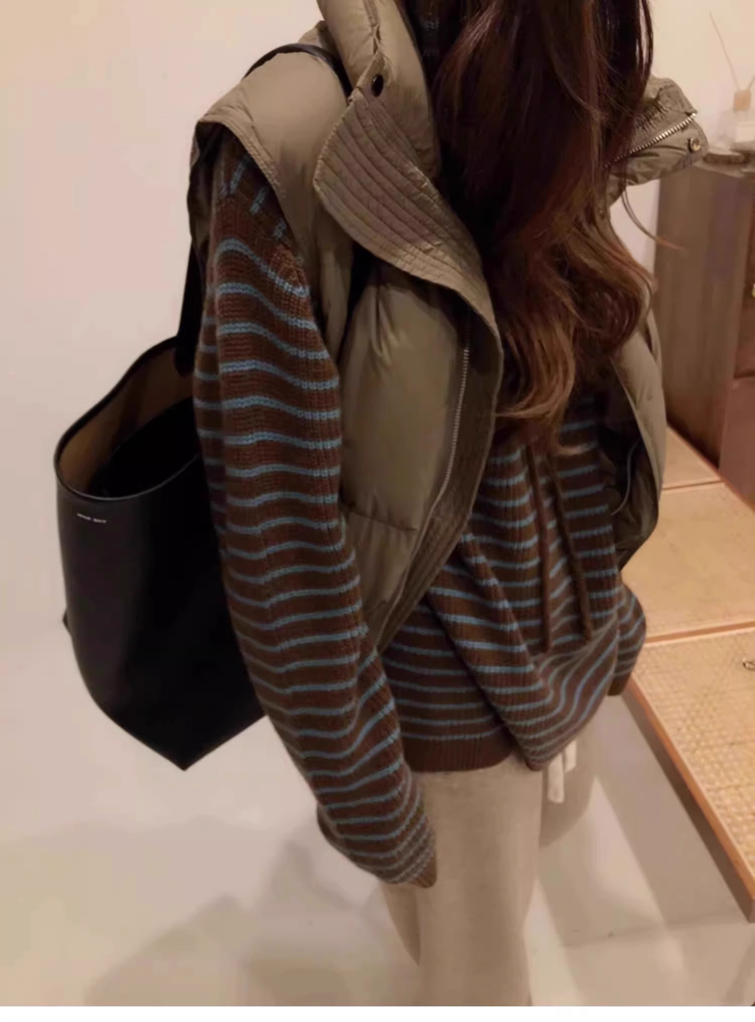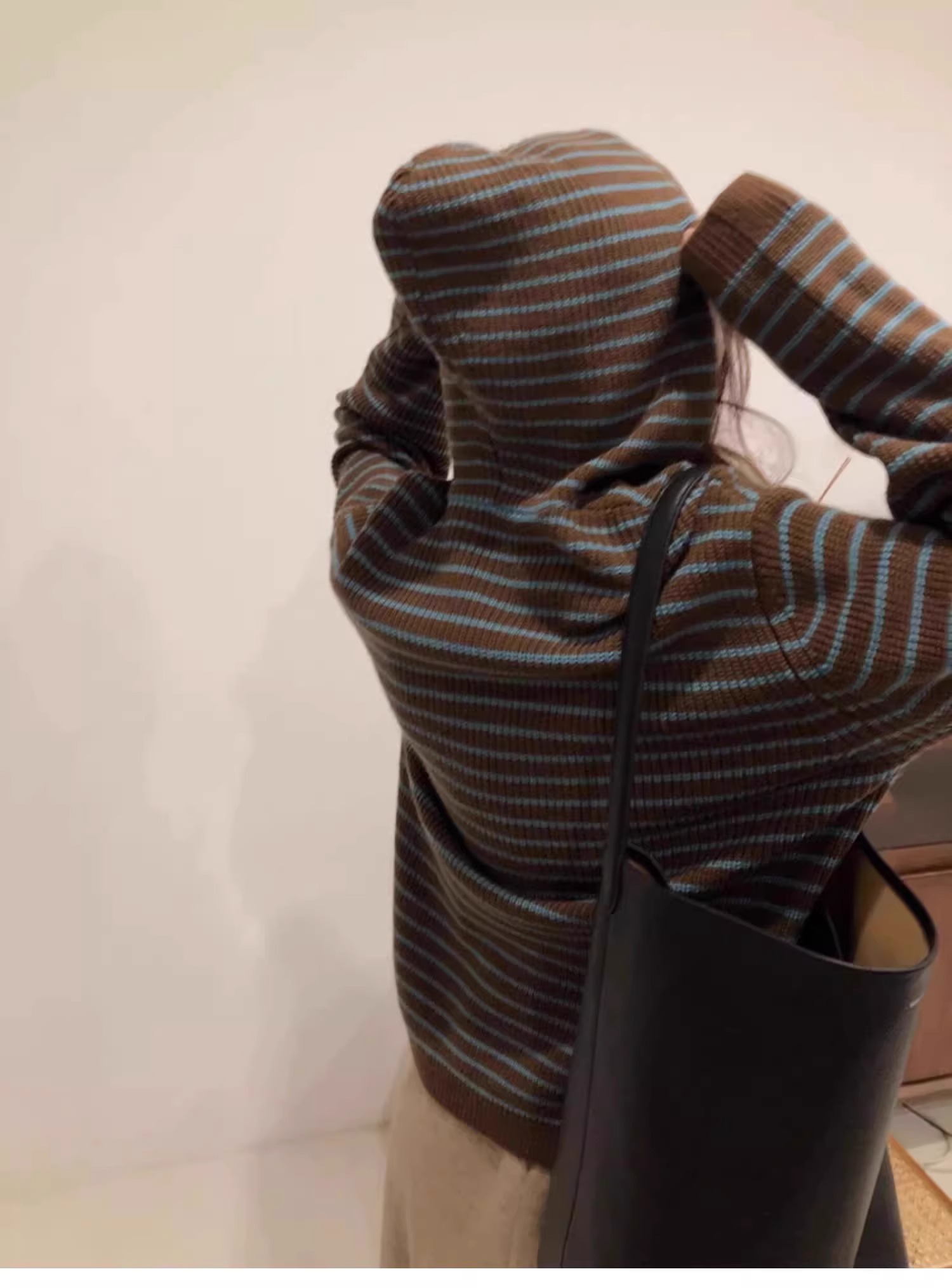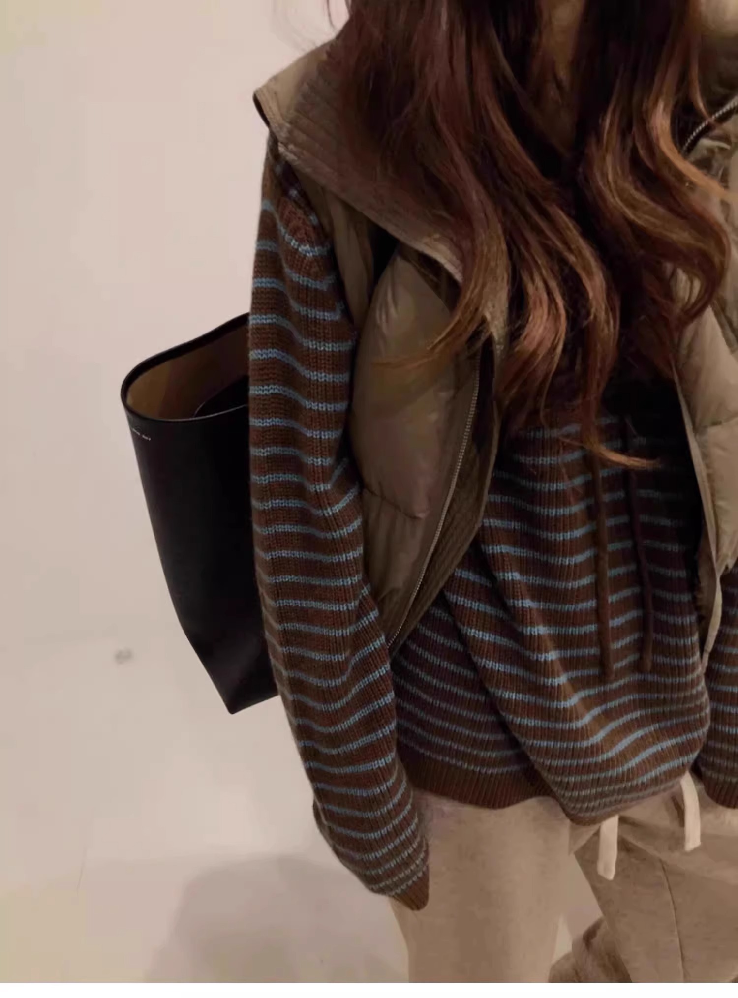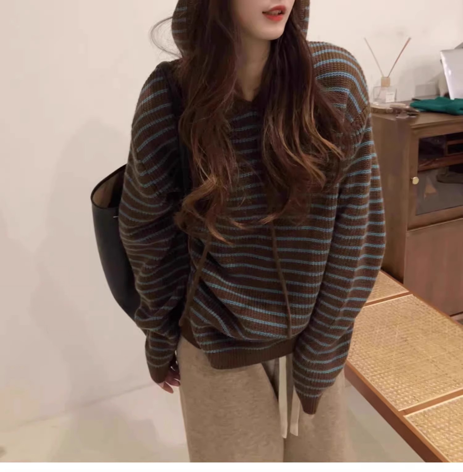 【宽松慵懒风毛衣】秋冬新款宽松软糯慵懒风针织连帽条纹vintage毛衣外套女上衣。rb