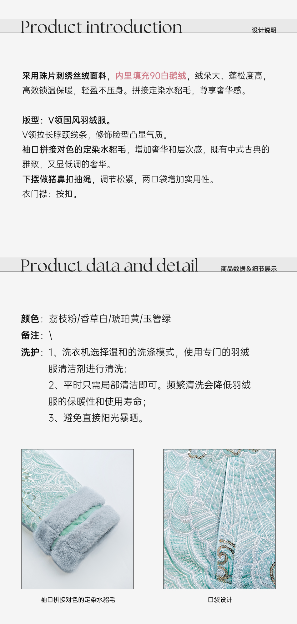 余潇潇【牡丹画卷】奢华珠片刺绣丝绒拼接水貂毛90白鹅绒国风羽绒服