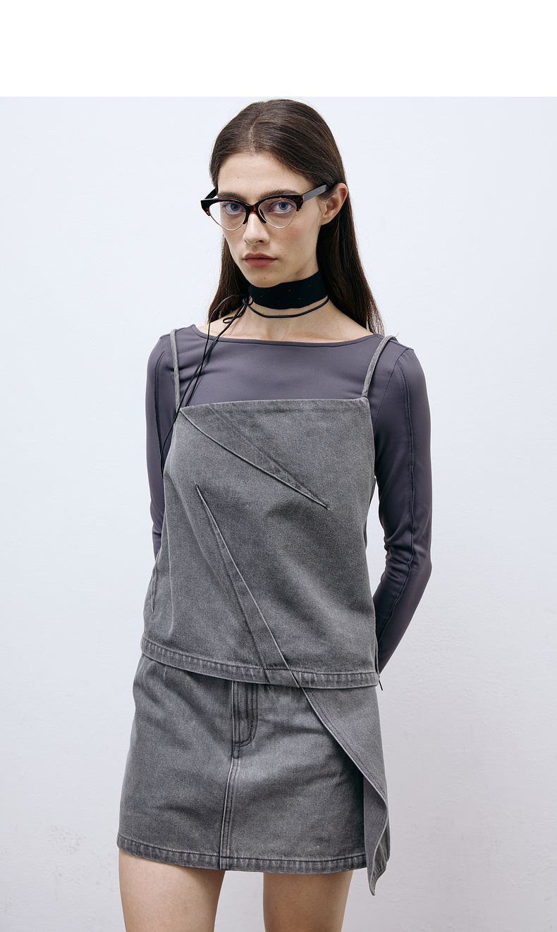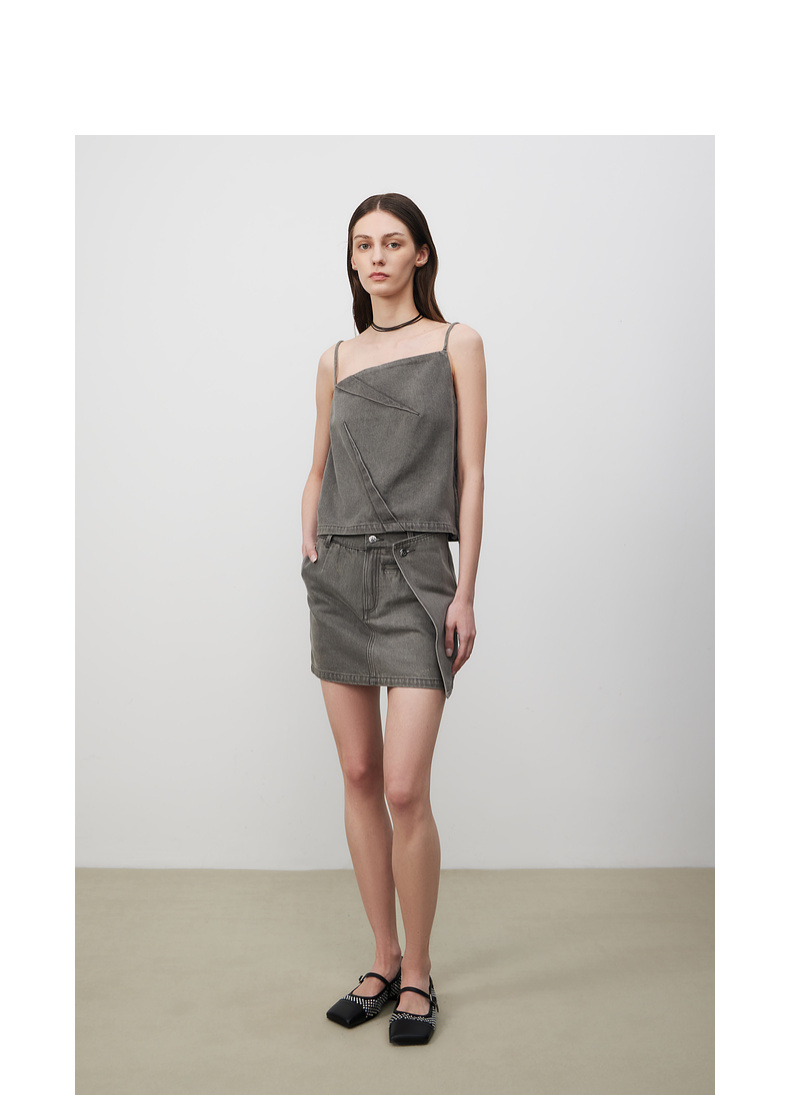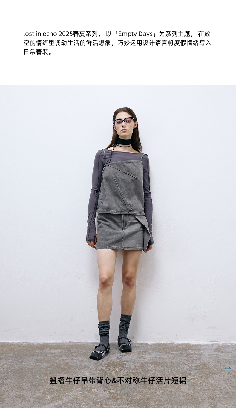 lost in echo2025春夏新款时尚灰色直身牛仔吊带背心A字短裙套装