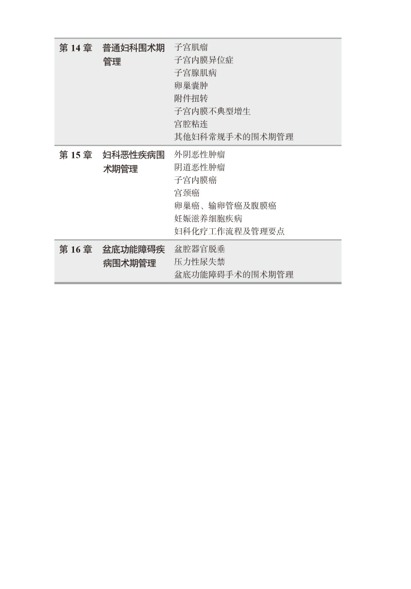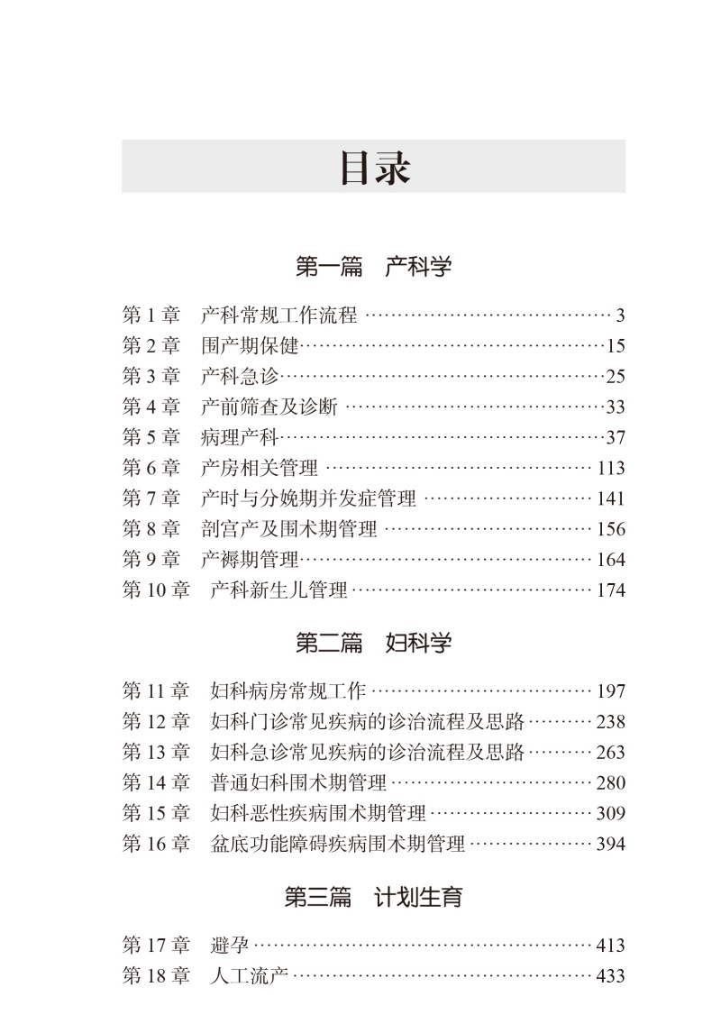 目录 第一篇 产科学 第 1 章 产科常规工作流程 3 第 2 章 围产期保健15 第 3 章 产科急诊25 第 4 章 产前筛查及诊断 33 第 5 章 病理产科37 第 6 章 产房相关管理 113 第 7 章 产时与分娩期并发症管理 141 第 8 章 剖宫产及围术期管理 156 第 9 章 产褥期管理 164 第 10 章 产科新生儿管理 174 第二篇 妇科学 第 11 章 妇科病房常规工作 197 第 12 章 妇科门诊常见疾病的诊治流程及思路 238 第 13 章 妇科急诊常见疾病的诊治流程及思路 263 第 14 章 普通妇科围术期管理 280 第 15 章 妇科恶性疾病围术期管理 309 第 16 章 盆底功能障碍疾病围术期管理 394 第三篇 计划生育 第 17 章 避孕 413 第 18 章 人工流产 433