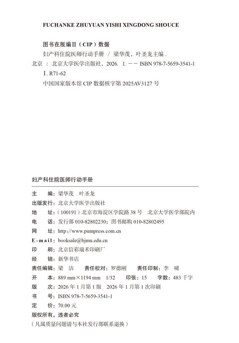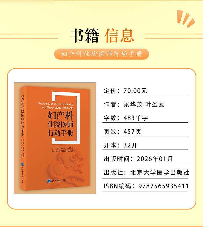 妇产科住院医师行动手册 梁华茂 叶圣龙 涵盖从接诊患者时的细致问诊 到开具医嘱时的严谨规范等 妇产科病 北京大学医学出版社