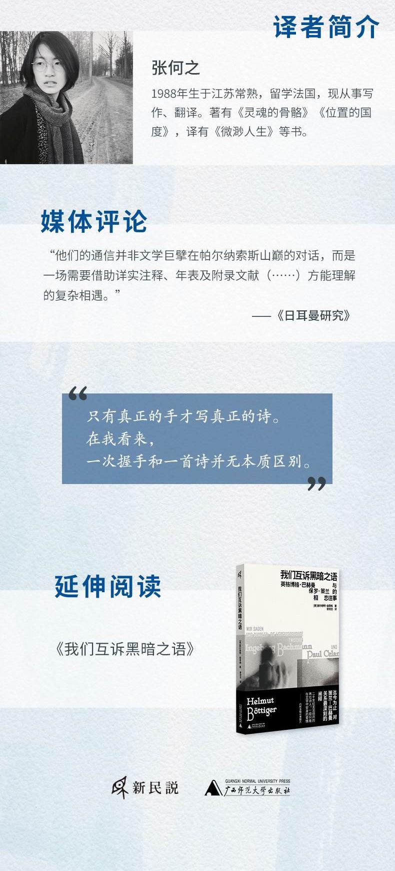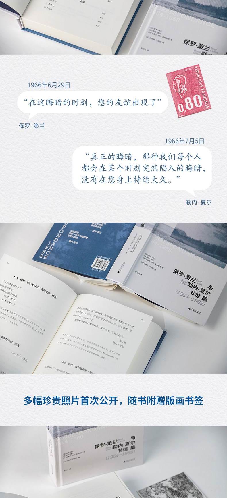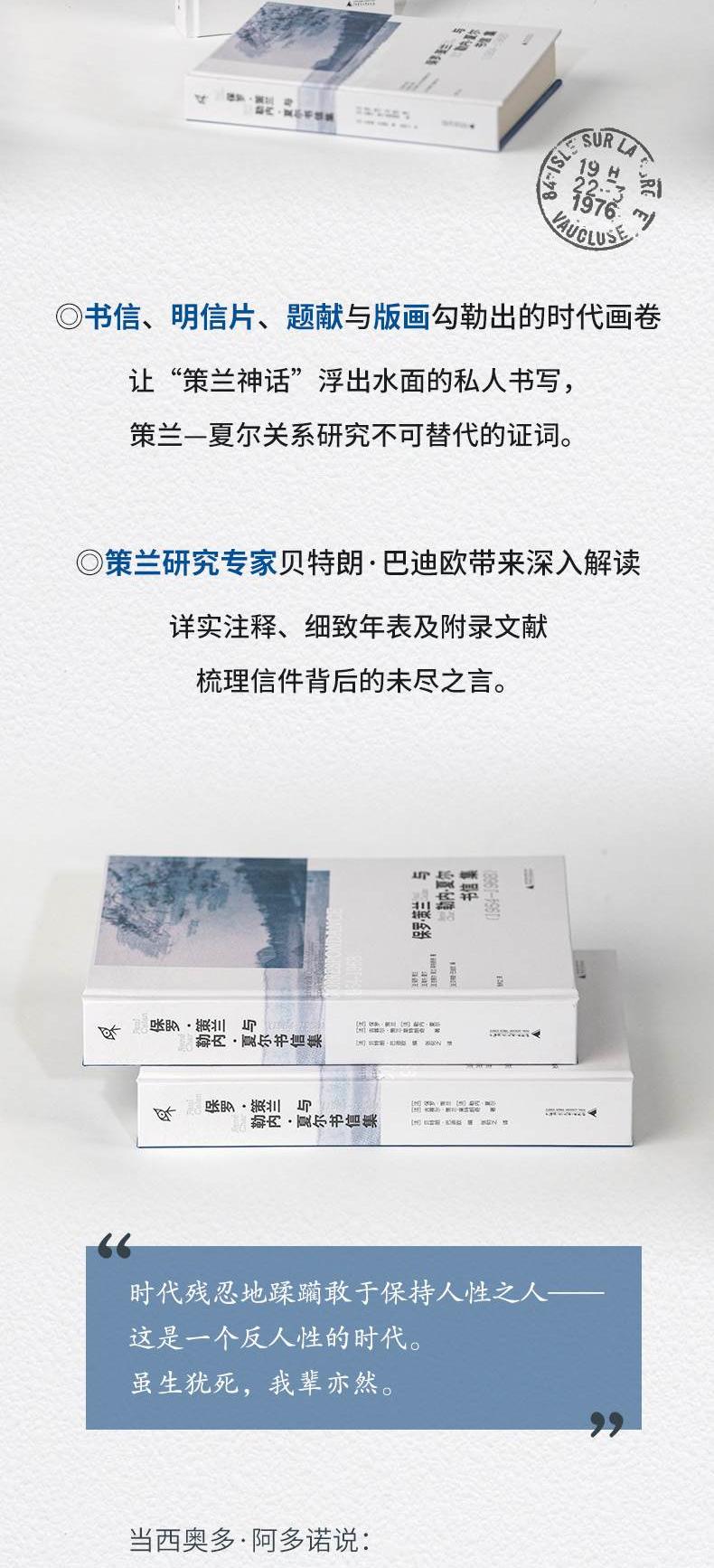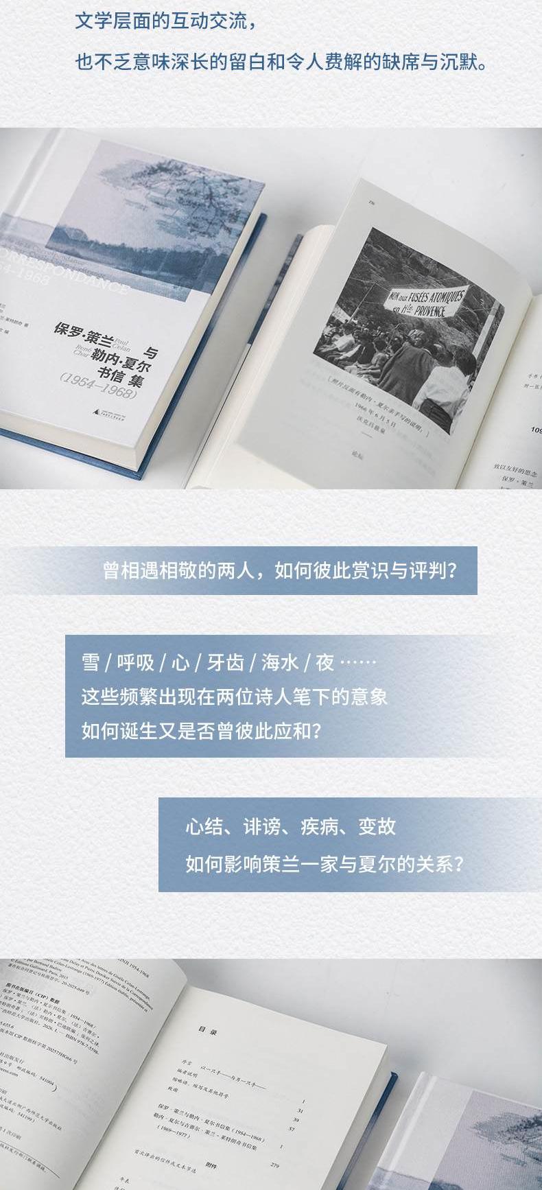 n 本书收录了策兰与夏尔于1954—1968年间往来的书信、明信片与题献,策兰的信件往往充满仰慕,或寻求认可与慰藉,渴望分享与对话;夏尔则大多保持着矜持克制,二人对诗歌的坦诚交流予人启发,文字间也流露出动人的情谊,在策兰去世后,夏尔与吉赛尔的通信往来中,同样可见不逊于此前的情感强度。