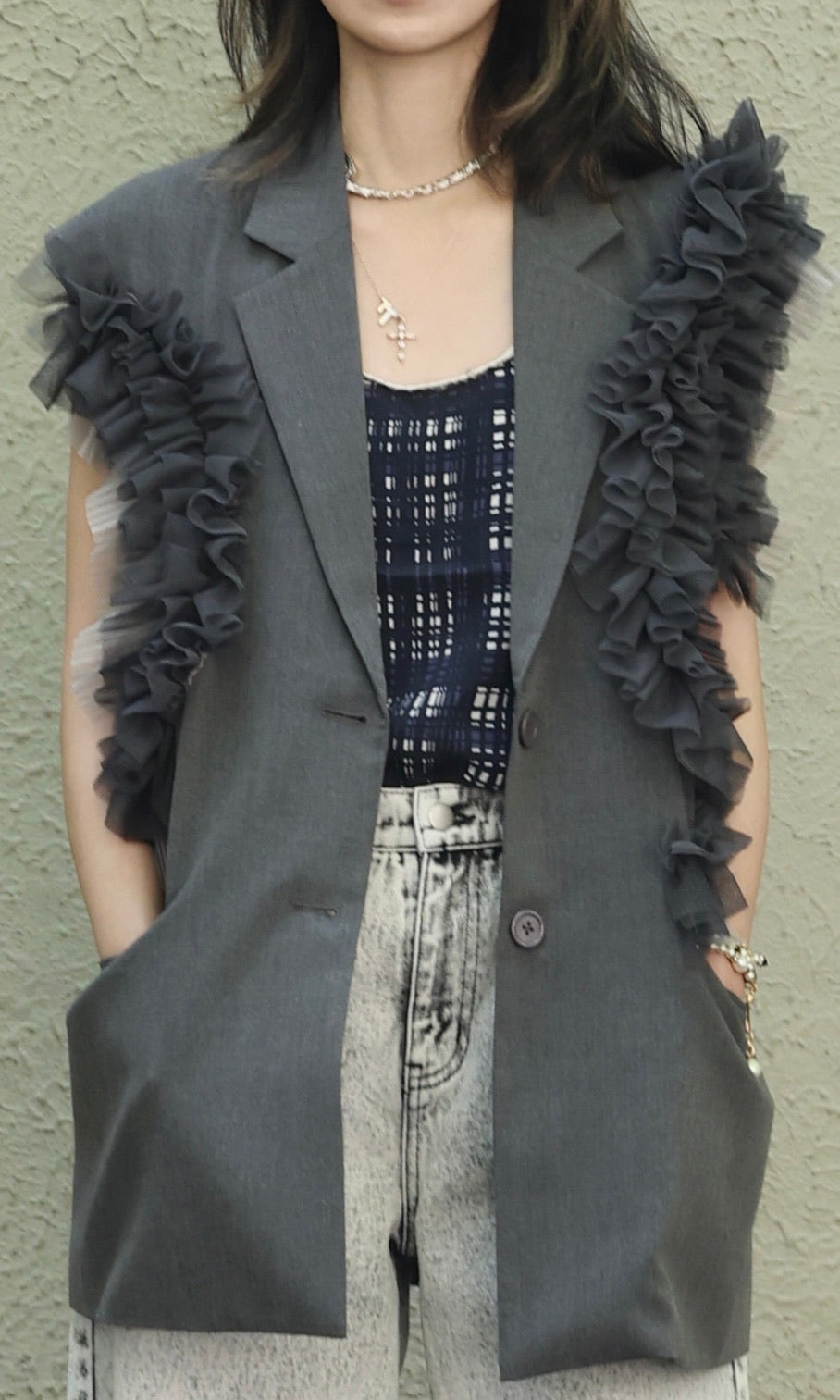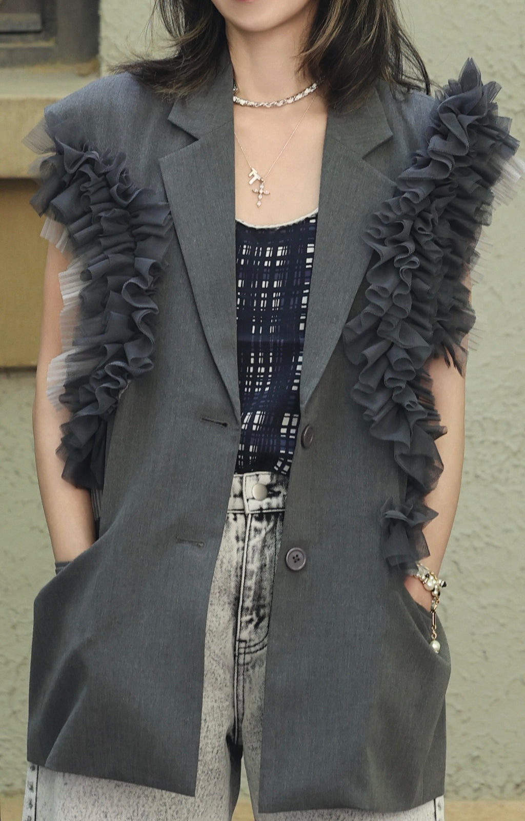 TYNVIE 分层荷叶边挺括无袖马甲西装外套-灰色
