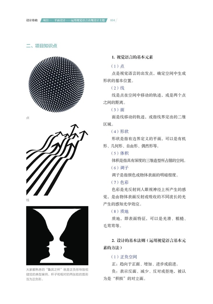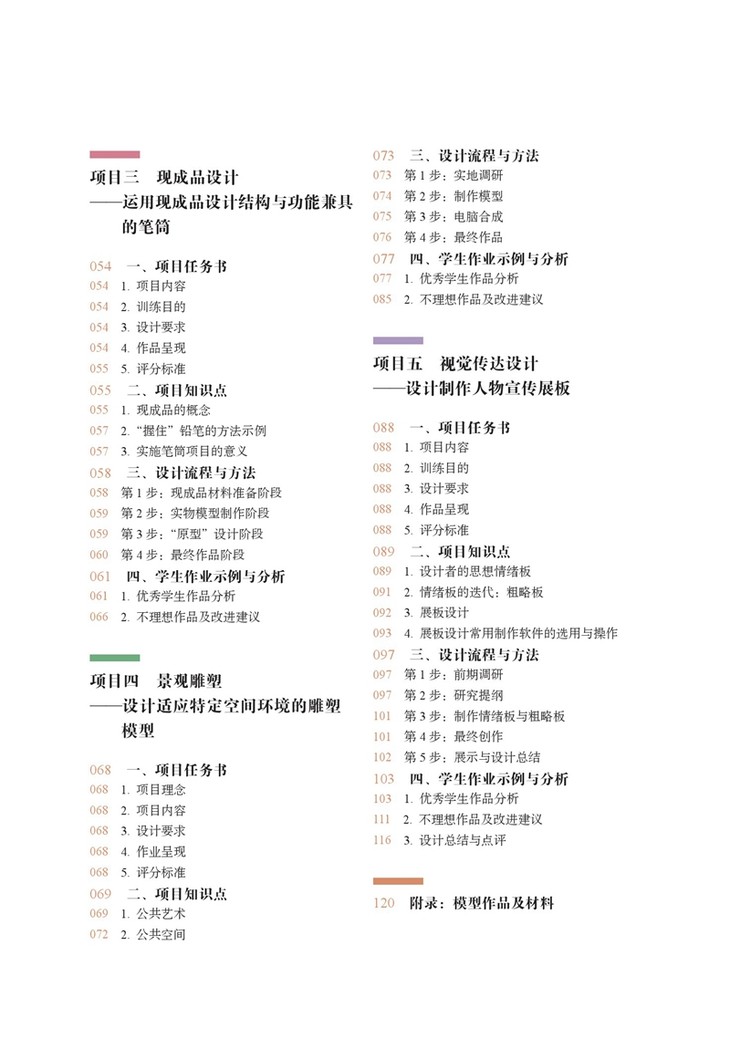 本书由浅入深共设置五个项目,涉及设计基础课中的平面视觉语言、立体视觉语言,并且向设计专业课——工业设计、公共艺术设计和视觉传达设计进行了延伸。