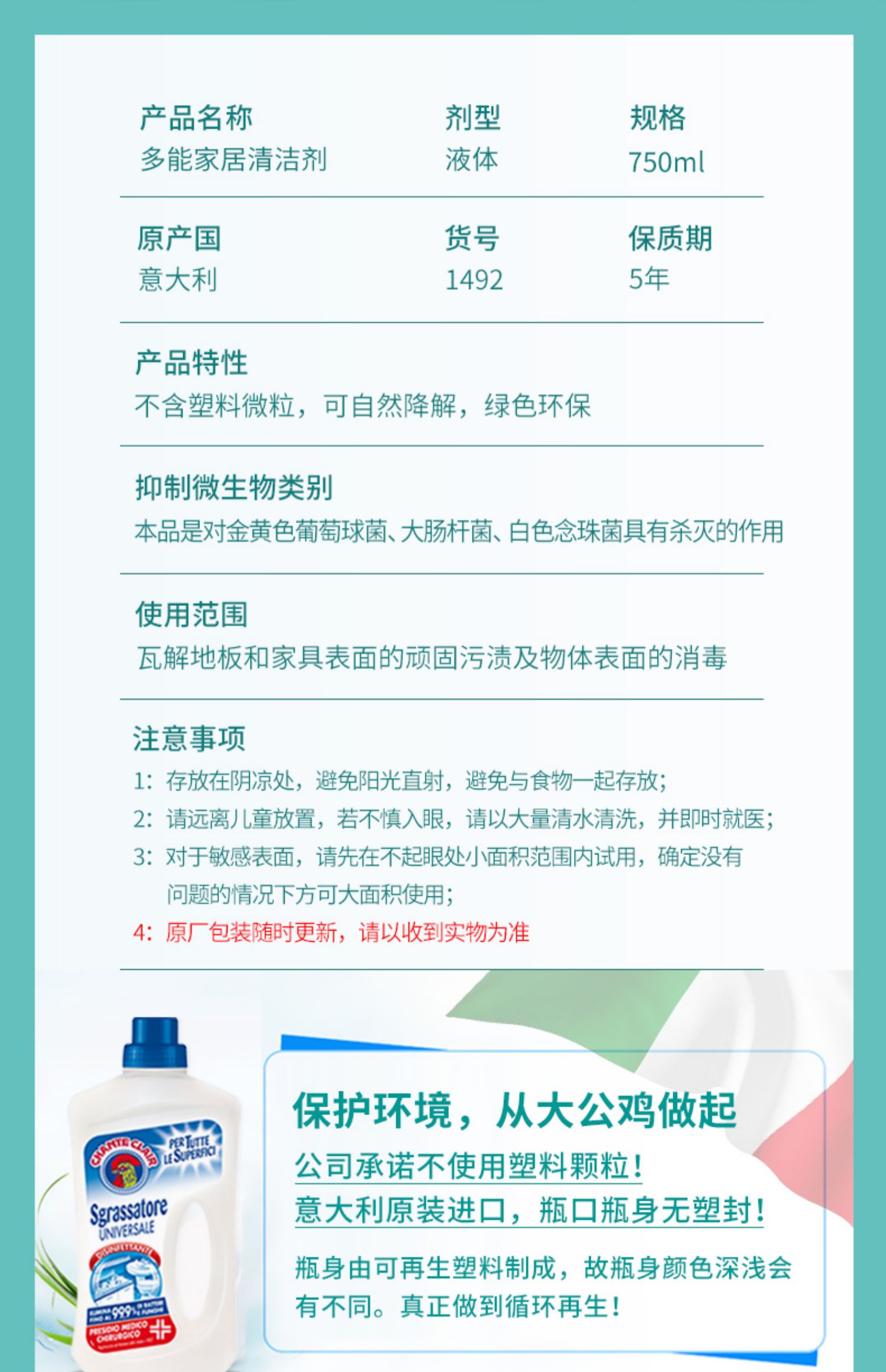 【中欧班列精选2瓶】意大利清洁剂 原装进口大公鸡管家地板清洁护理液750ml/瓶OC