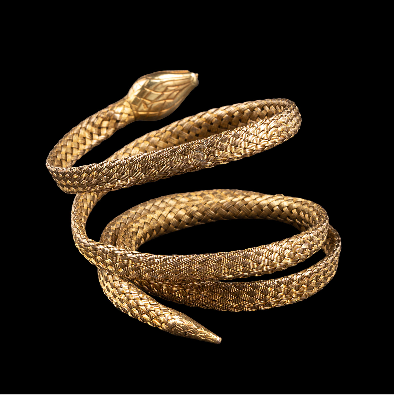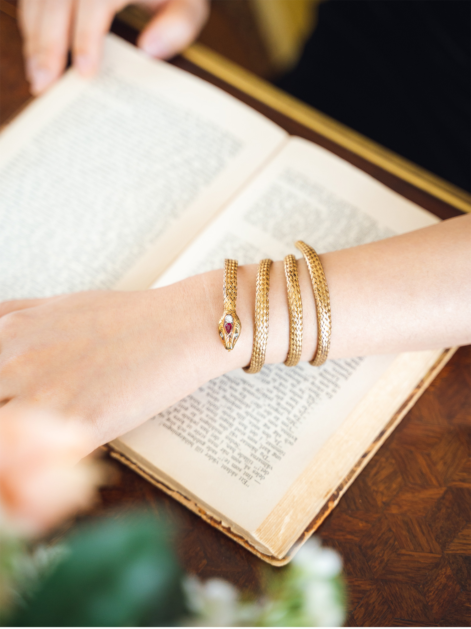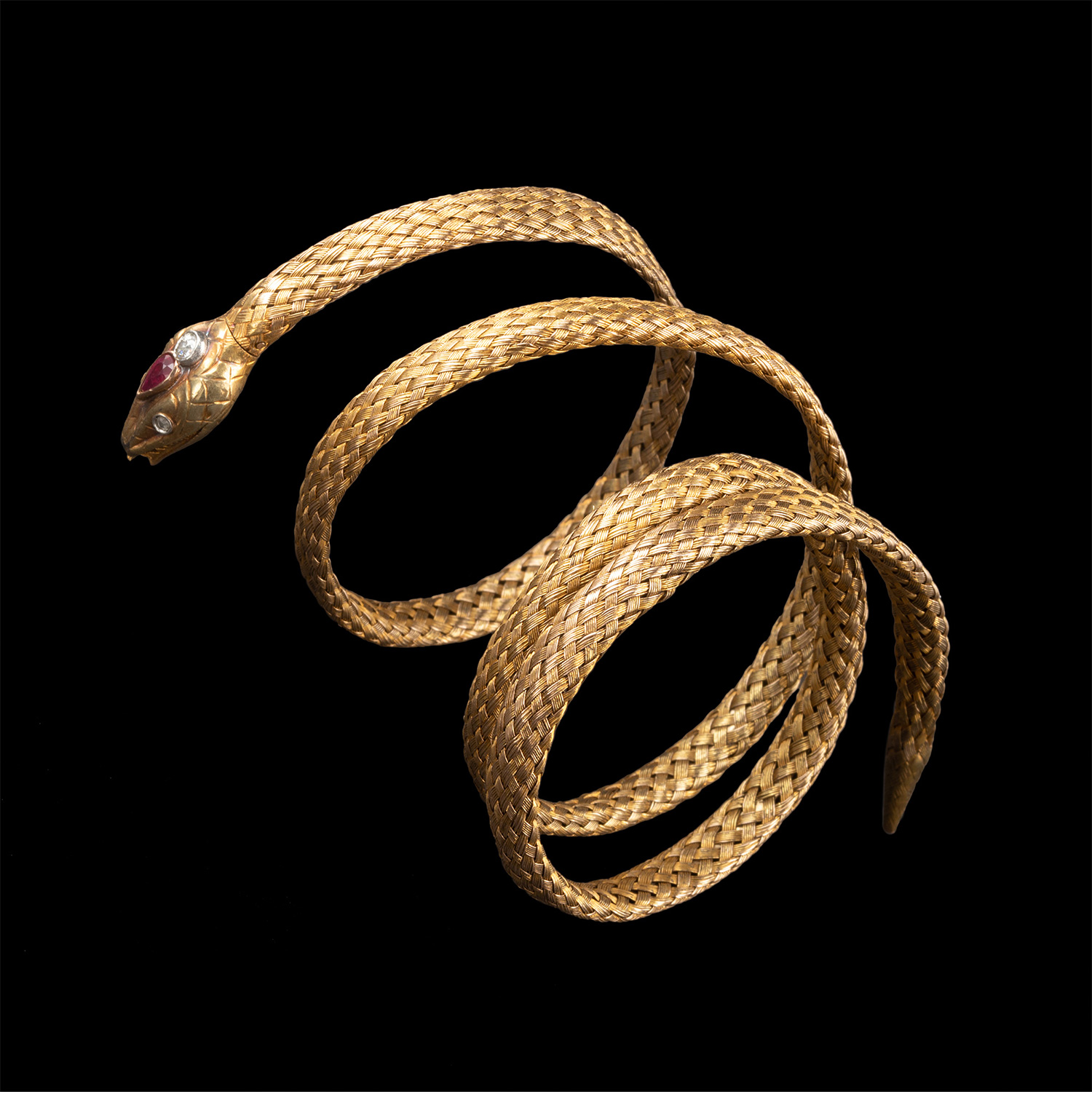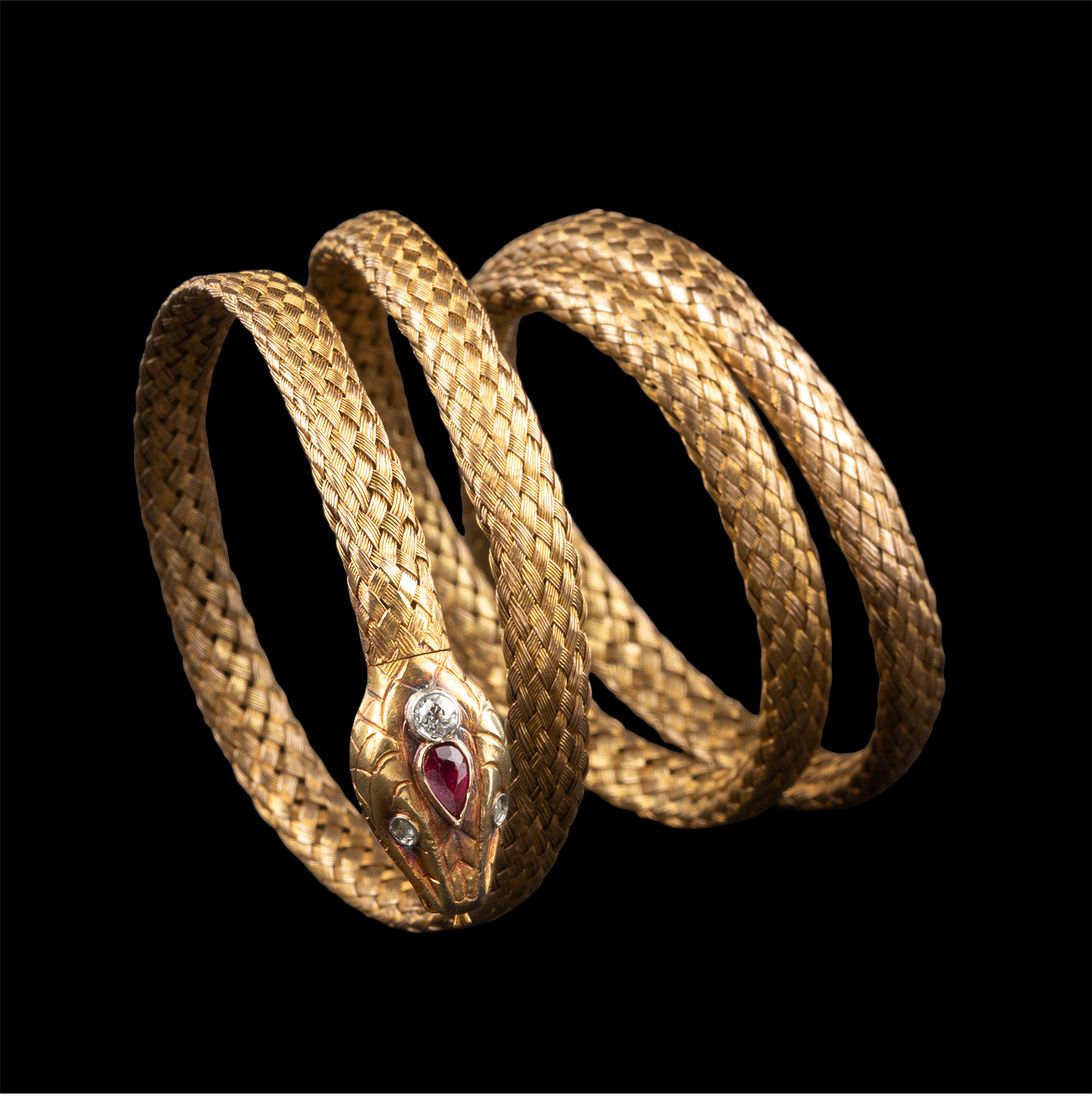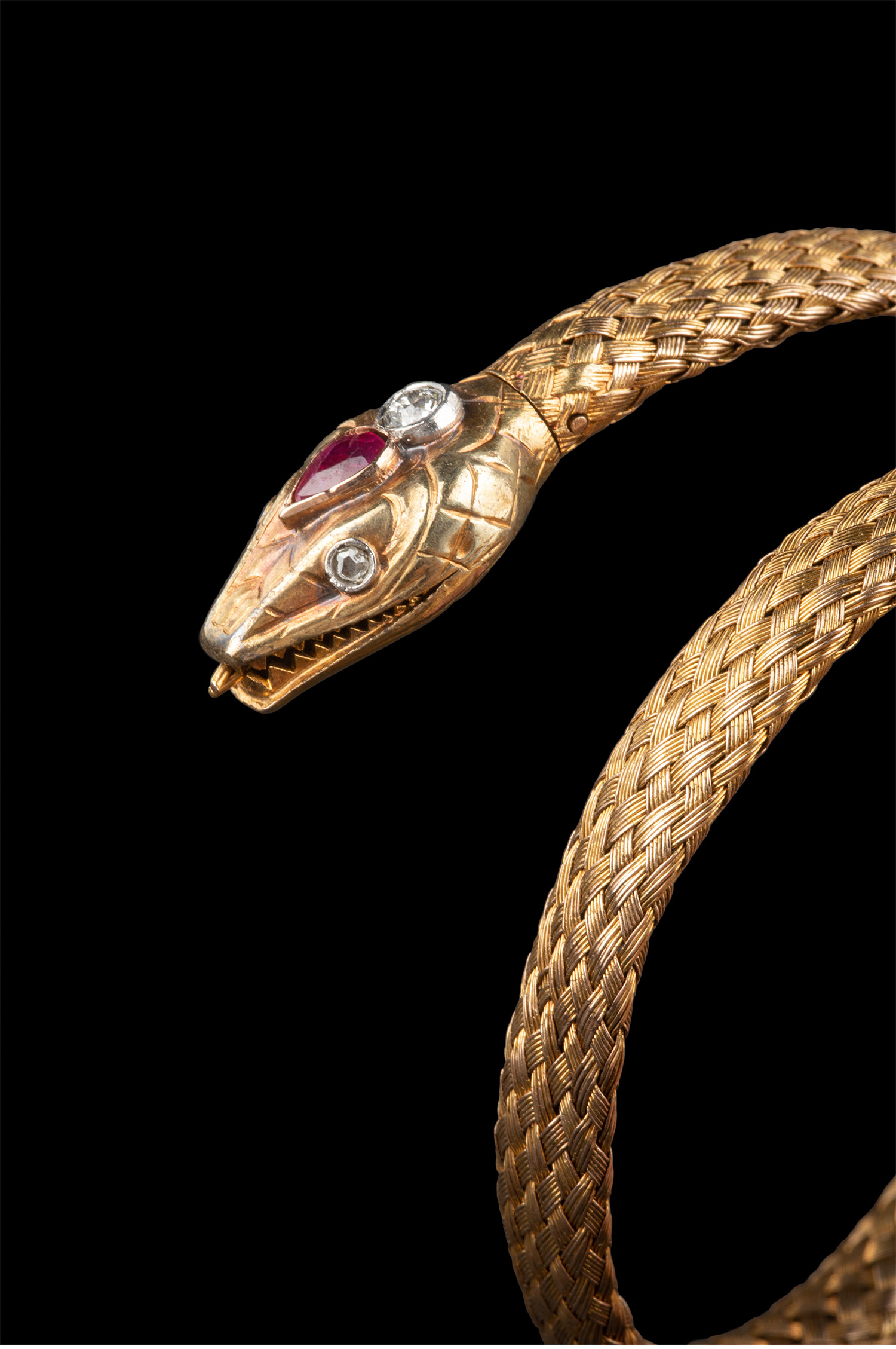 19世纪末德国出品14K黄金镶嵌红宝石及钻石编织纹理灵蛇造型手镯
