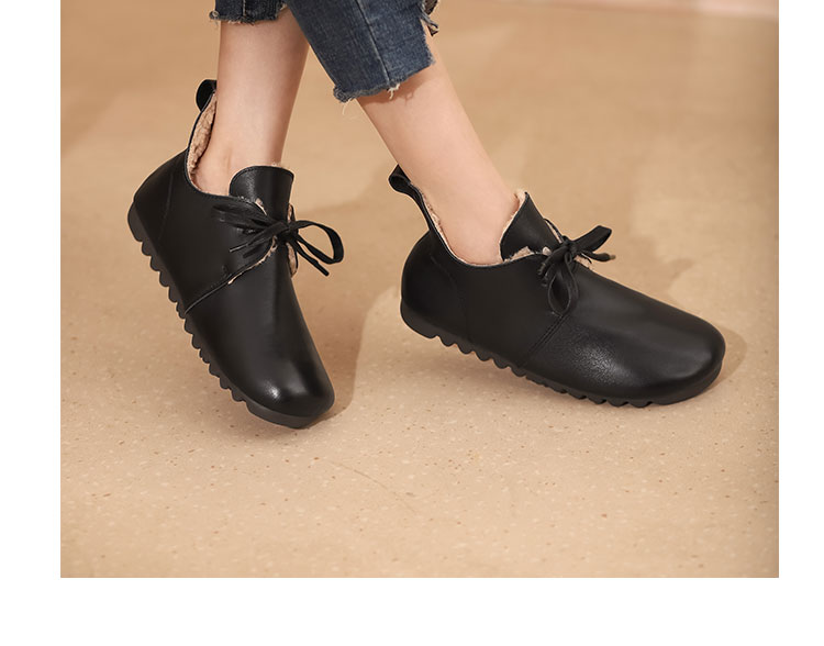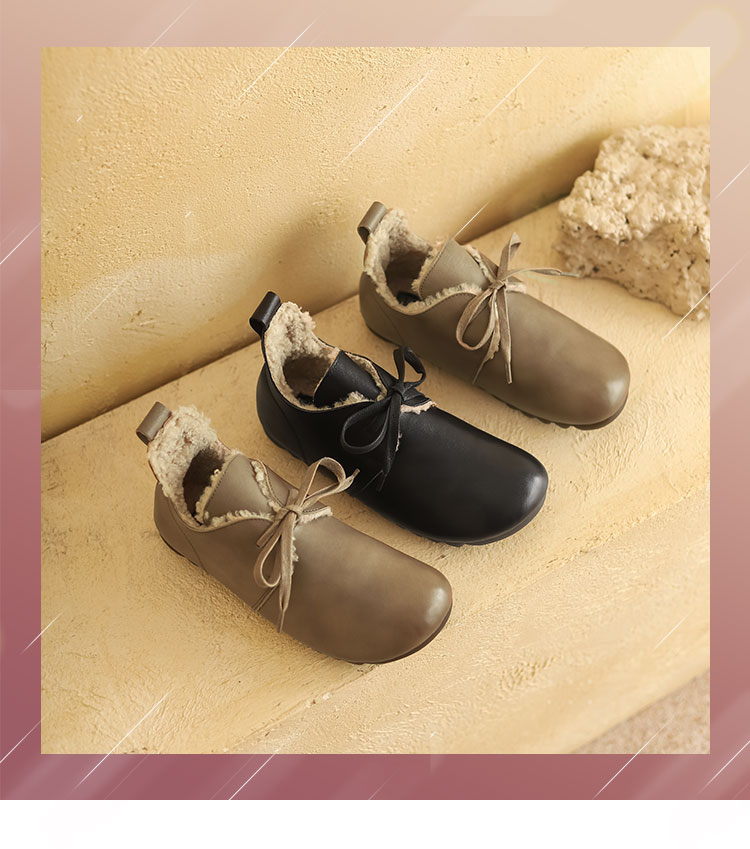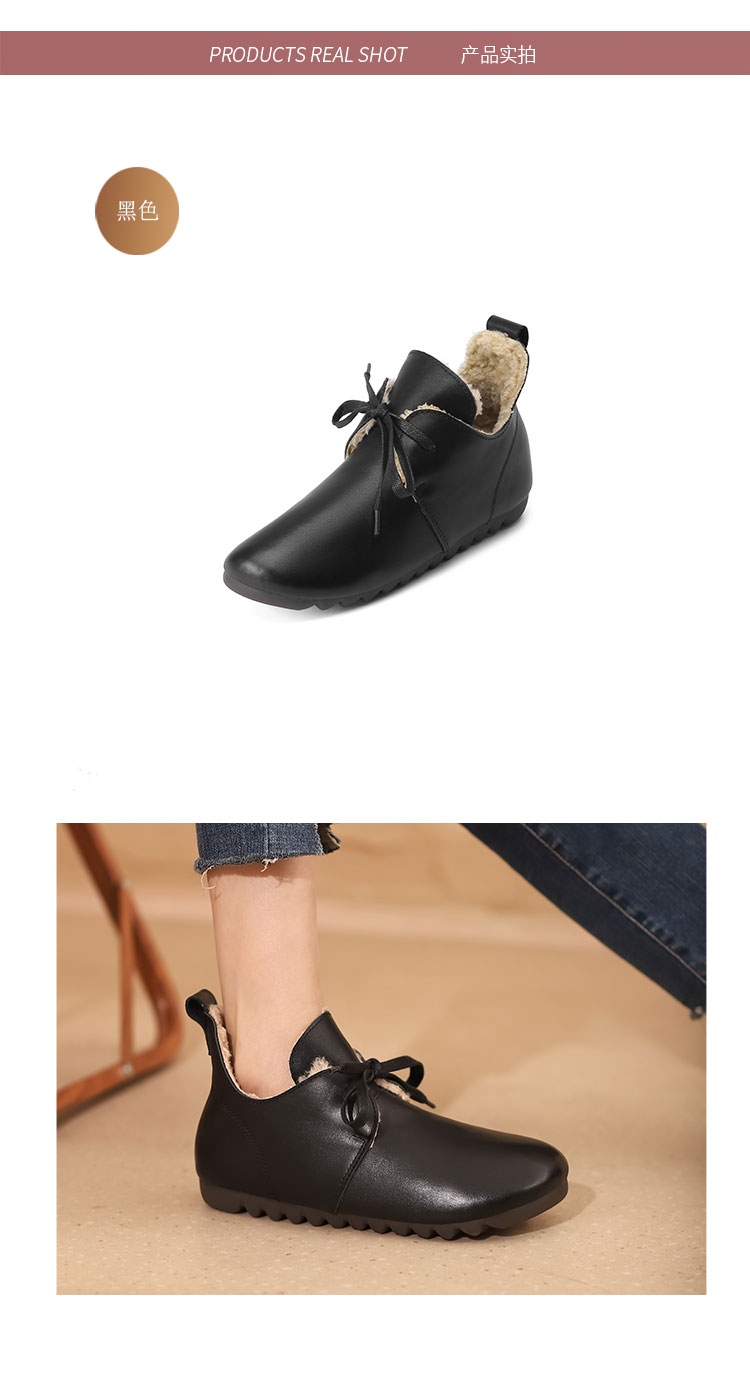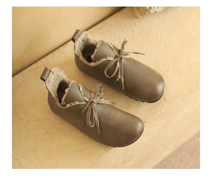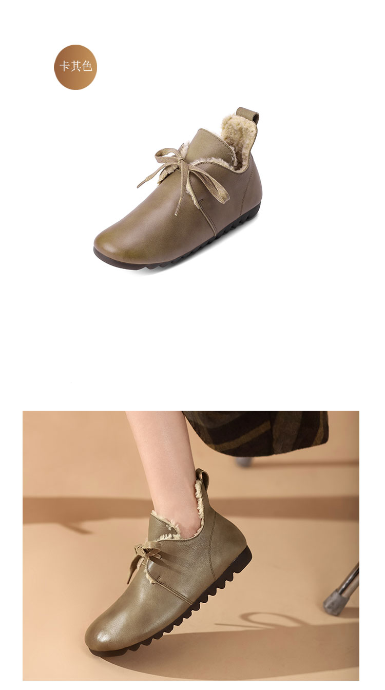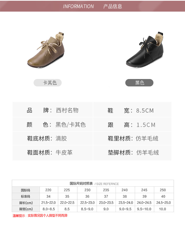 西村名物2021秋冬新款圆头系带加绒保暖毛毛鞋牛皮软底复古毛靴平底靴子女X21CM36351