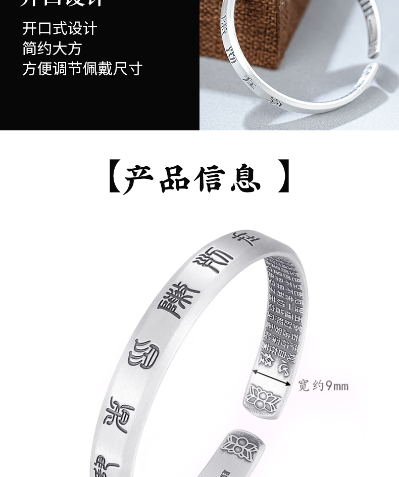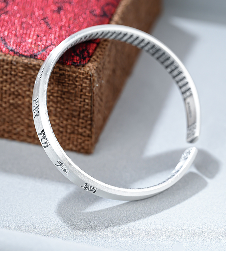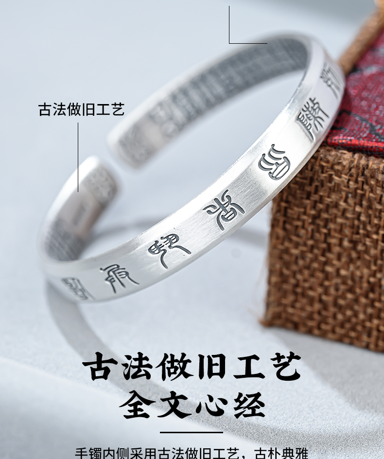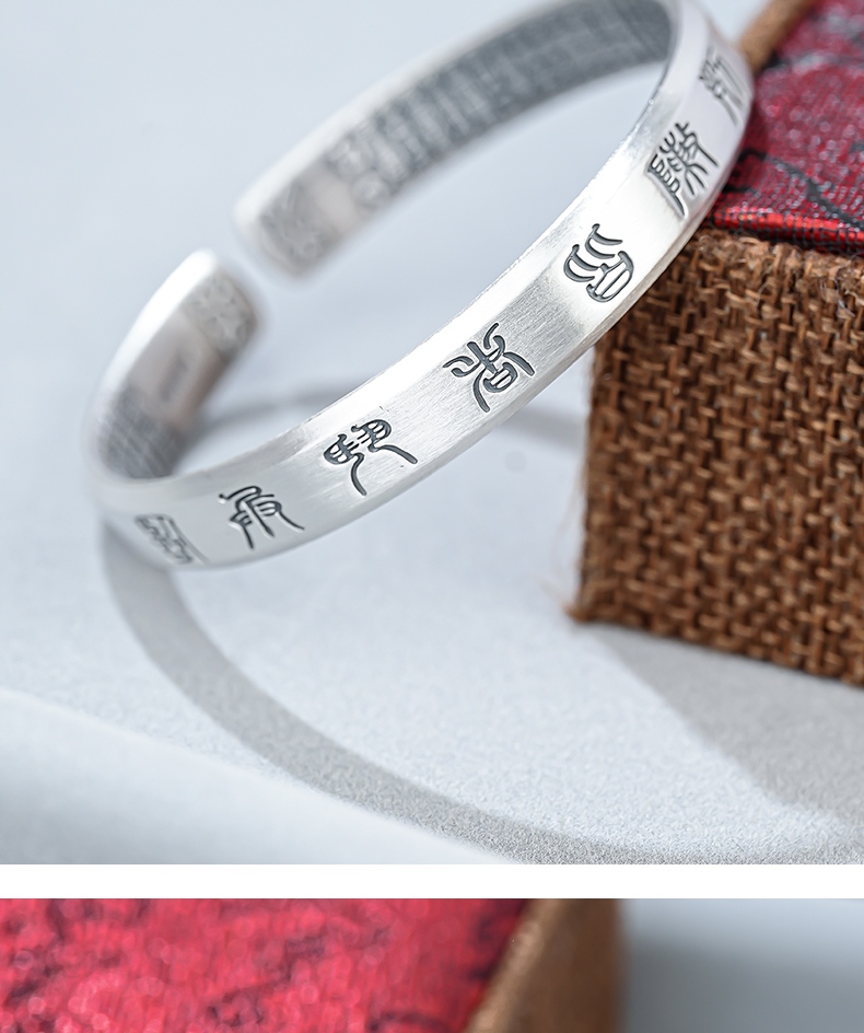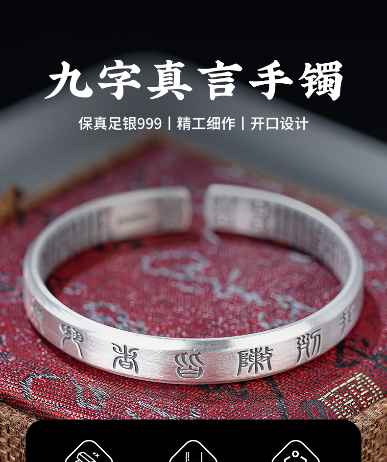 足银999九字真言刻字银手镯精工雕刻心经男女同款