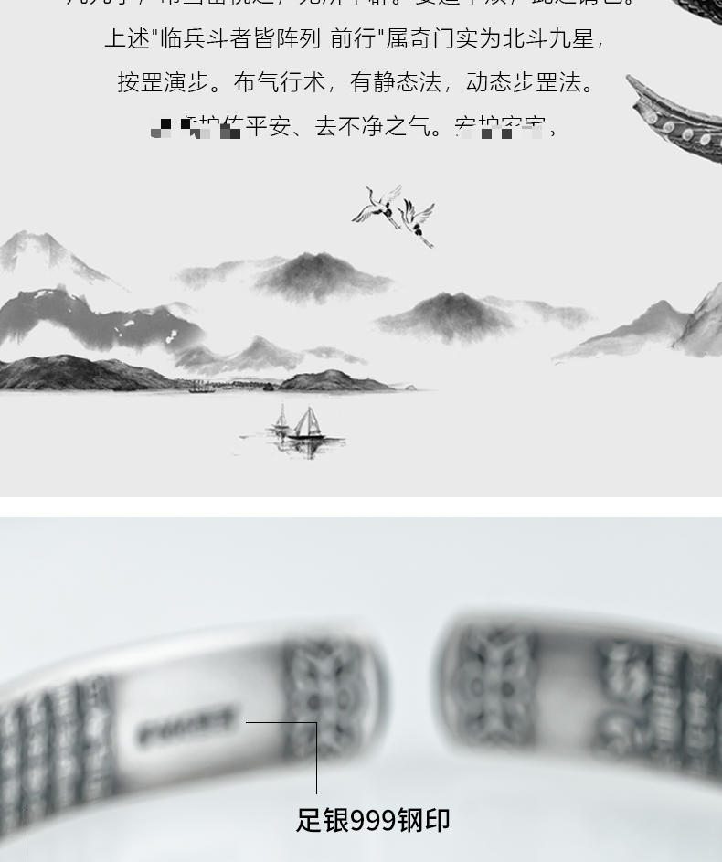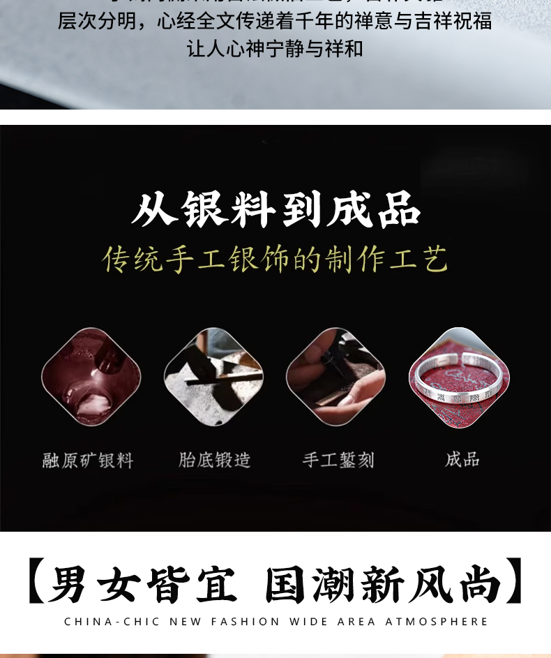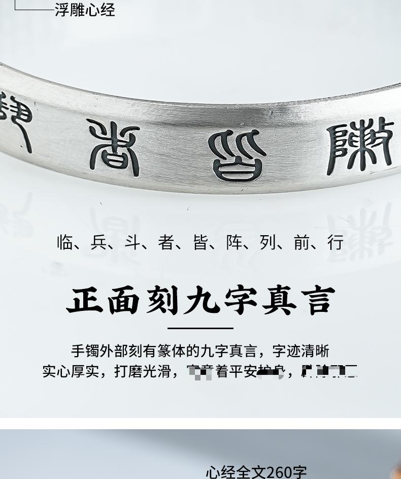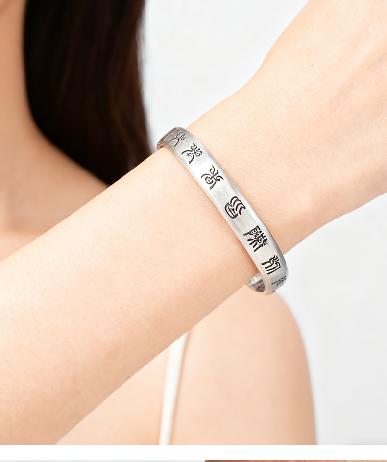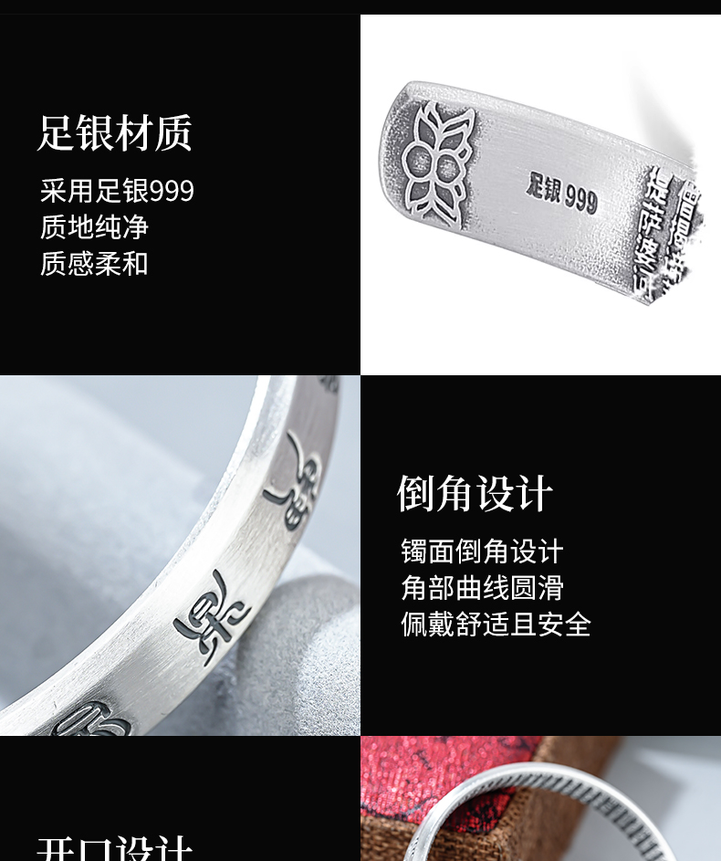 足银999九字真言刻字银手镯精工雕刻心经男女同款