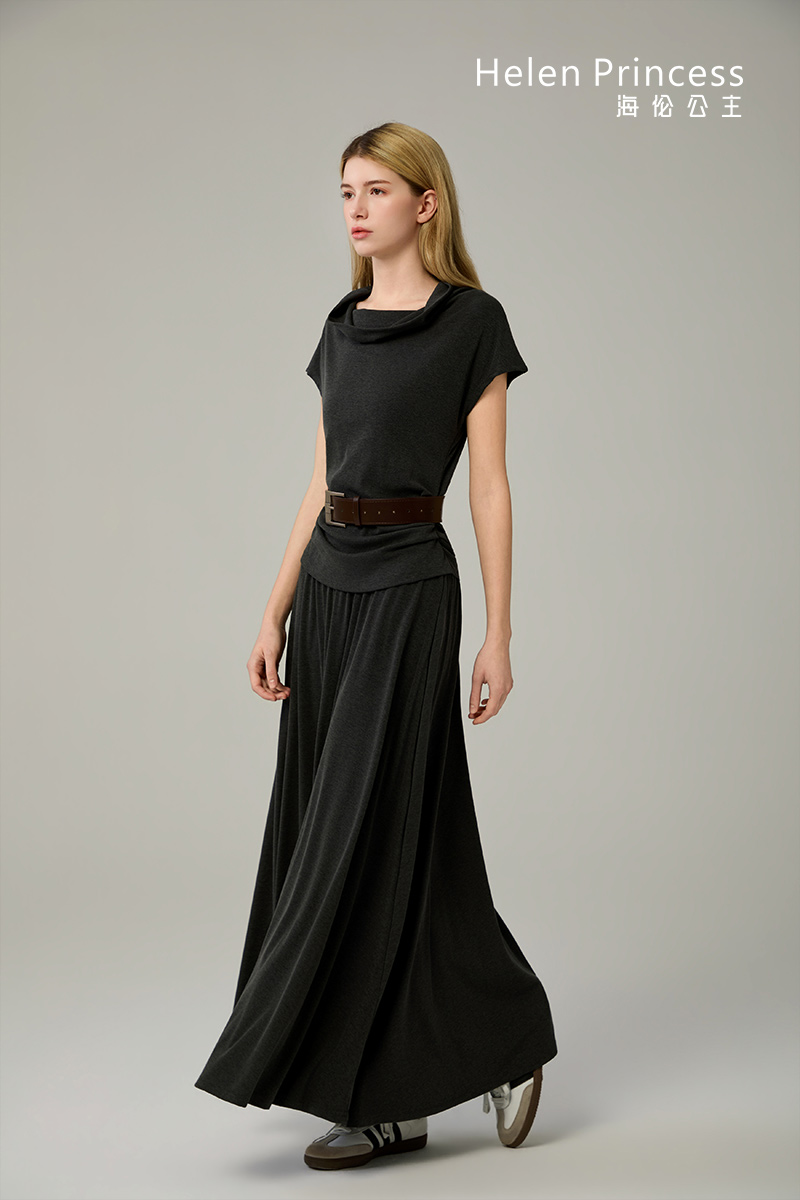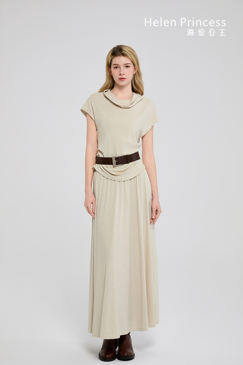 优雅的荡领设计,营造出柔和的垂坠感;腰部两侧均匀压褶,巧妙修饰身形并自然收腰;宽边腰带作为点睛之笔,既强化了腰线,又增添了几分复古优雅的异域风格。