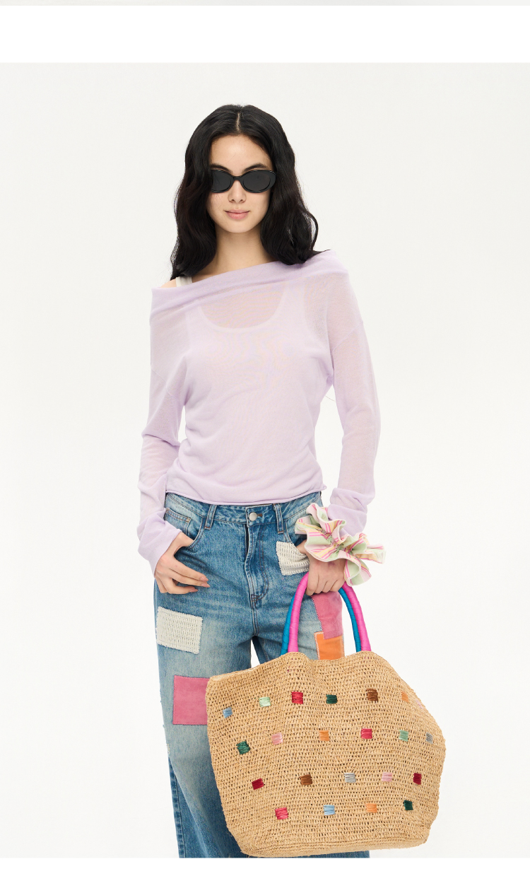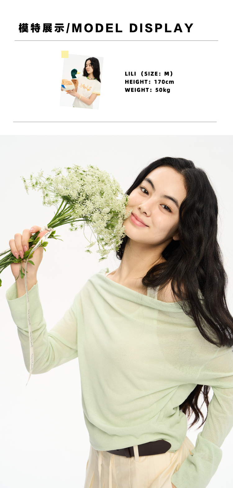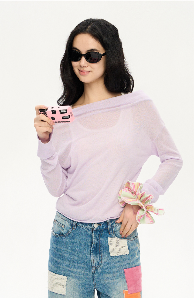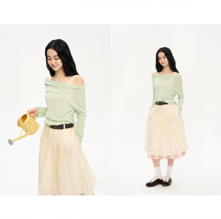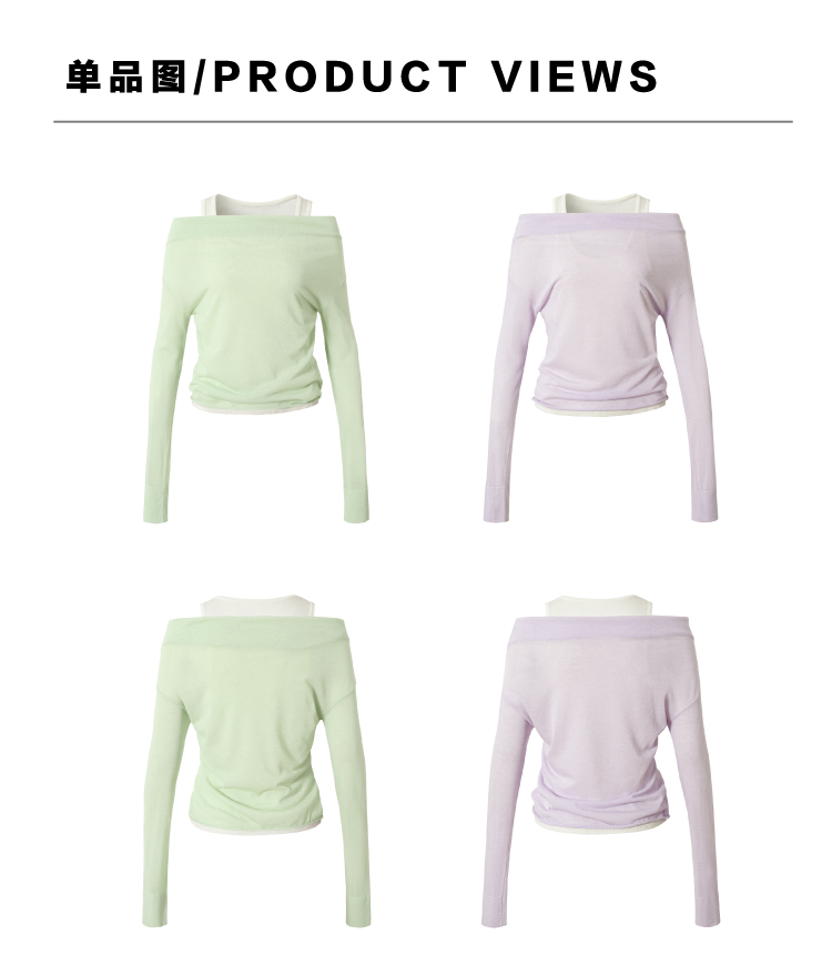 heris/H51105/空气感薄透针织 假两件露肩 天丝亚麻针织长袖上衣