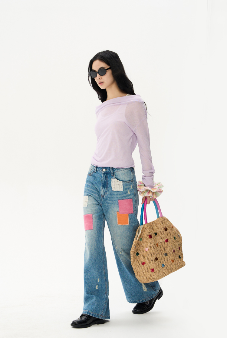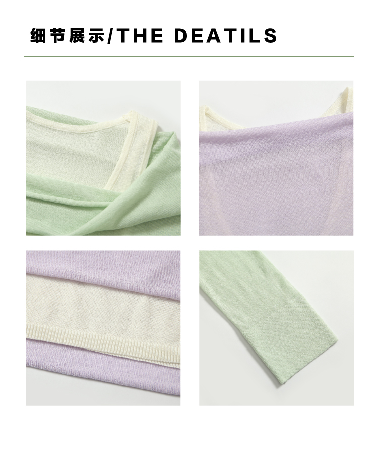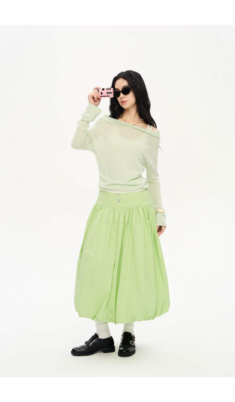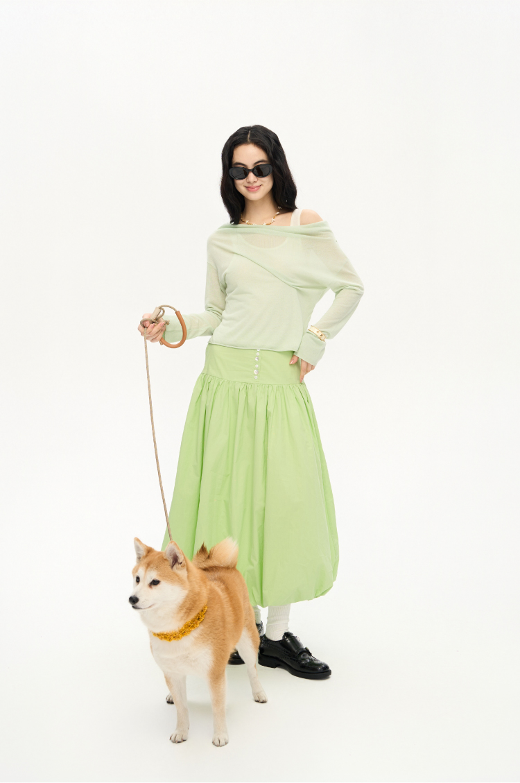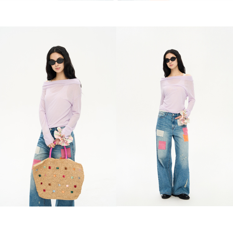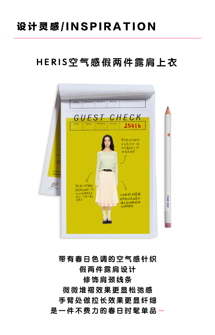 heris/H51105/空气感薄透针织 假两件露肩 天丝亚麻针织长袖上衣