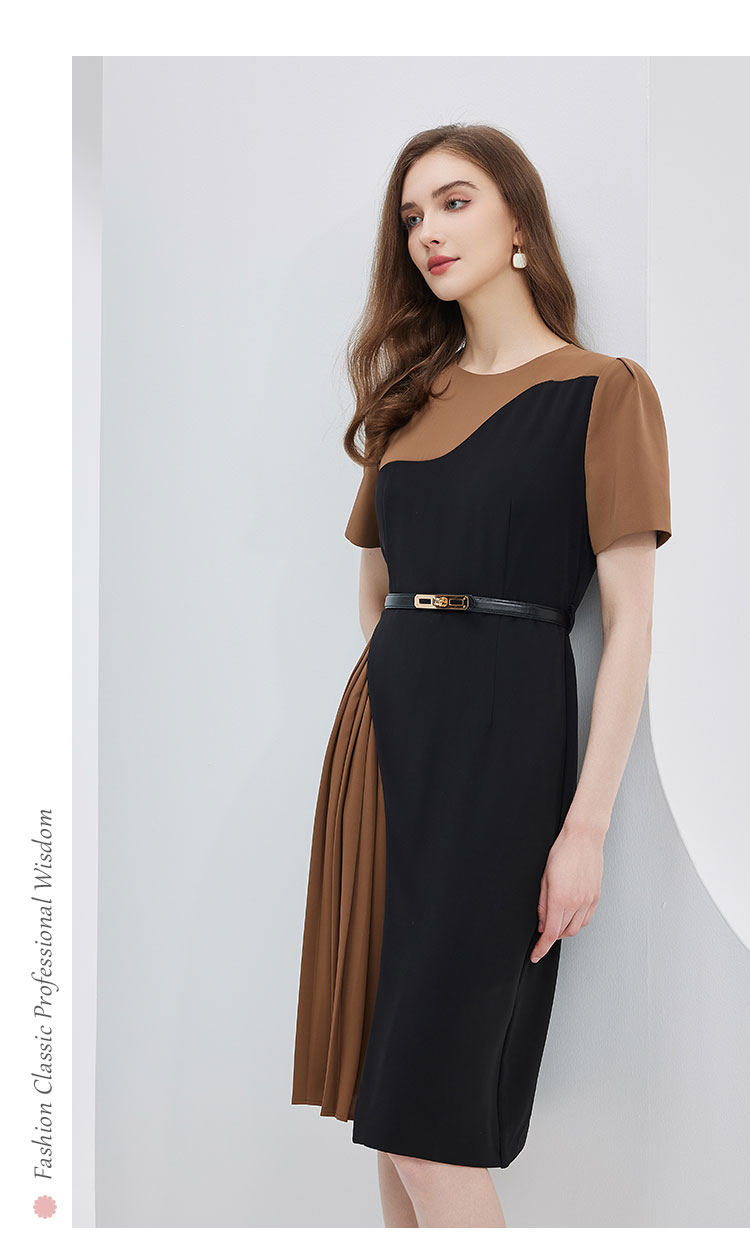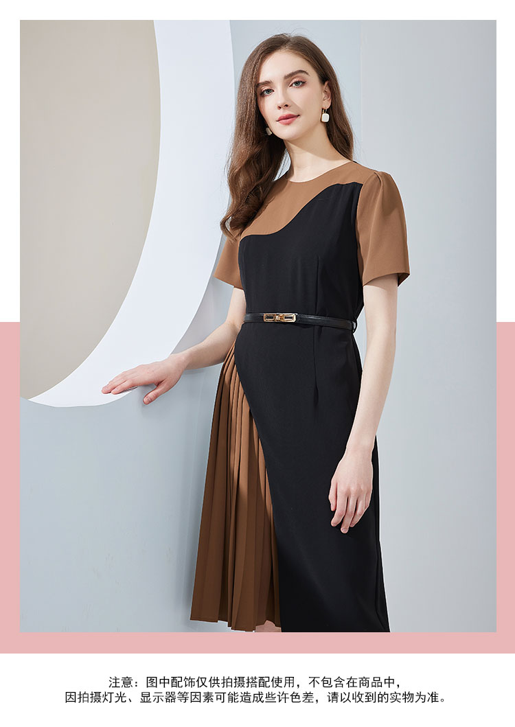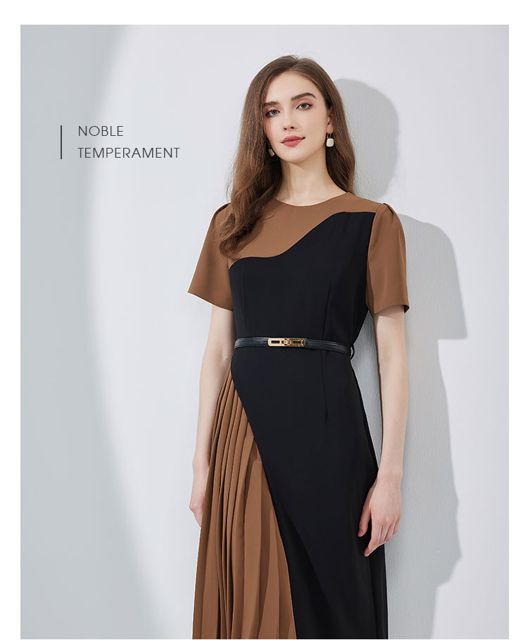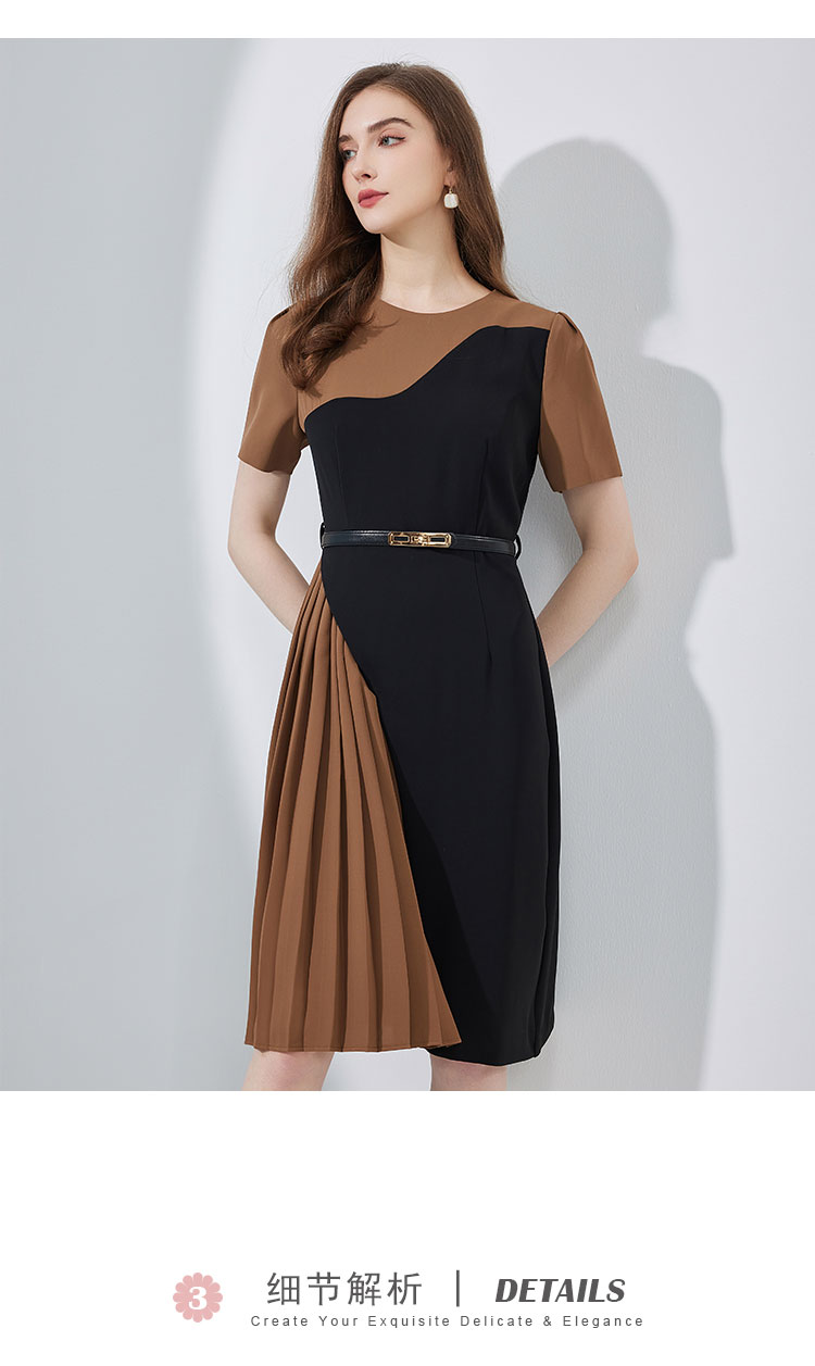NF863斯尔丽瑟俪2023夏季新款圆领高腰短袖设计感不规则撞色连衣裙