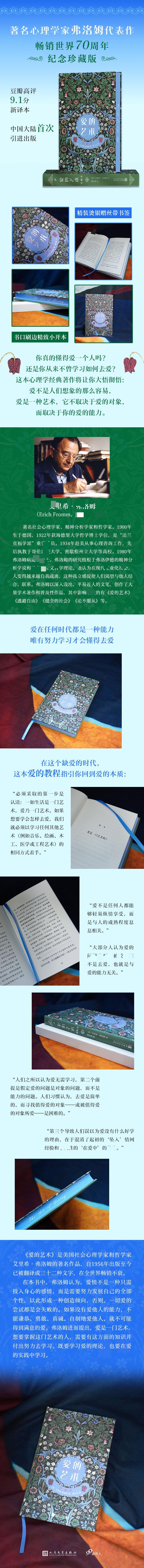 《爱的艺术》是美国社会心理学家和哲学家、法兰克福学派重要成员艾里希•弗洛姆的著名作品,自1956年出版至今已被翻译成三十二种文字,在全世界畅销不衰。在本书中,弗洛姆认为,爱情不是一种只需投入身心的感情,而是需要努力发展自己的全部个性,以此形成一种创造倾向,否则,一切爱的尝试都是会失败的。如果没有爱他人的能力,不能谦恭、勇敢、真诚、自制地爱他人,就不可能得到满意的爱。弗洛姆进而提出,爱是一门艺术,想要掌握这门艺术的人,需要有这方面的知识并付出努力去学习。既要学习爱的理论,也要在爱的实践中学习。