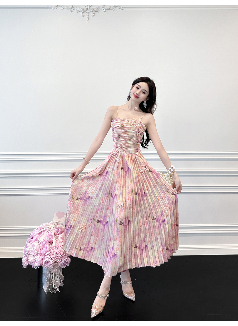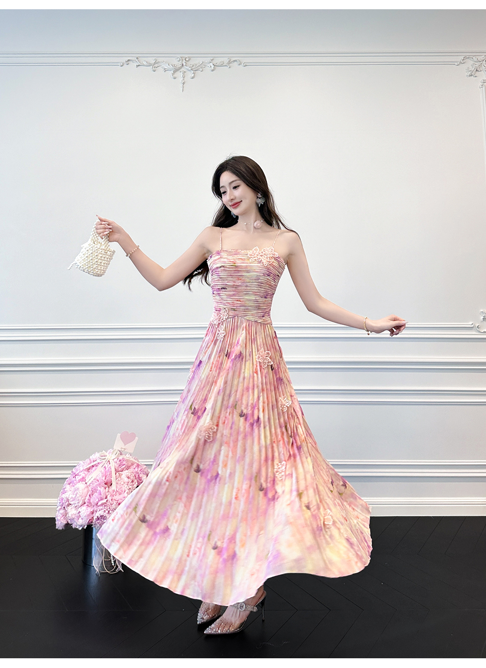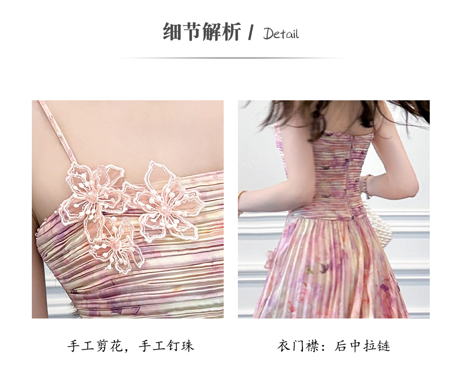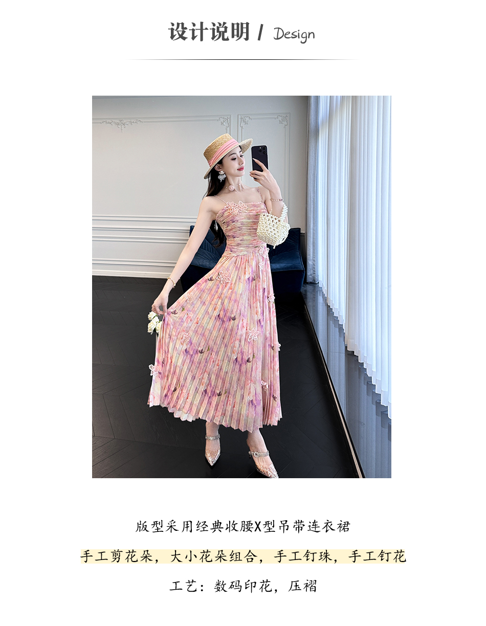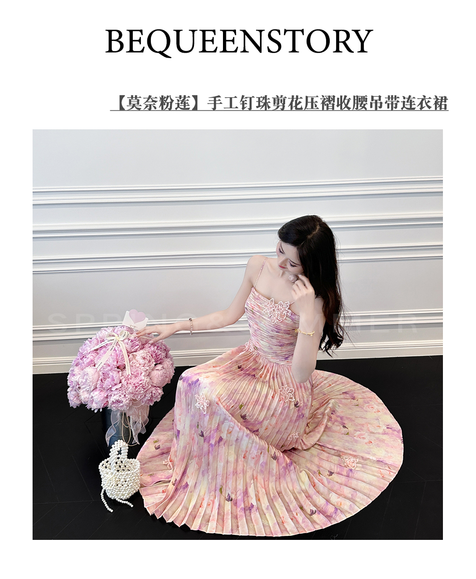 BeQueenStory【莫奈粉莲】高级感手工钉珠剪花压褶收腰吊带连衣裙