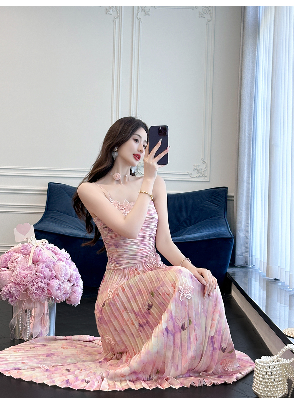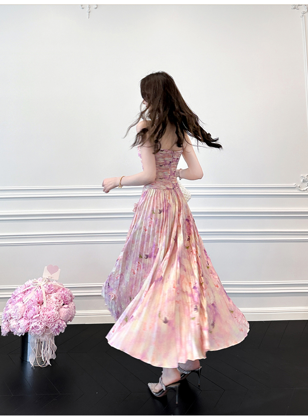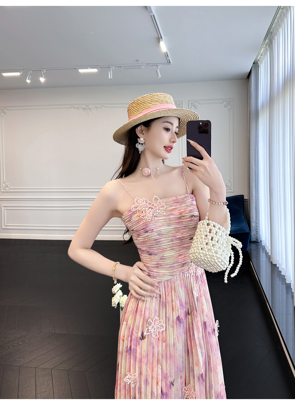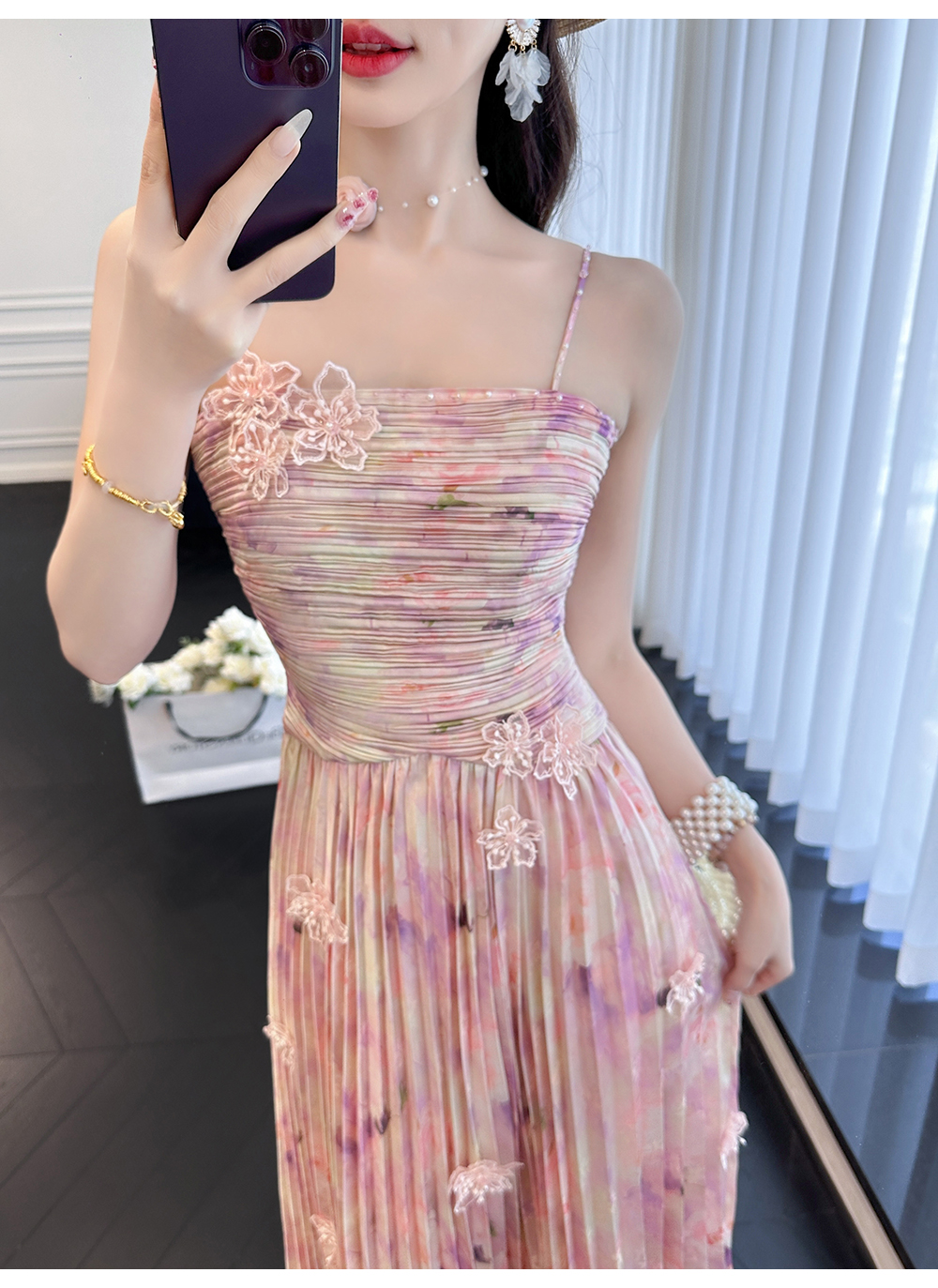 BeQueenStory【莫奈粉莲】高级感手工钉珠剪花压褶收腰吊带连衣裙