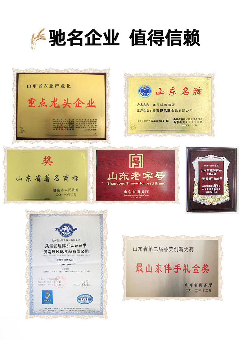 - 济南野风酥食品有限公司是一家从事绿色无公害农产品深加工,生产山东特产食品的企业。职工总人数586人,其中高中级技术人员56人。2007年济南野风酥食品有限公司被山东省人民政府授予省级农业产业化经营重点龙头企业。我公司生产的糖酥煎饼等系列产品曾连续获农业部、山东省优质产品奖,被人民大会堂定为国宴用品。“九顶塔”牌商标获得“省优”“部优”商标称号。全国著名的营养学家于若木曾来厂视察并亲笔题词,姜春云、苏毅然等国家、省级领导先后来厂视察。“野风酥”被中国食品协会评为“优秀民族食品”,获得“中华名吃”称号。产品连续获得国家级食品展销会的畅销产品奖,成为山东省的特色食品,省、市旅游局的十佳旅游商品。“山东煎饼”和“山东烧饼” 被认证为绿色食品。