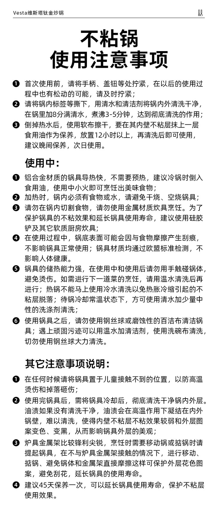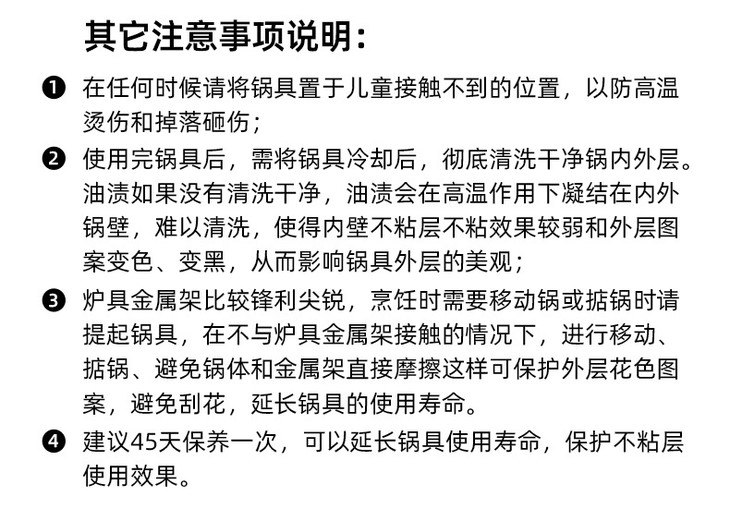 【日常保养】:用硅胶铲或者木铲使用,使用完记得及时清洗,拒绝空烧,干烧,拒绝烹饪比较硬尖锐的食品,不使用铁铲,感谢理解。