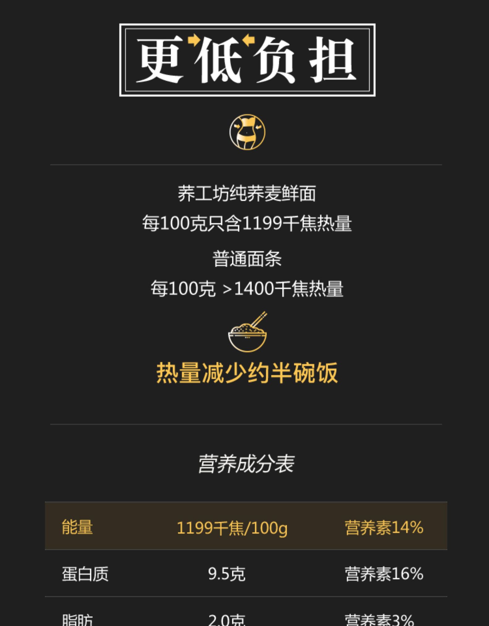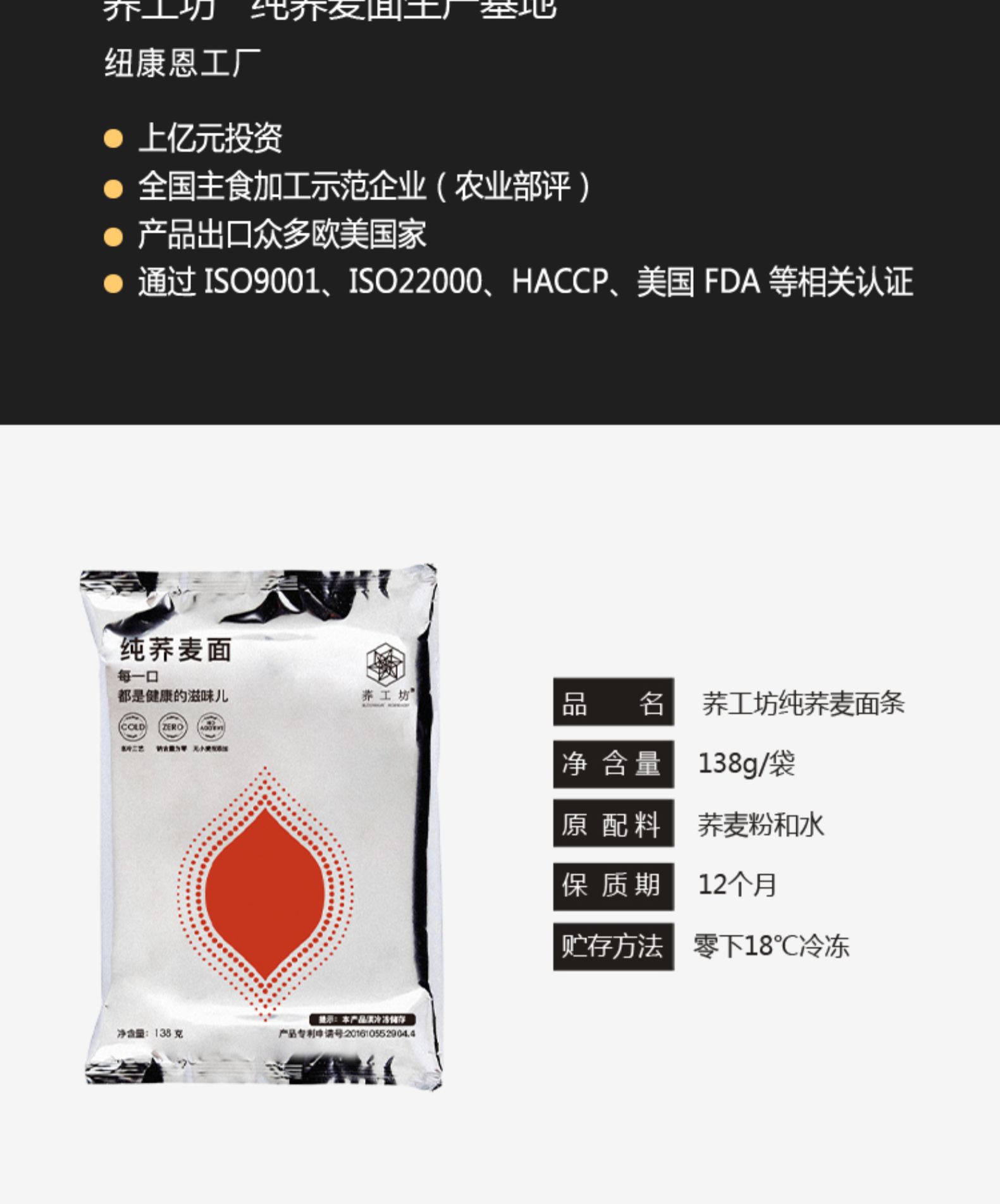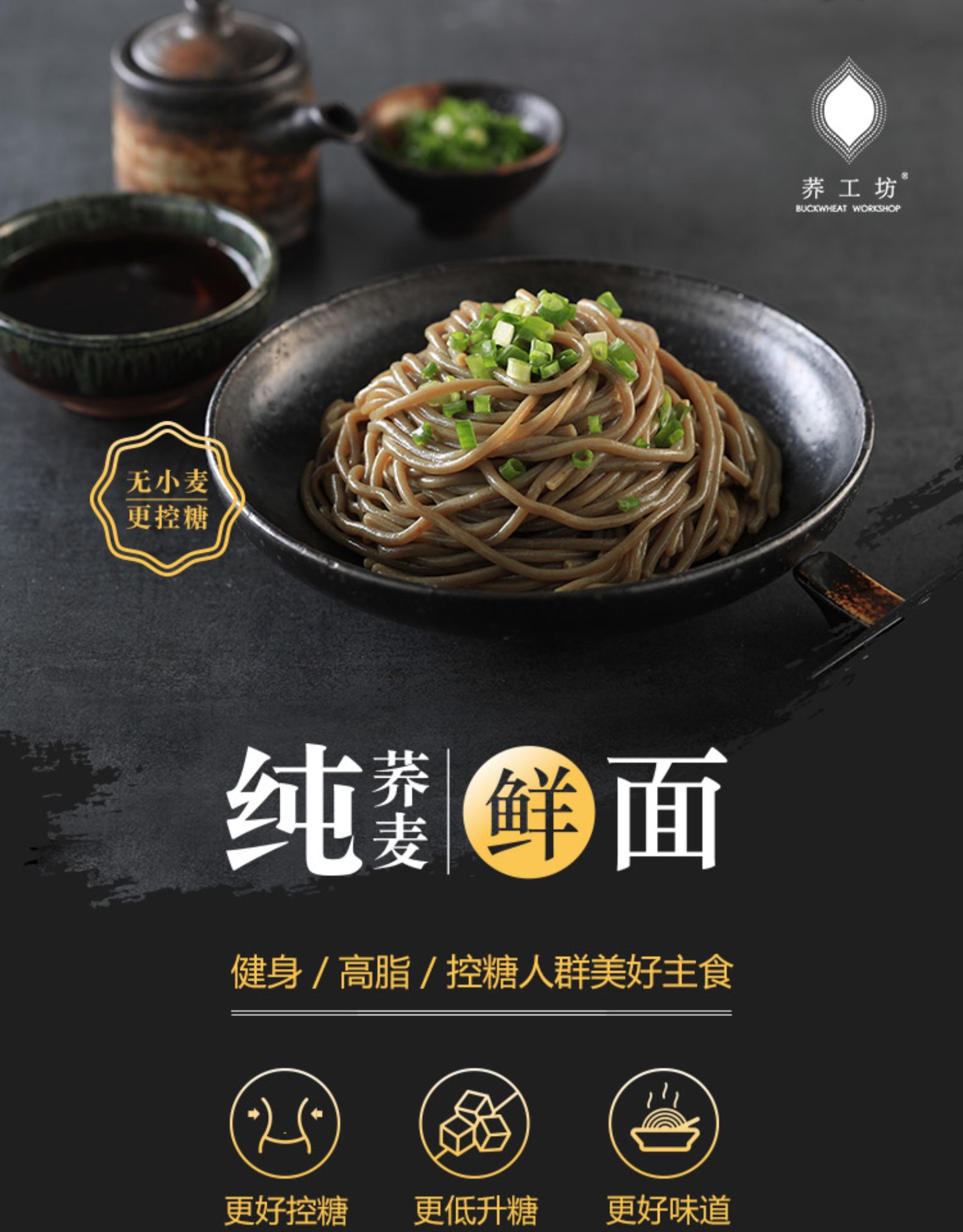 荞工坊纯荞麦面条138g/袋全麦乔麦无糖精芥麦面0盐低脂肪粗粮主食