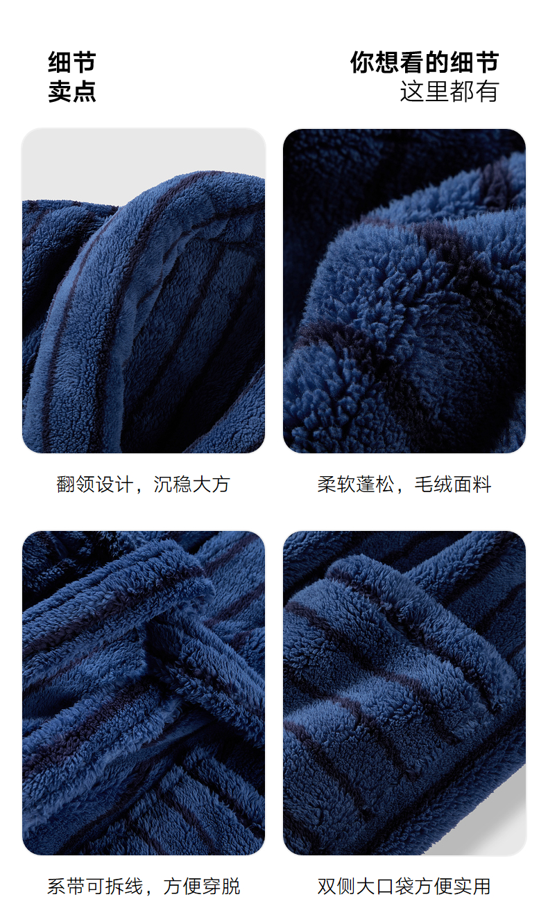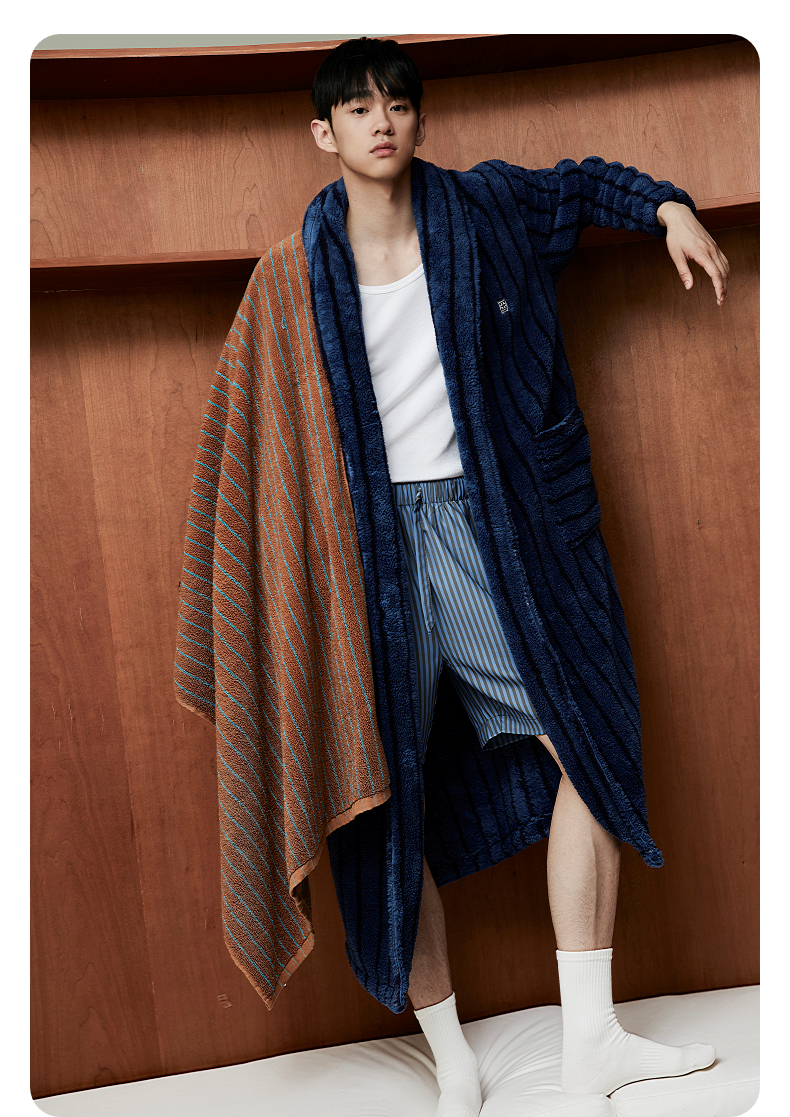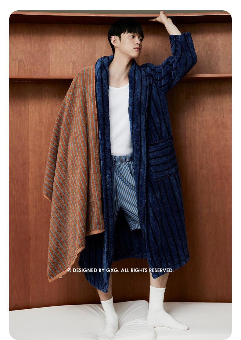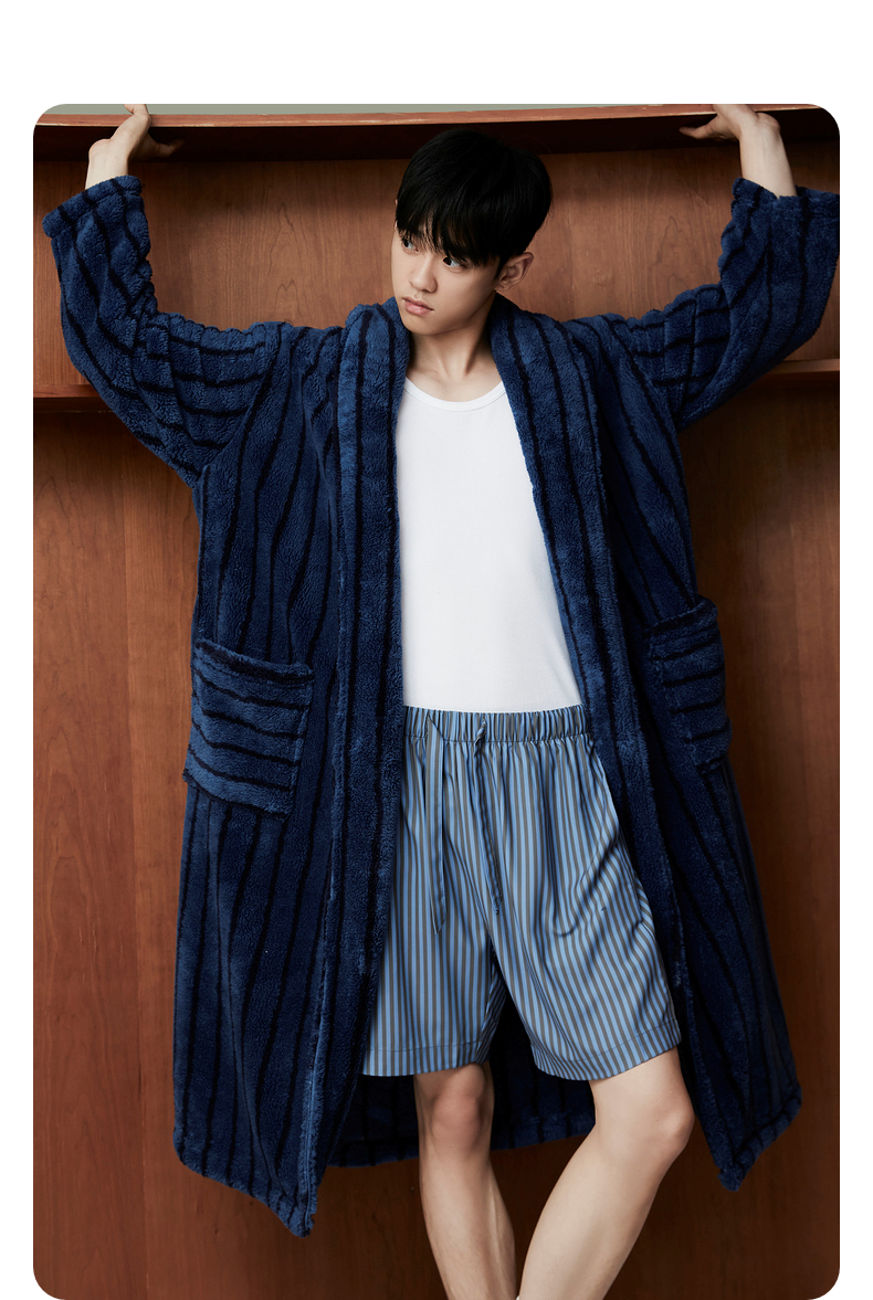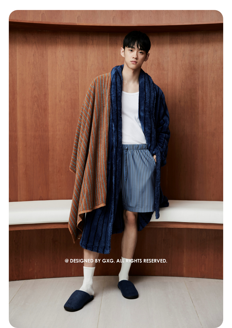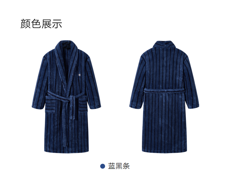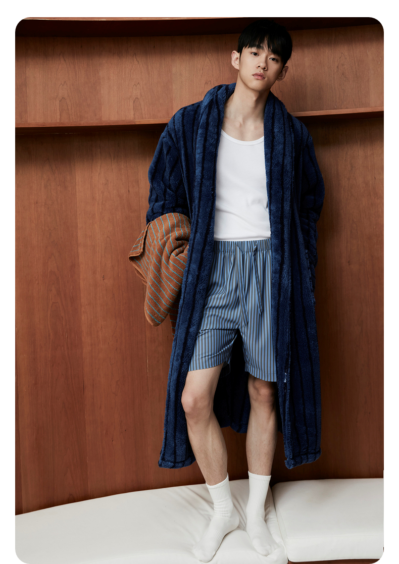 GXG男士家居服蓝黑条纹翻领睡袍加厚宽松家居上衣