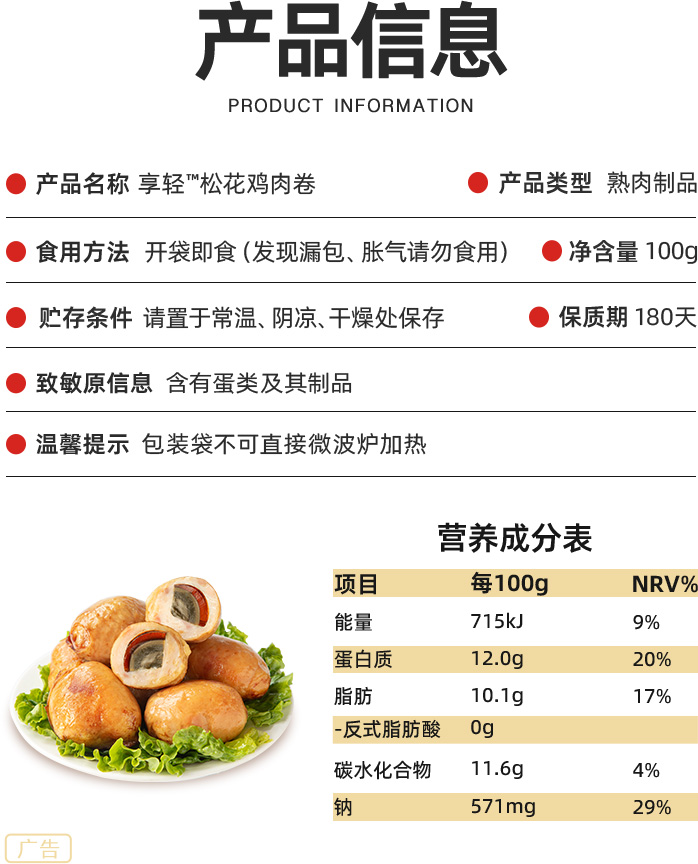【退酮过渡】【生酮不可】享轻™松花鸡肉卷100g/袋