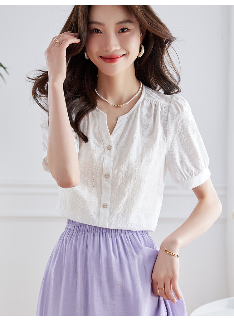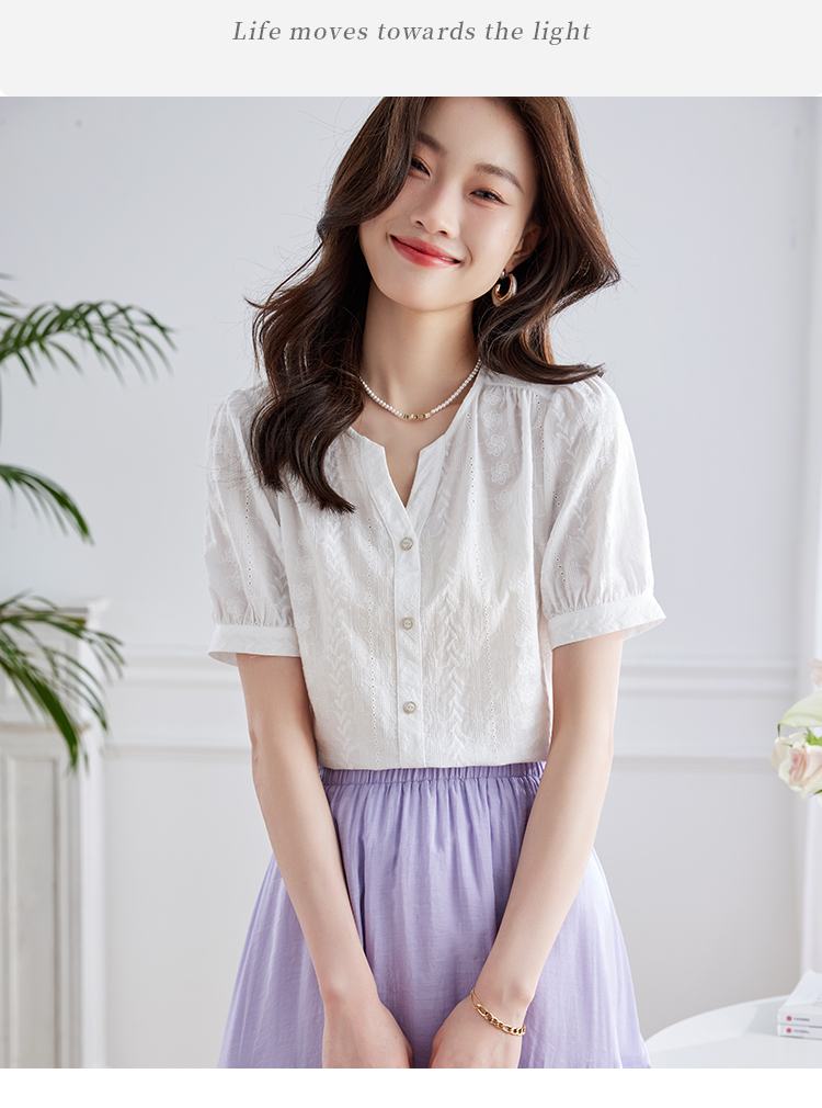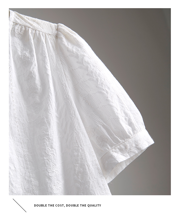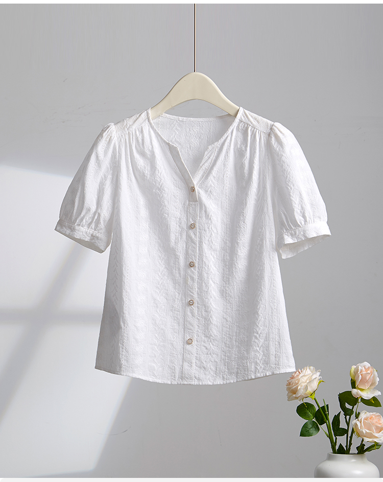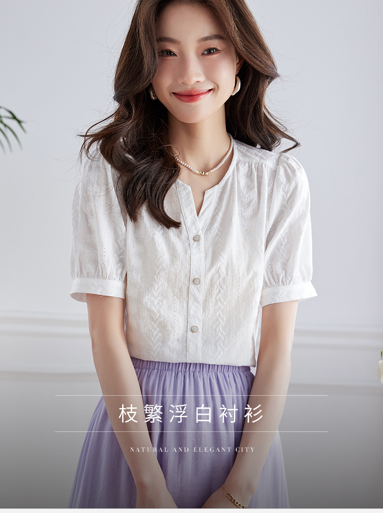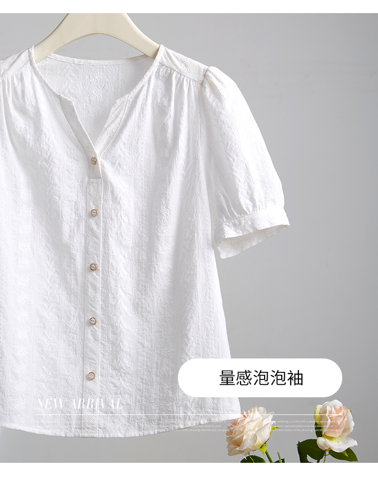 【断码清仓】熙世界法式刺绣纯棉白衬衫女时尚洋气小衫泡泡袖上衣2024夏季新款