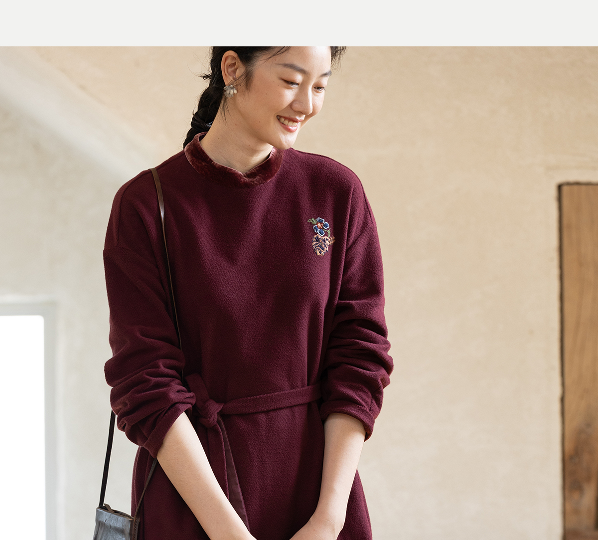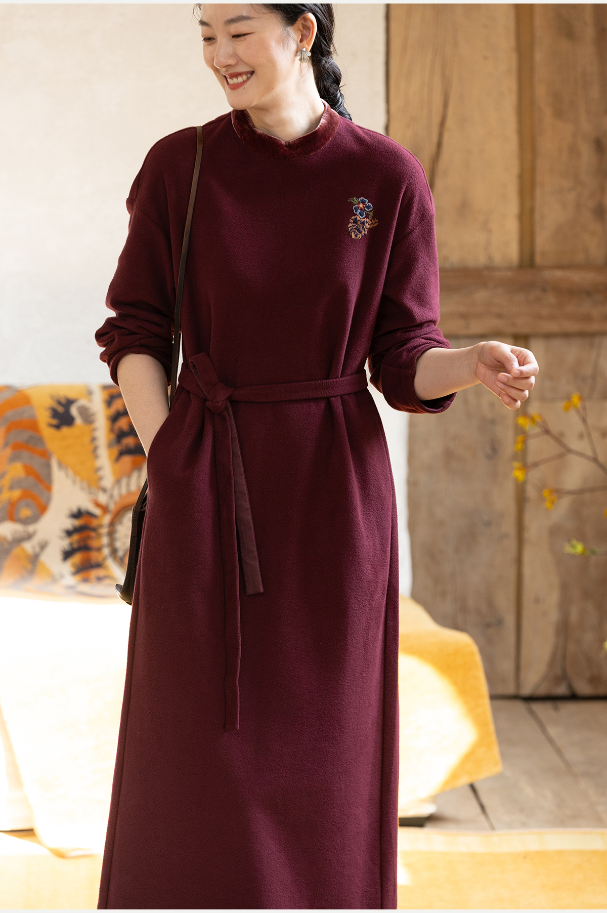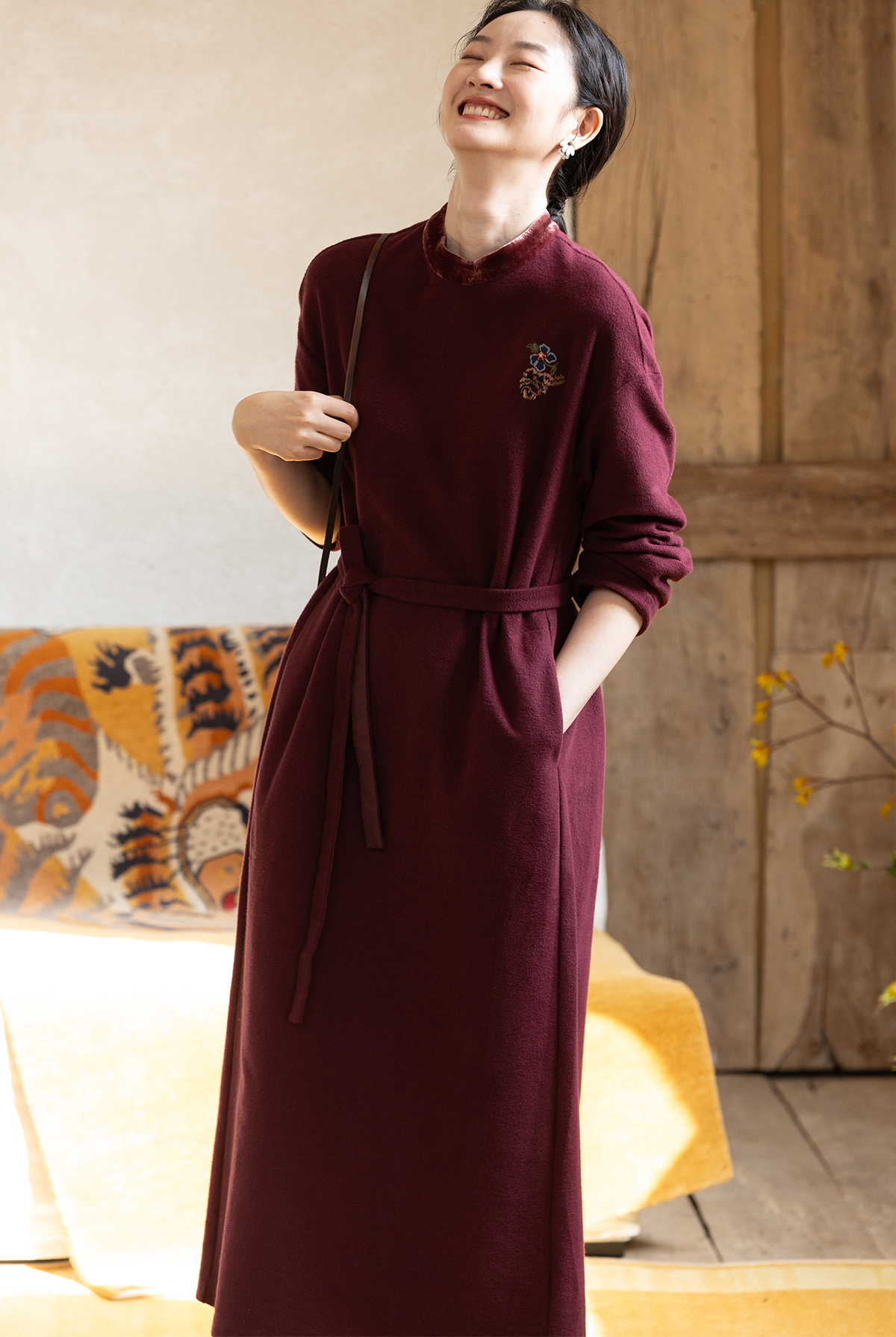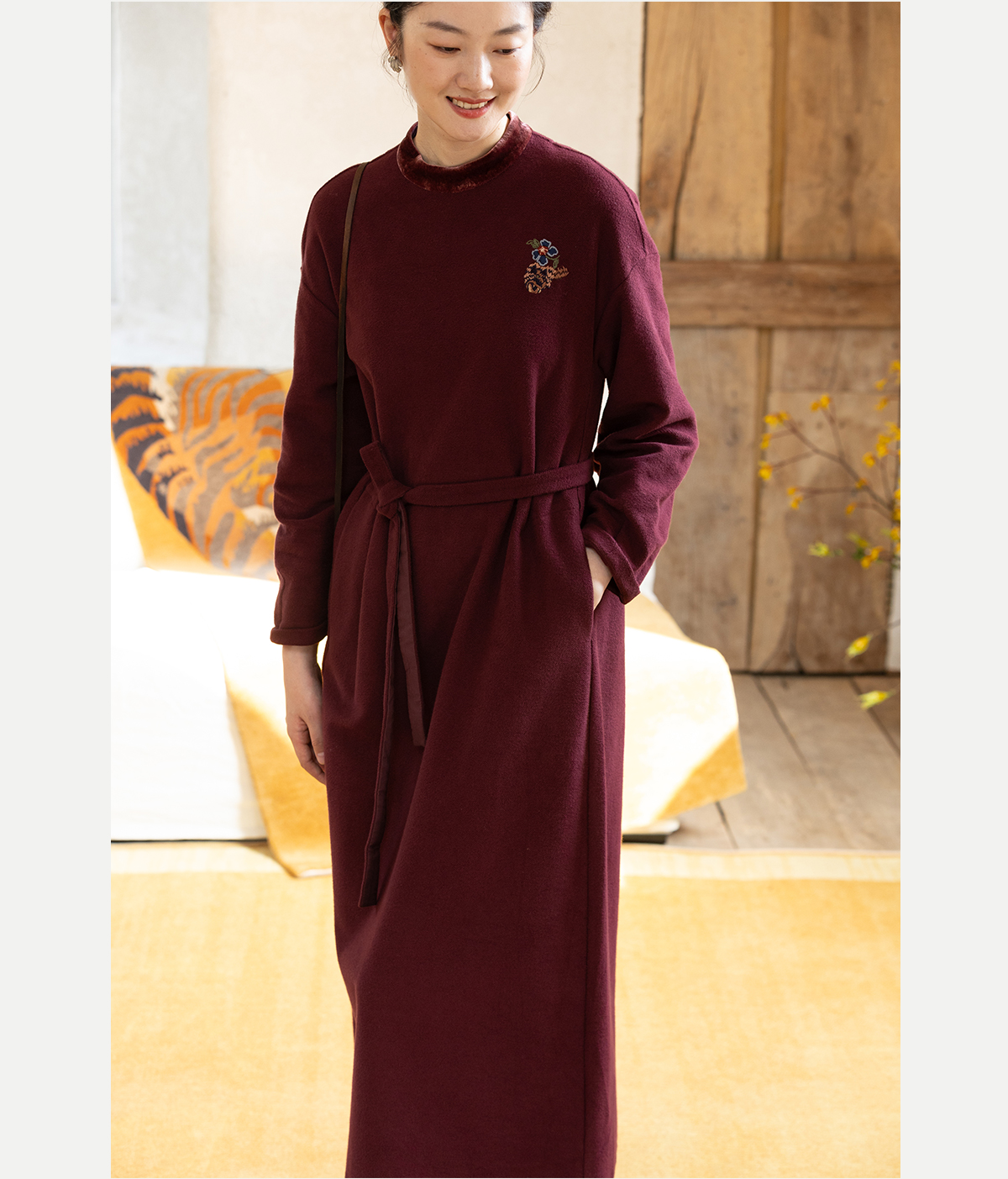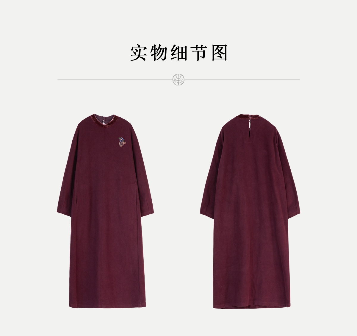 牧衣游原创 手工刺绣纯棉连衣裙冬新款宽松舒适柔软红色长裙 茶韵