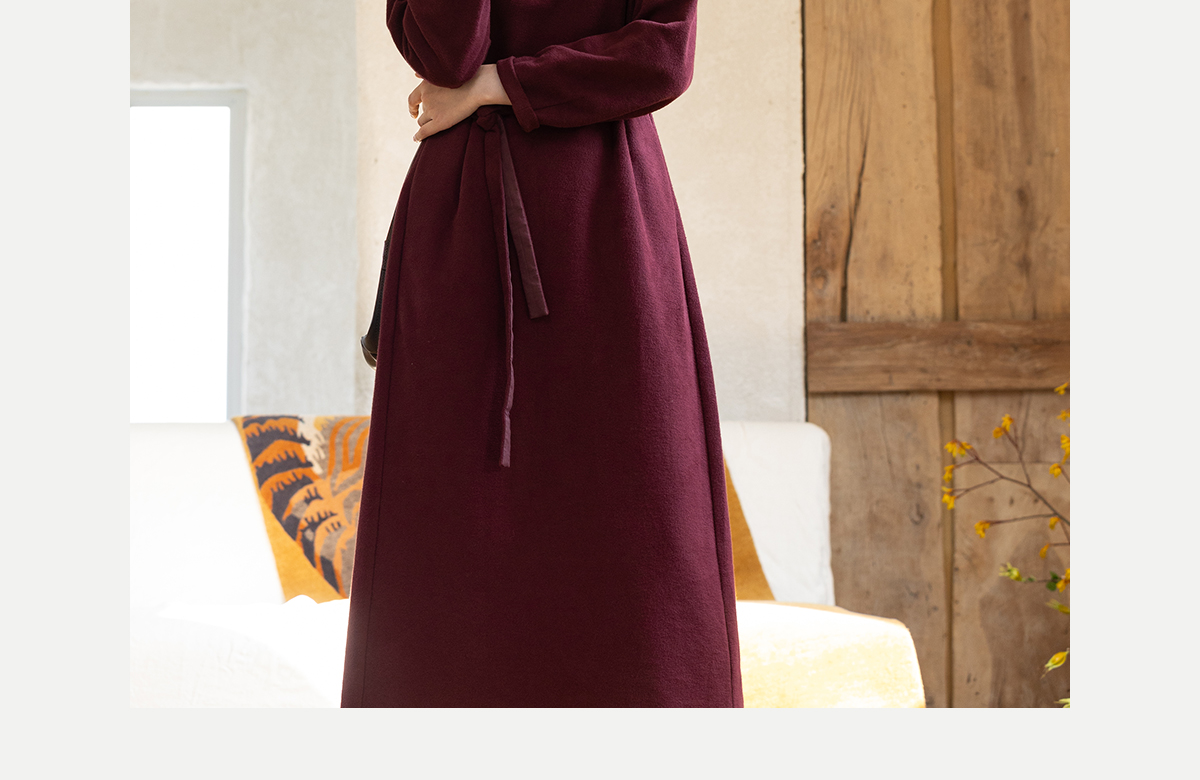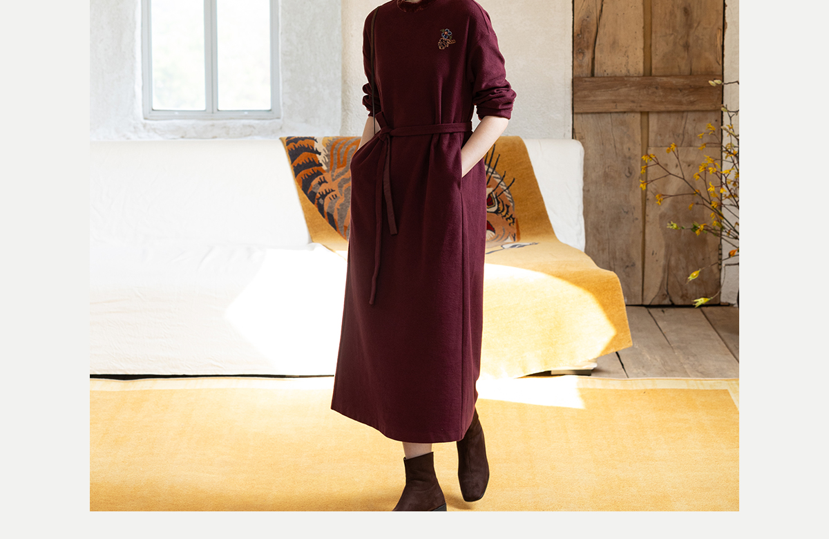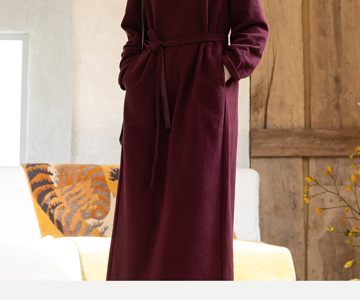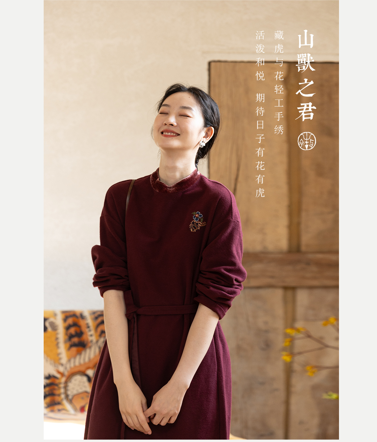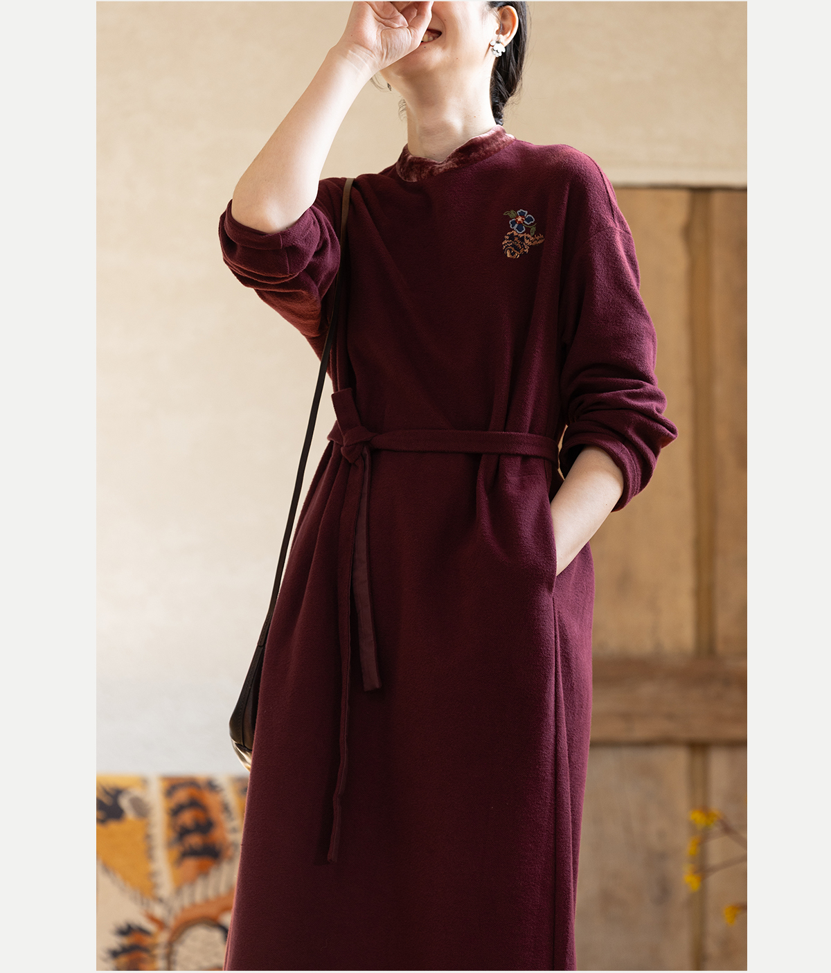 牧衣游原创 手工刺绣纯棉连衣裙冬新款宽松舒适柔软红色长裙 茶韵