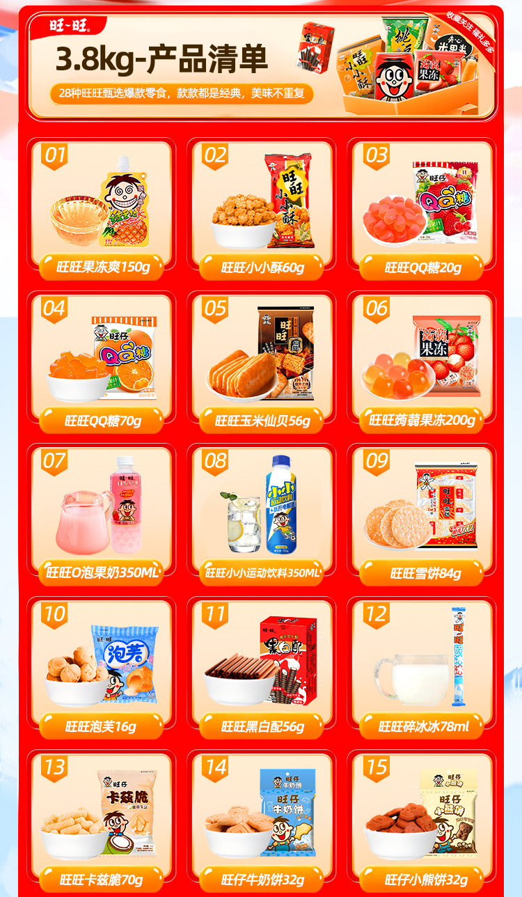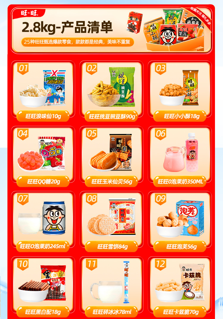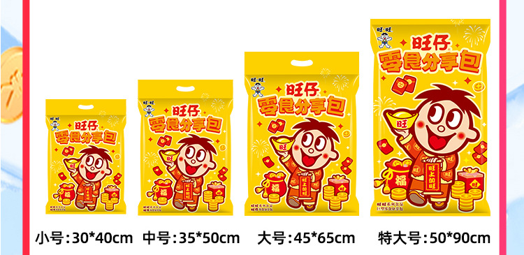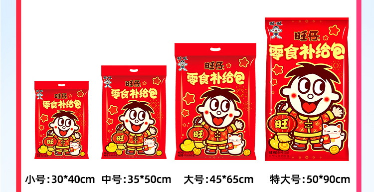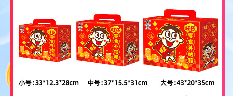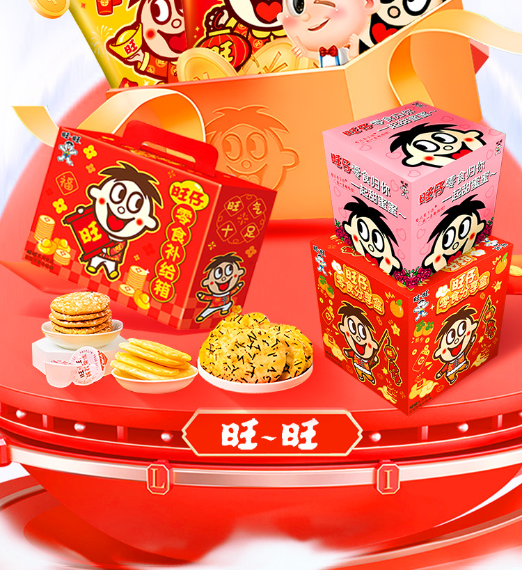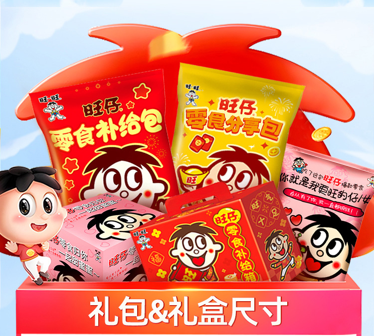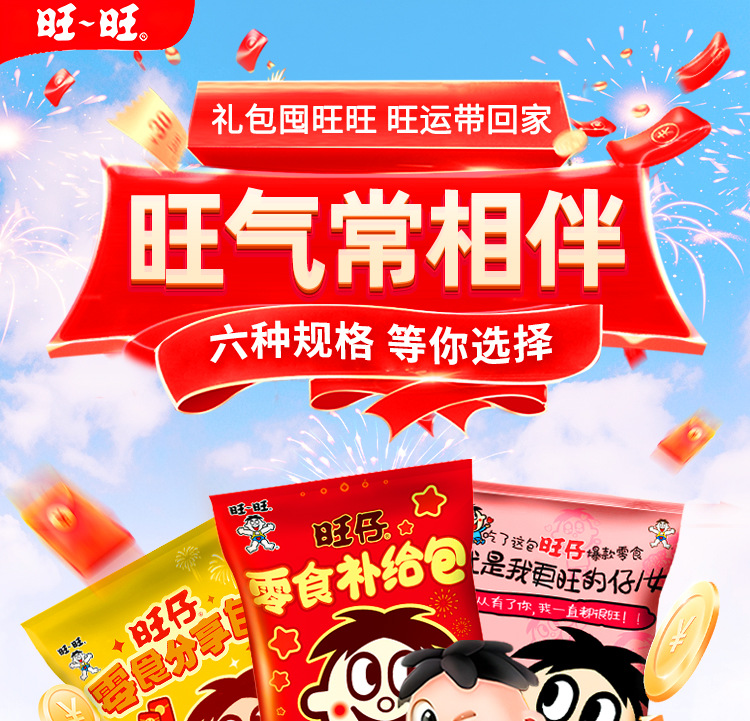 【情感传达,年味十足】新年旺气大飞越,超巨零食伴你过。牛奶雪饼甜心意,旺旺巨型零食大礼包521g,旺仔牛奶雪饼休闲小吃,超值巨型零食大礼包,520过年送女友必备!乐享无价爱的礼盒。