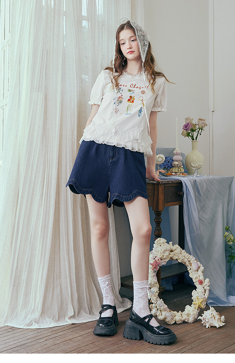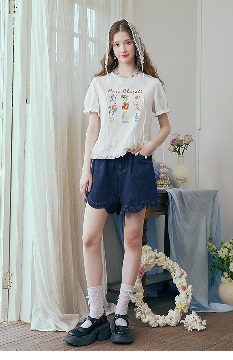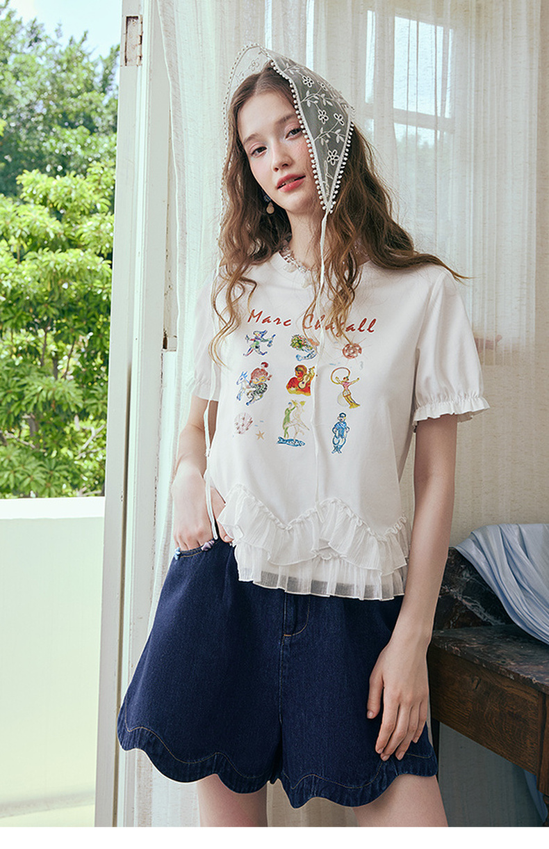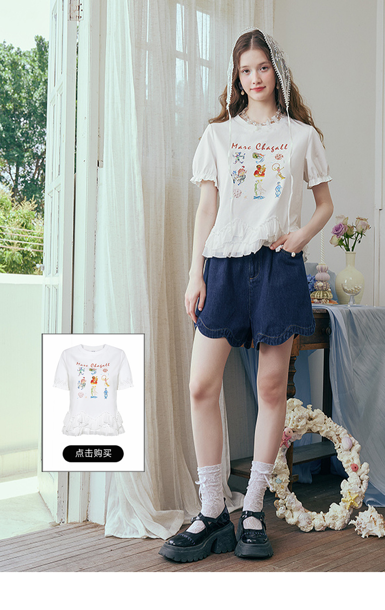 两三事梵高艺术花也谈情夏季压褶拼接印花两面穿雪纺衫女