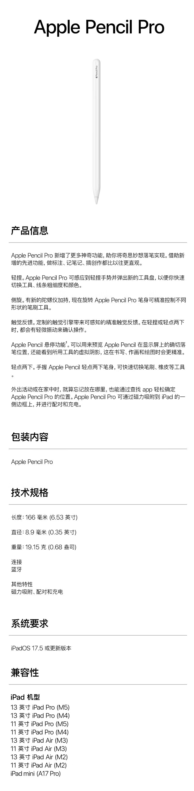 Apple/苹果 Pencil Pro 磁吸触控笔手写笔苹果笔电容笔书写绘画ipad笔 适用于iPad mini/Pro/Air