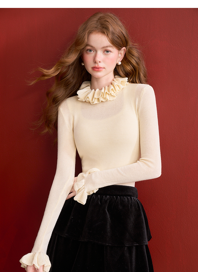 西遇法式高领打底毛衣女2024年冬季新款软糯杏色慵懒风修身针织衫D0044139