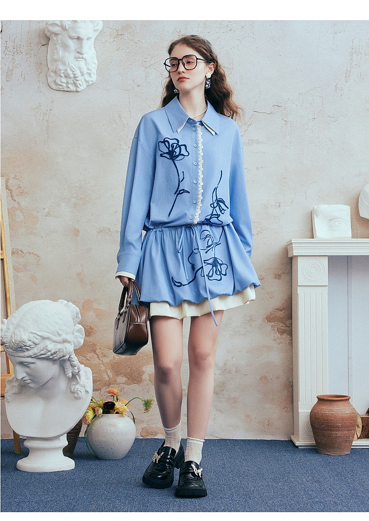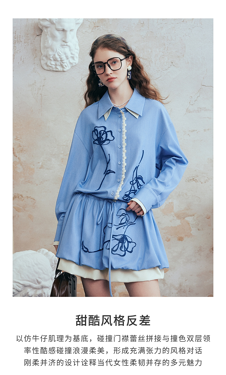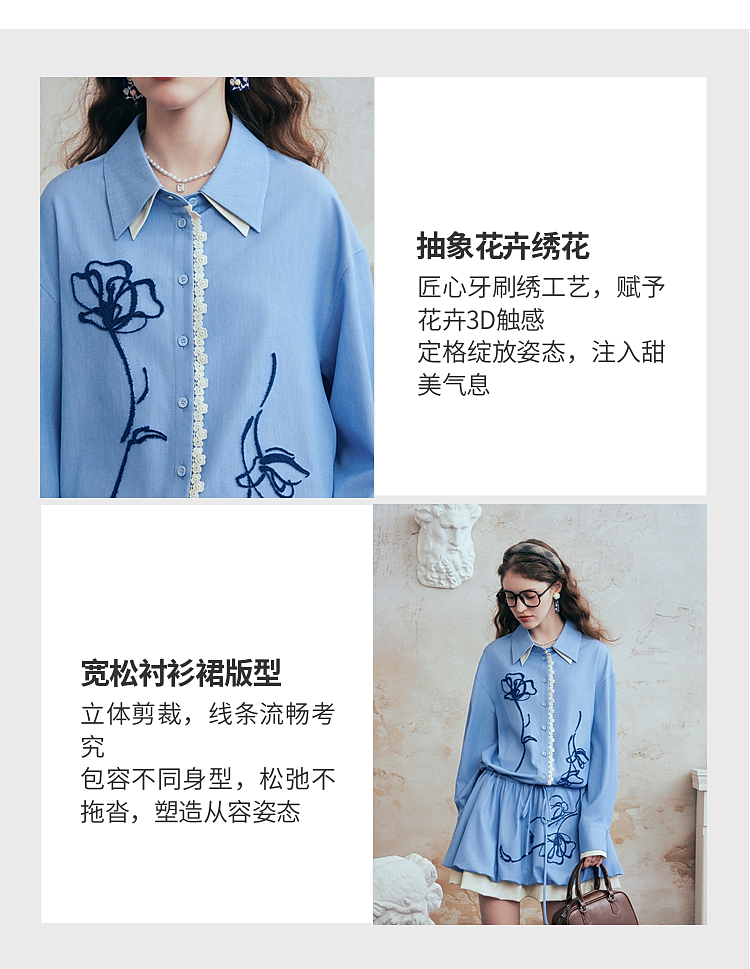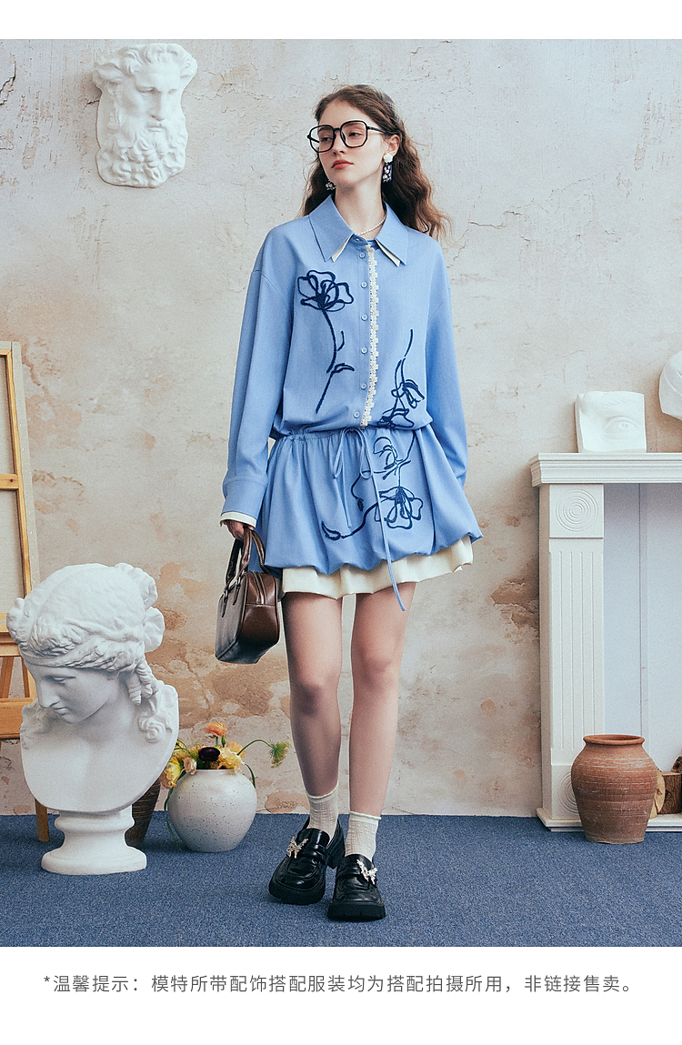 两三事 椿染兰山 2026春季新款拼色绣花抽绳绑带衬衫裙短款连衣裙