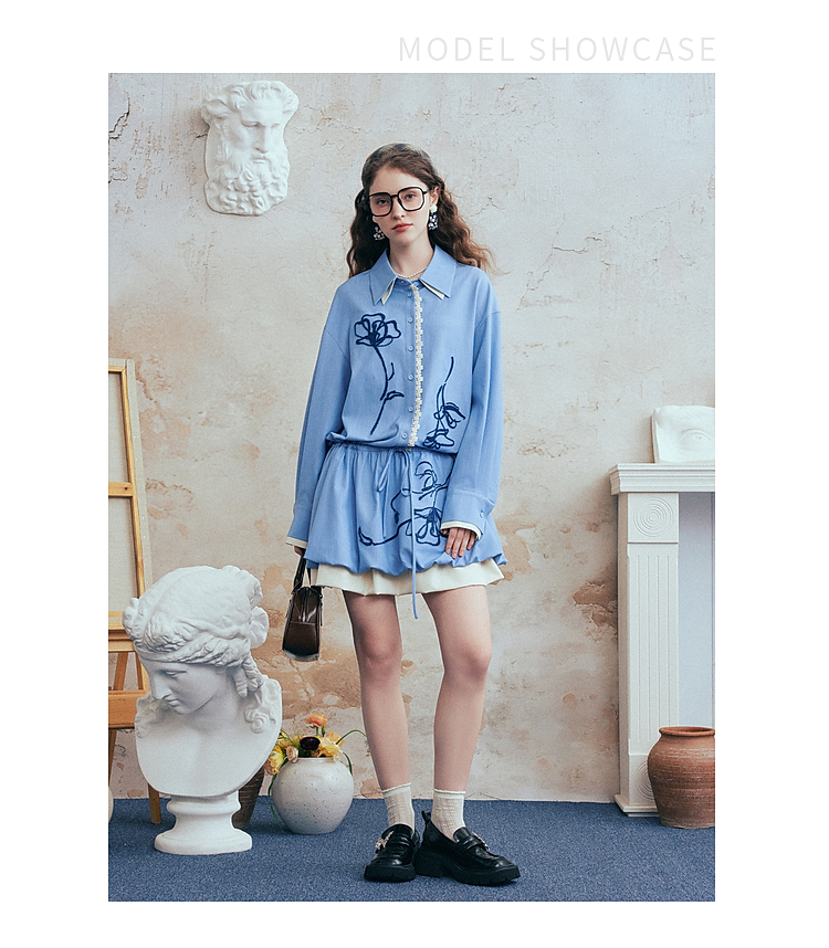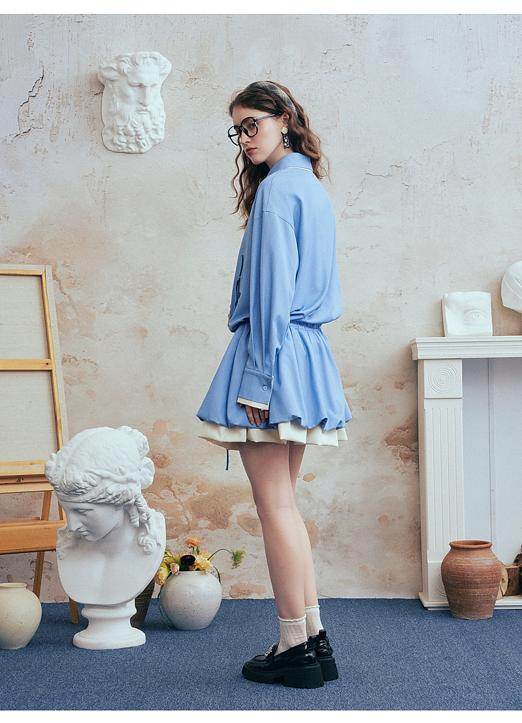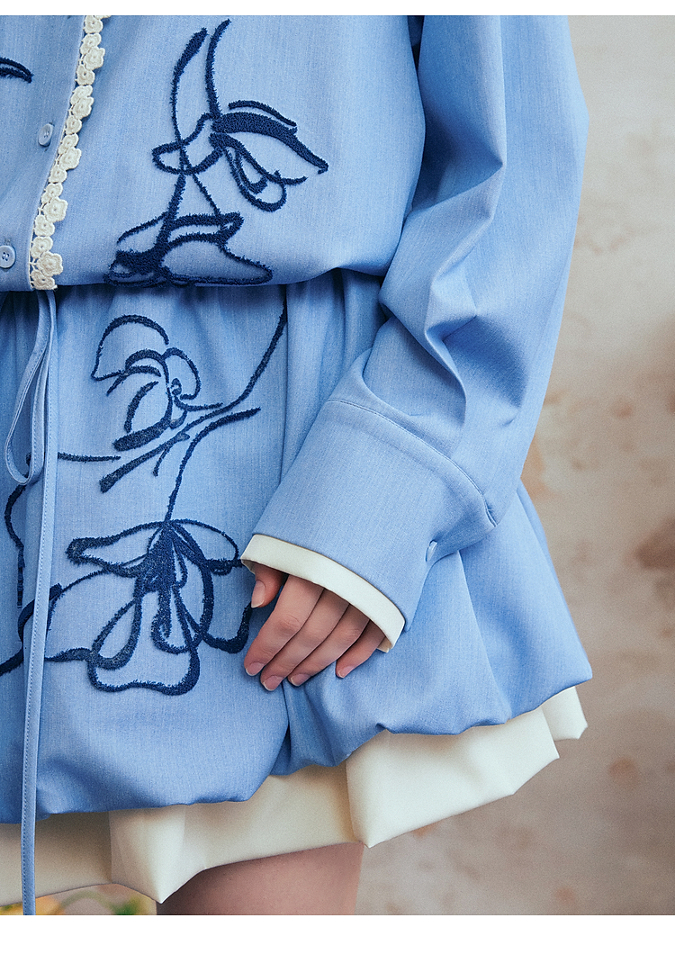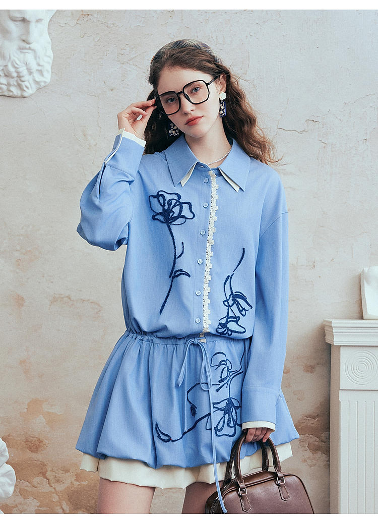 两三事 椿染兰山 2026春季新款拼色绣花抽绳绑带衬衫裙短款连衣裙