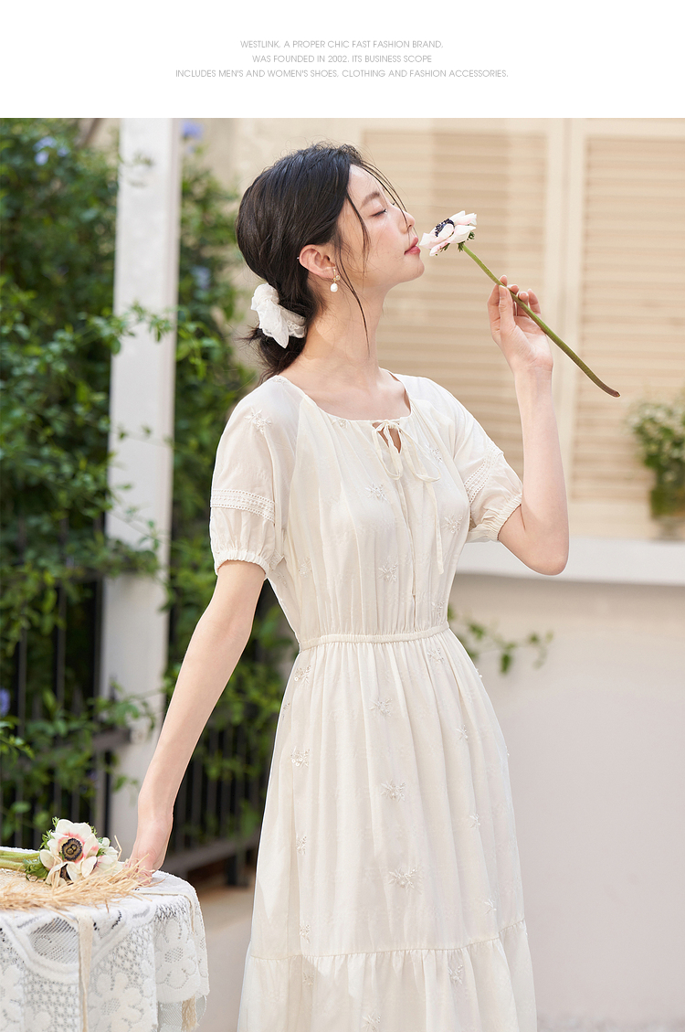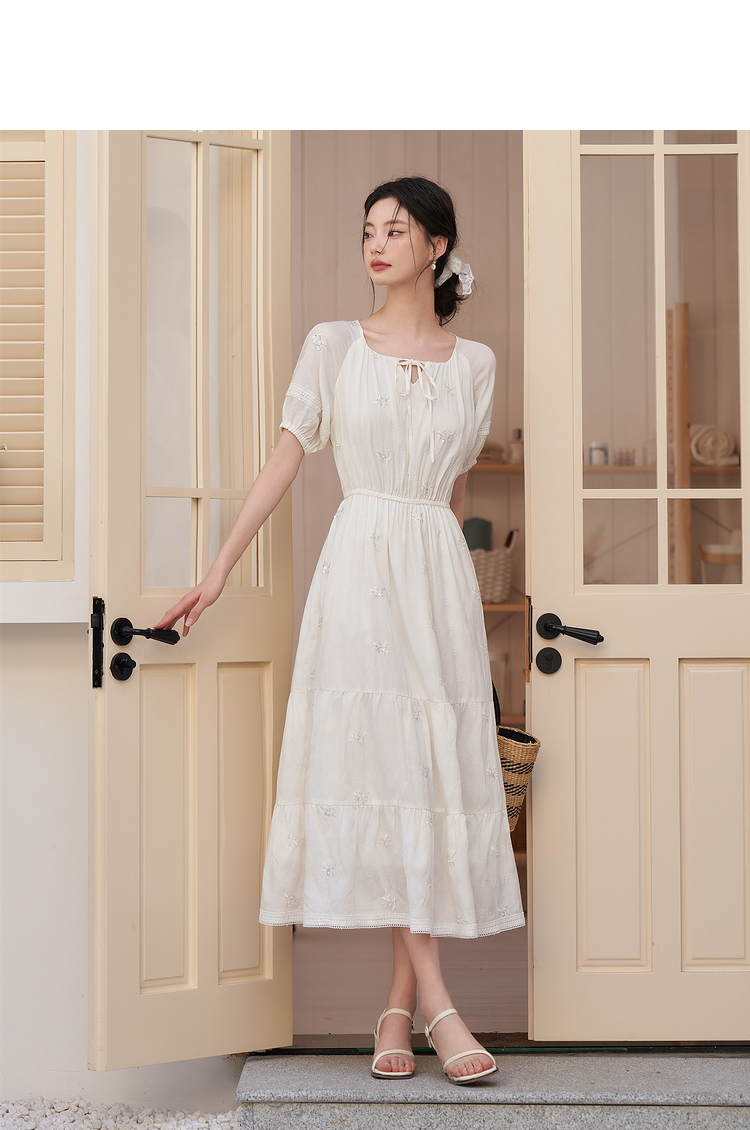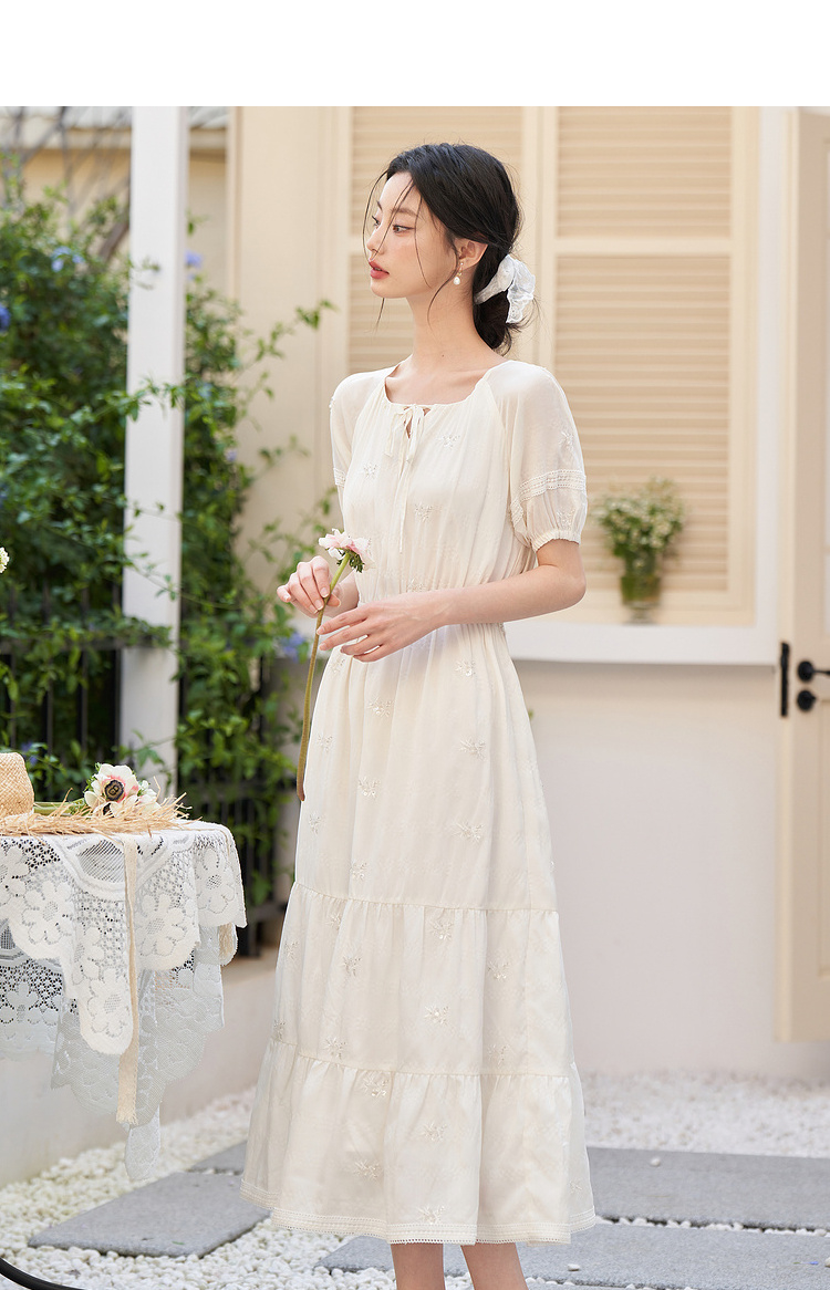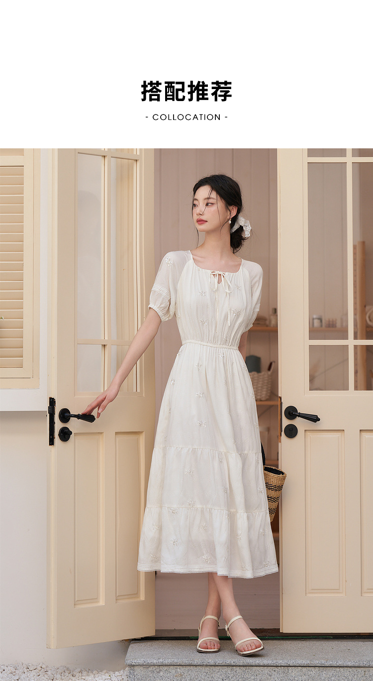 温柔文艺连衣裙女春夏季圆领系带收腰肌理珠片中长连衣裙V1040766