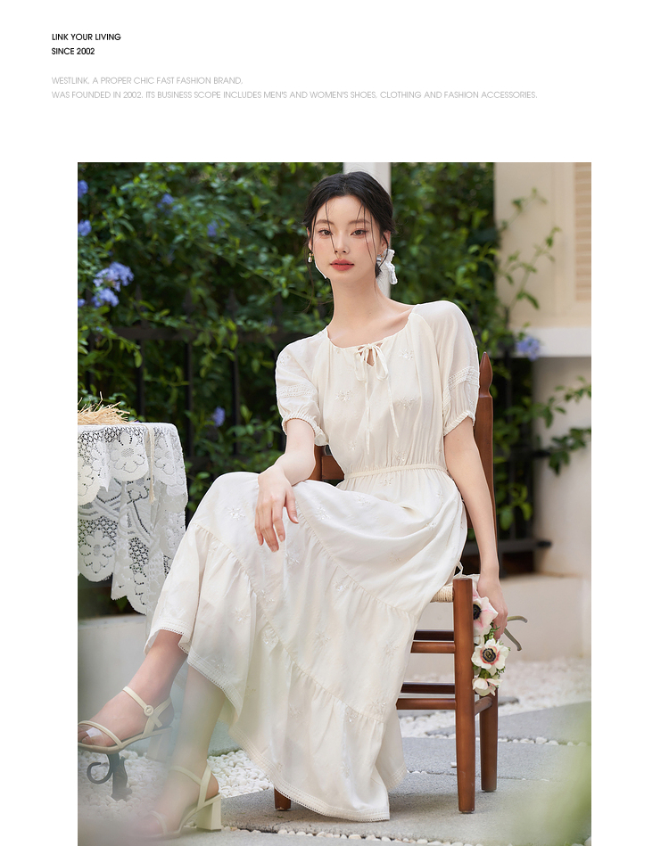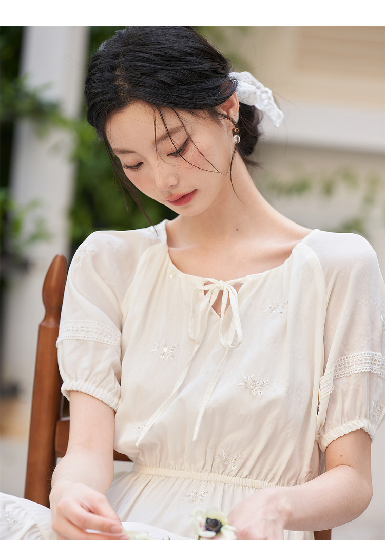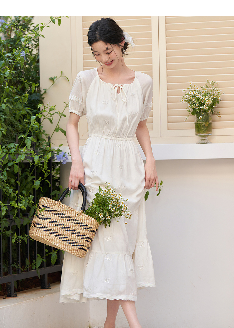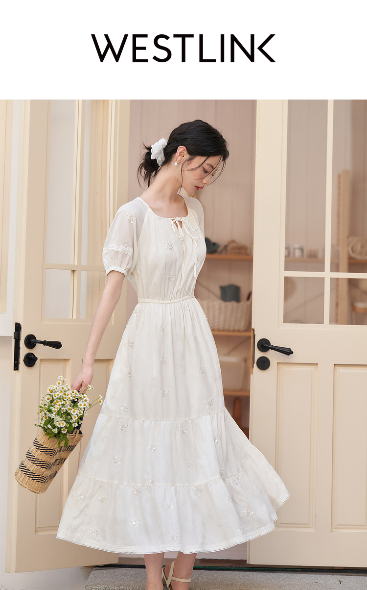 温柔文艺连衣裙女春夏季圆领系带收腰肌理珠片中长连衣裙V1040766