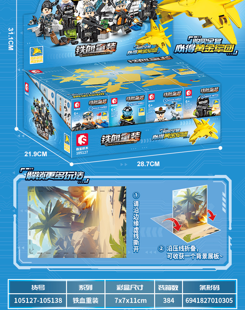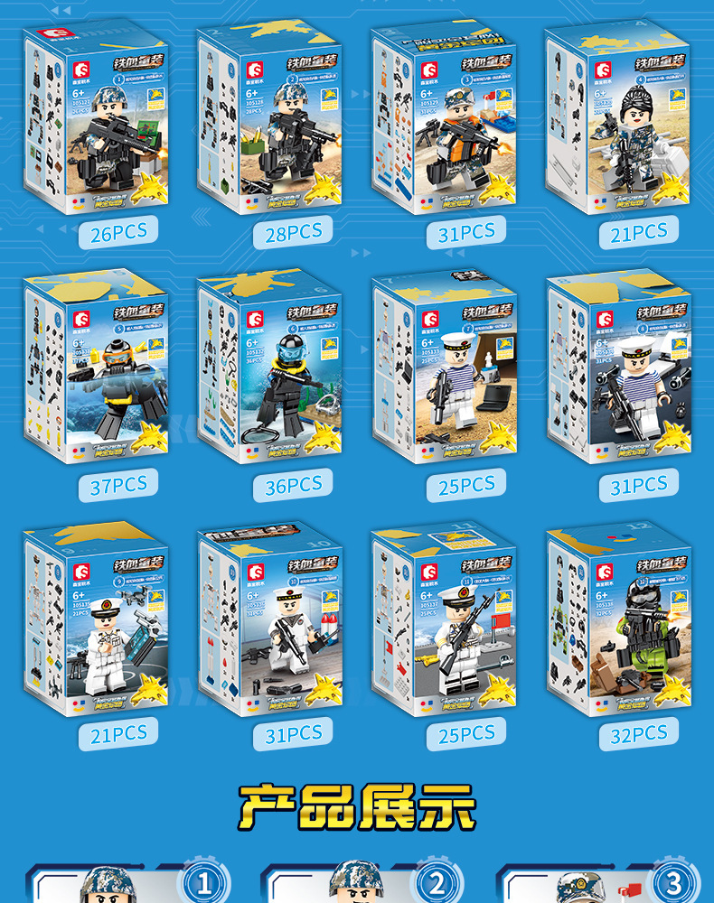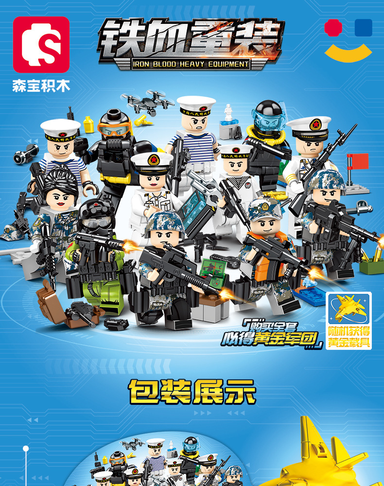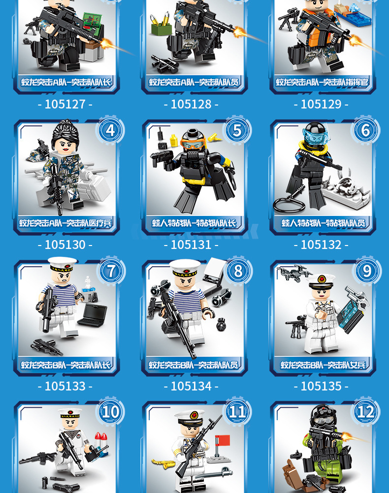森宝军事海军蛟龙突击队儿童益智拼装人仔模型积木玩具105127-105138(款式随机)